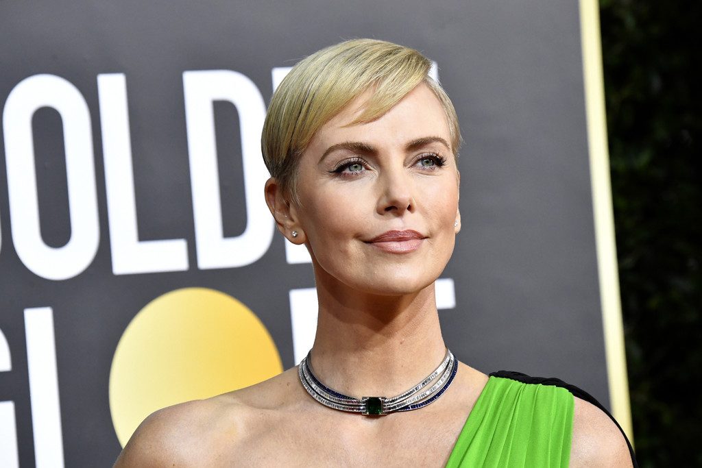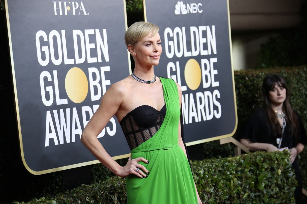 Charlize Theron déclare que Bombshell (2019) prouve que #MeToo est une question bipartite alors qu’elle marche sur le tapis rouge des Golden Globes à Beverly Hills, le 01/05/2020. Grâce à son rôle dans le film Bombshell (2019), dans lequel elle incarne l’ancienne animatrice de Fox News Megyn Kelly, l’actrice est nominée pour le prix de la meilleure actrice dans un drame.