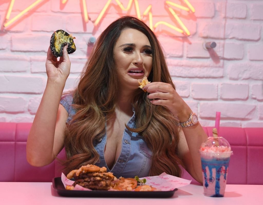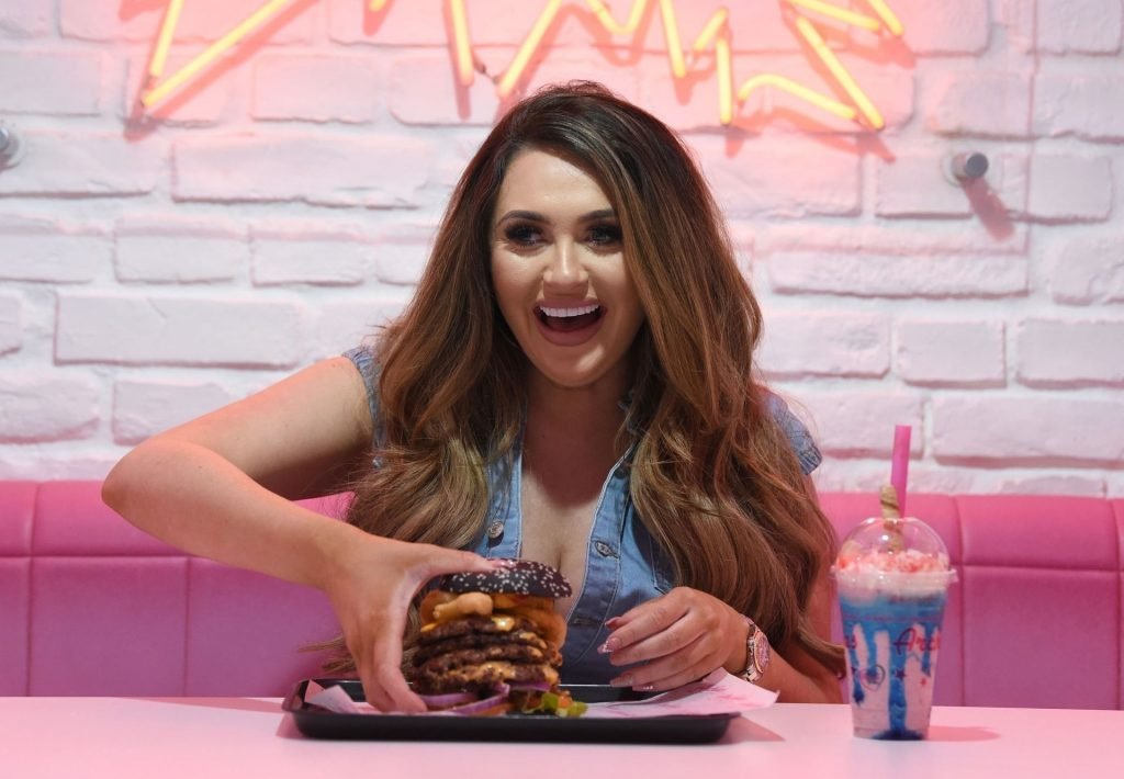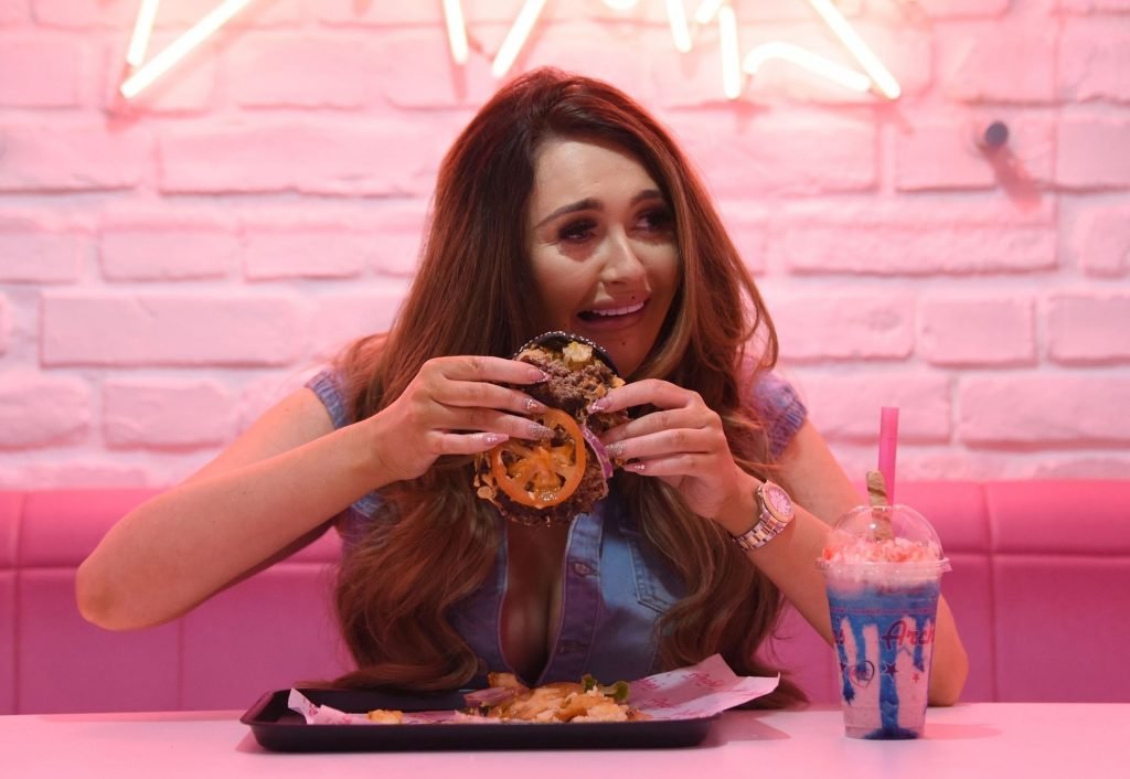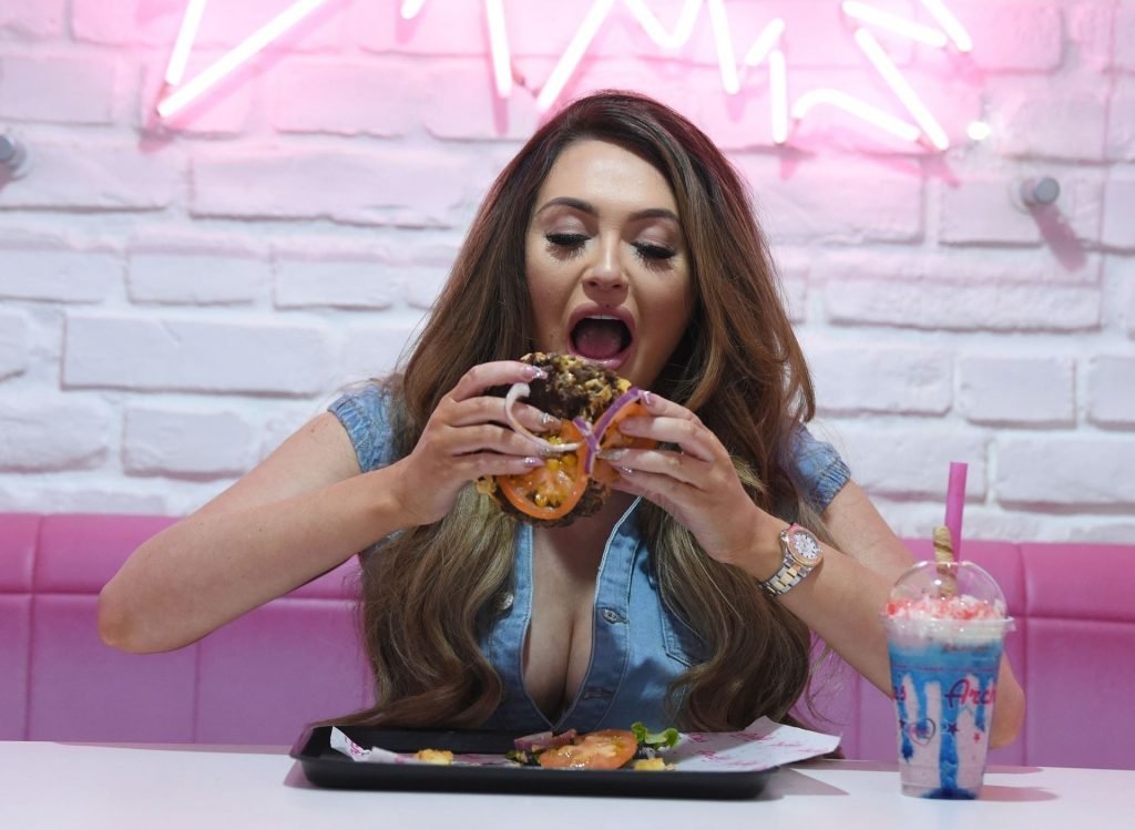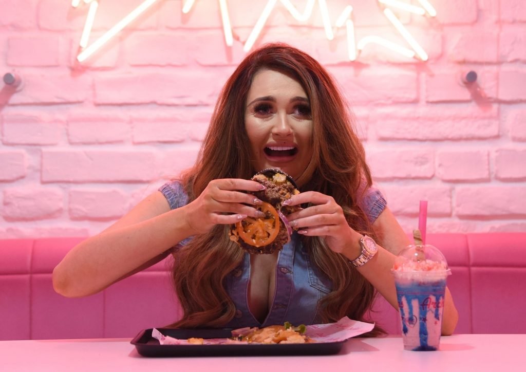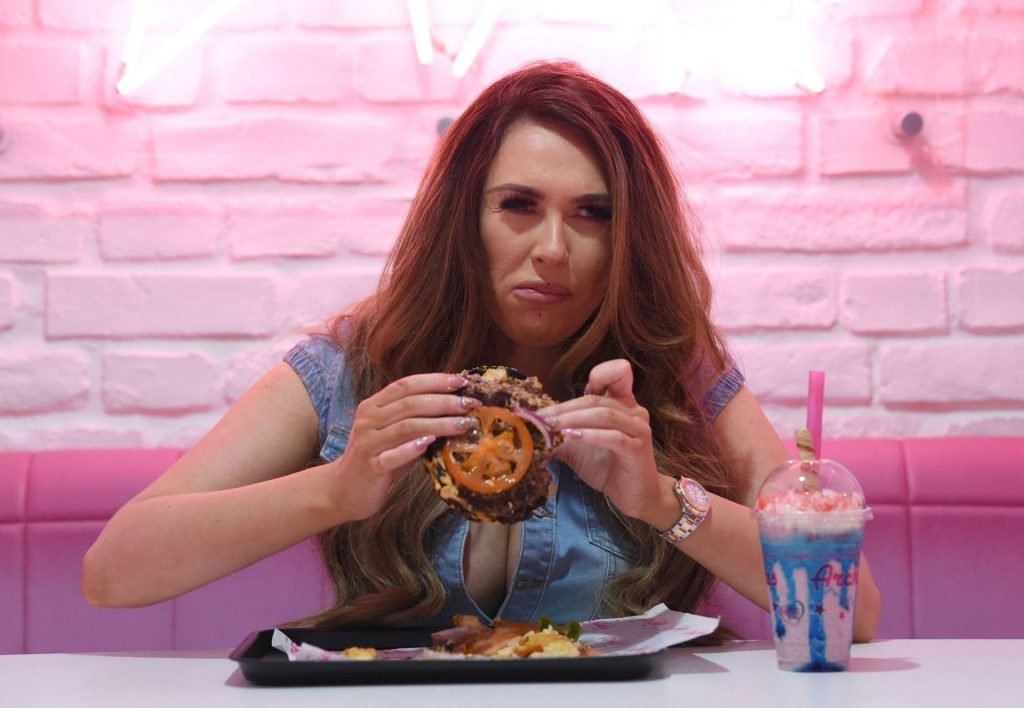 La star de la télé-réalité Charlotte Dawson déguste son énorme burger au bar Archie’s Burger and Milkshake après une longue journée passée au photoshoot fredafunk à Manchester, 21/03/2019. Bon appétit !