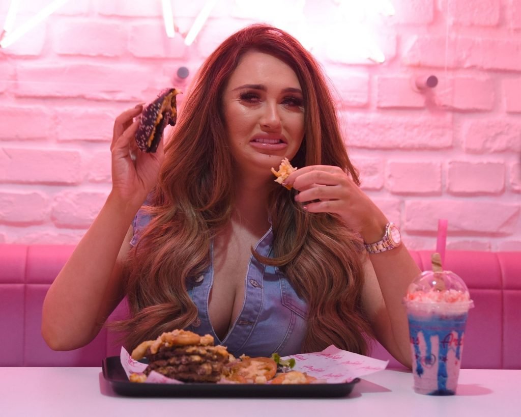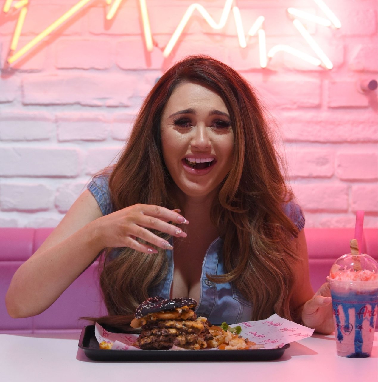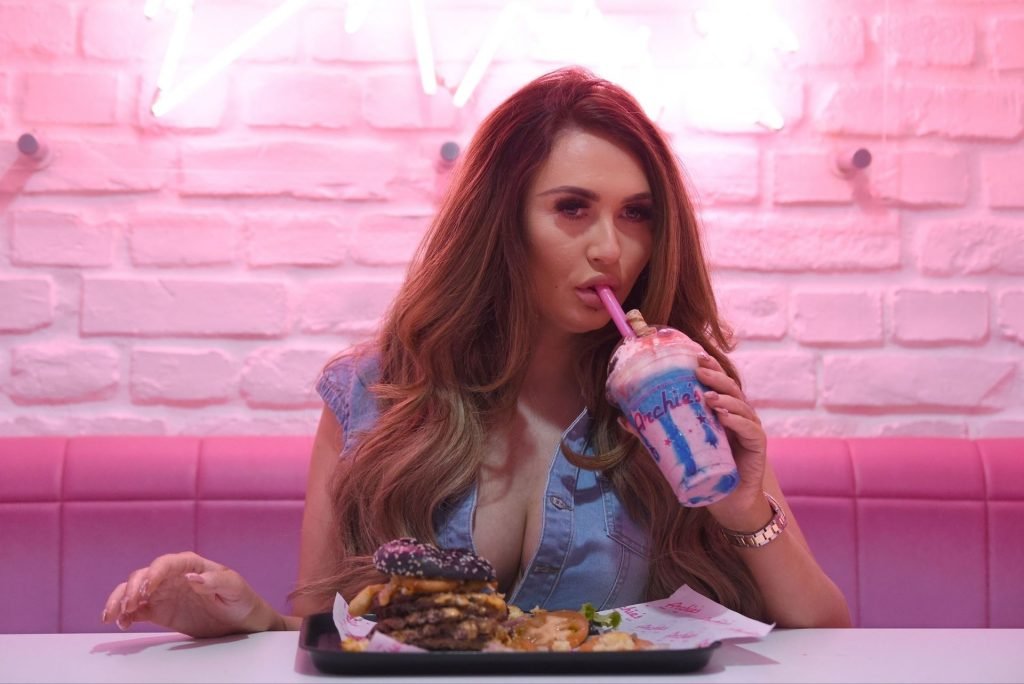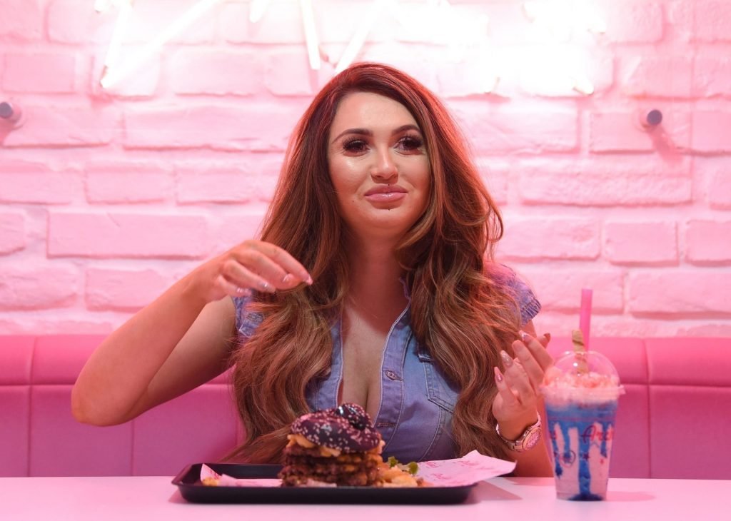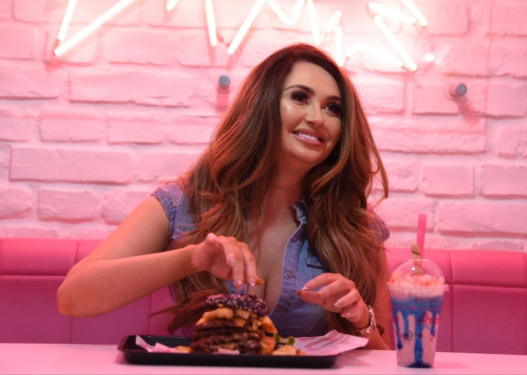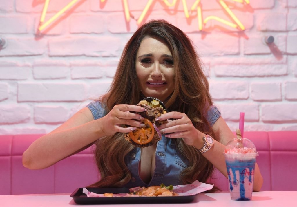 La star de la télé-réalité Charlotte Dawson déguste son énorme burger au bar Archie’s Burger and Milkshake après une longue journée passée au photoshoot fredafunk à Manchester, 21/03/2019. Bon appétit !