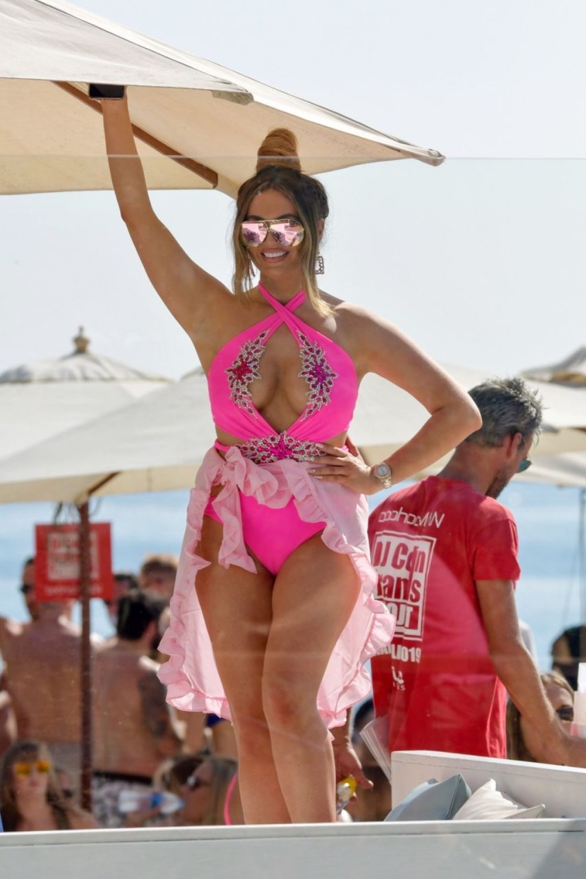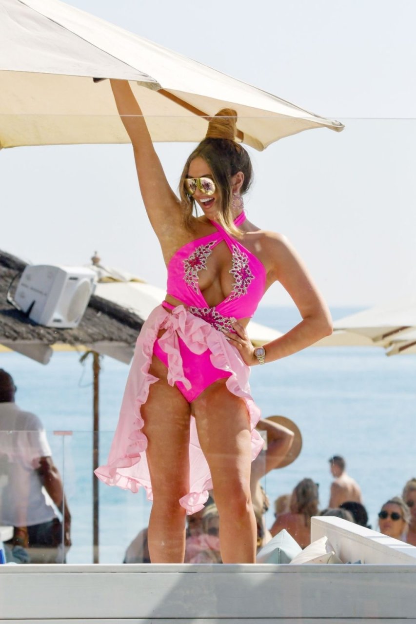 La star anglaise de la télévision Charlotte Dawson fait la fête en maillot de bain rose lors d’un enterrement de vie de jeune fille d’une amie à la Plaza Beach à Marbella, 29/09/2019.