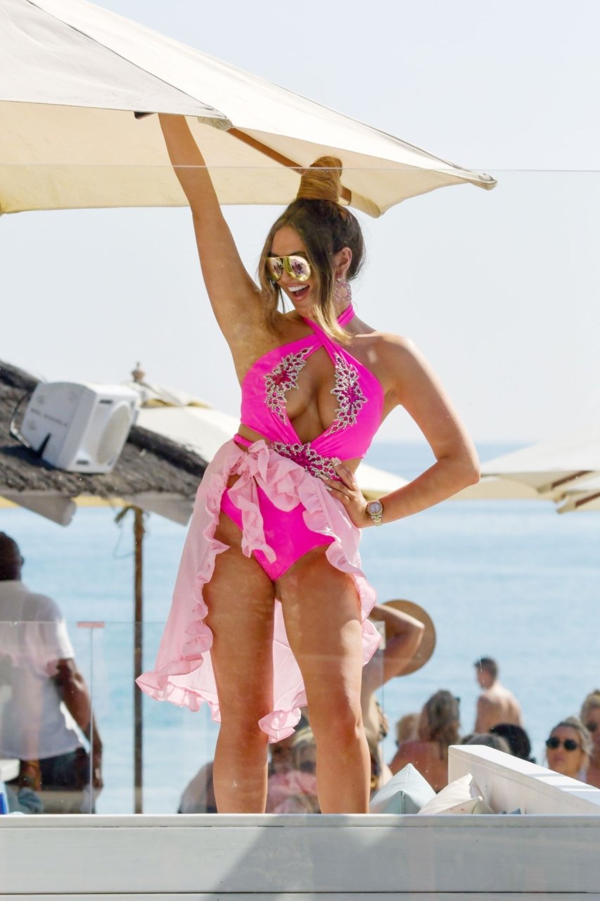 La star anglaise de la télévision Charlotte Dawson fait la fête en maillot de bain rose lors d’un enterrement de vie de jeune fille d’une amie à la Plaza Beach à Marbella, 29/09/2019.