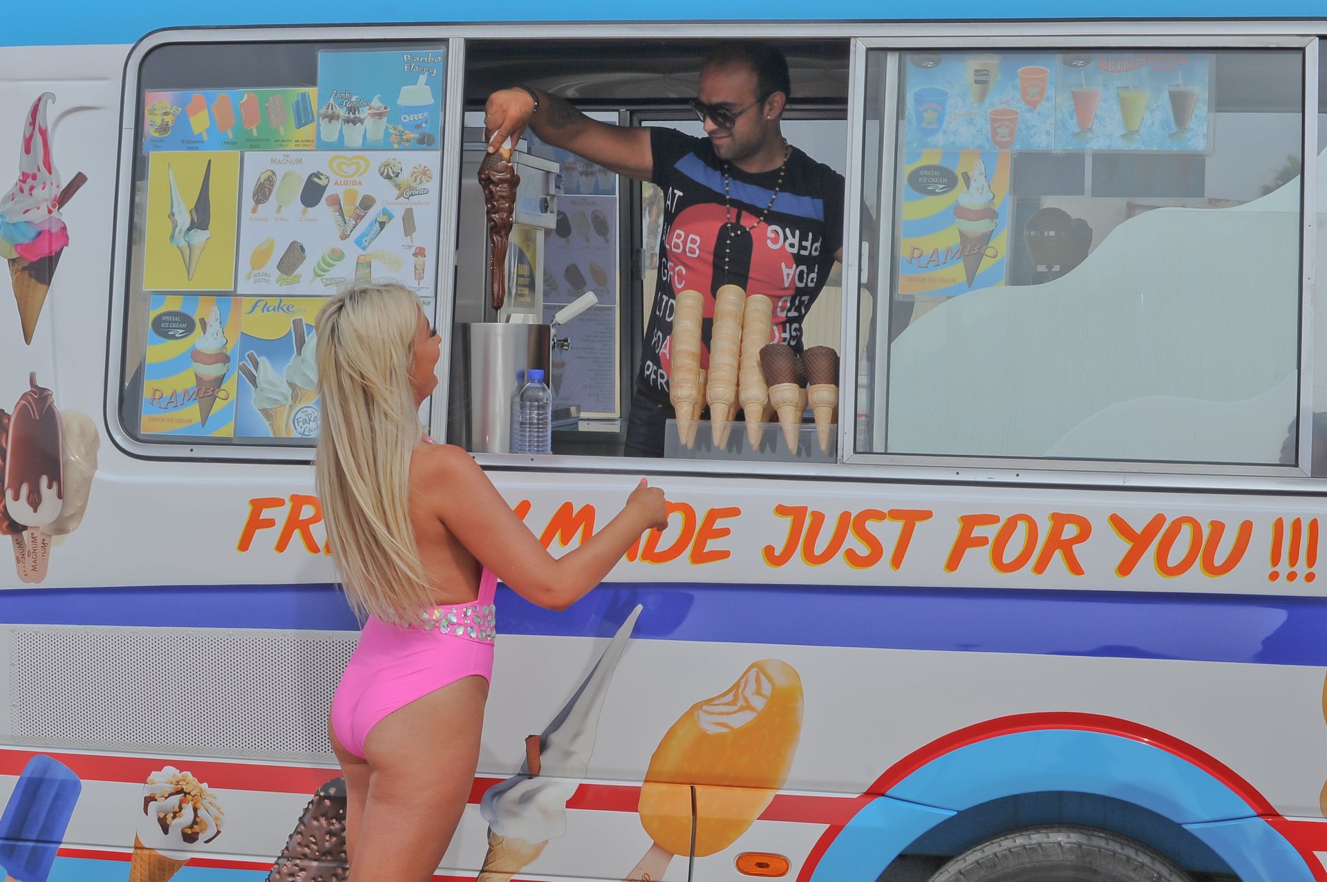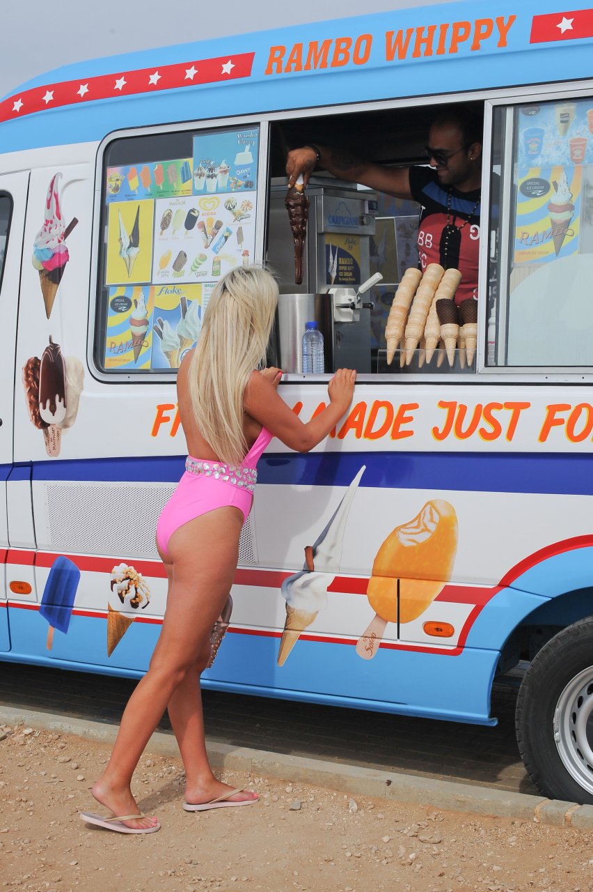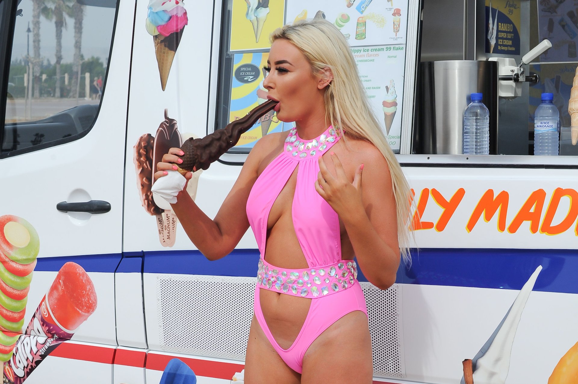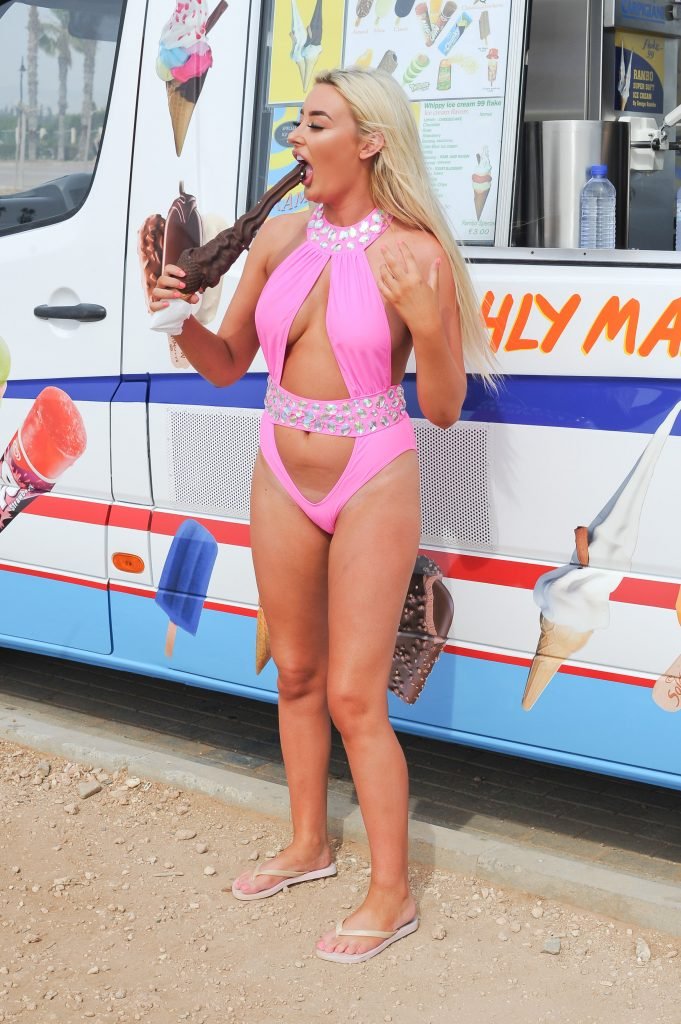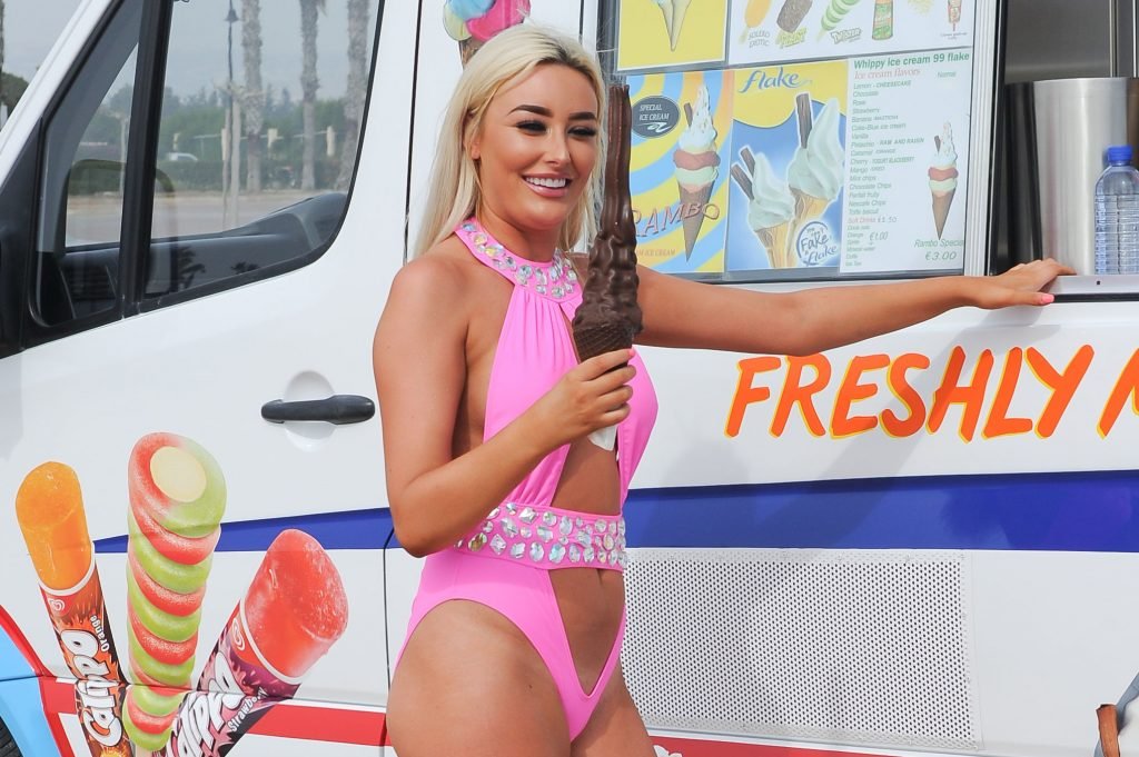Love Island star Chloe Crowhurst (21) savoure une longue glace au chocolat pendant ses vacances à Chypre, 19/04/2018. Au lieu de la glace, tout le monde veut voir autre chose dans sa bouche.