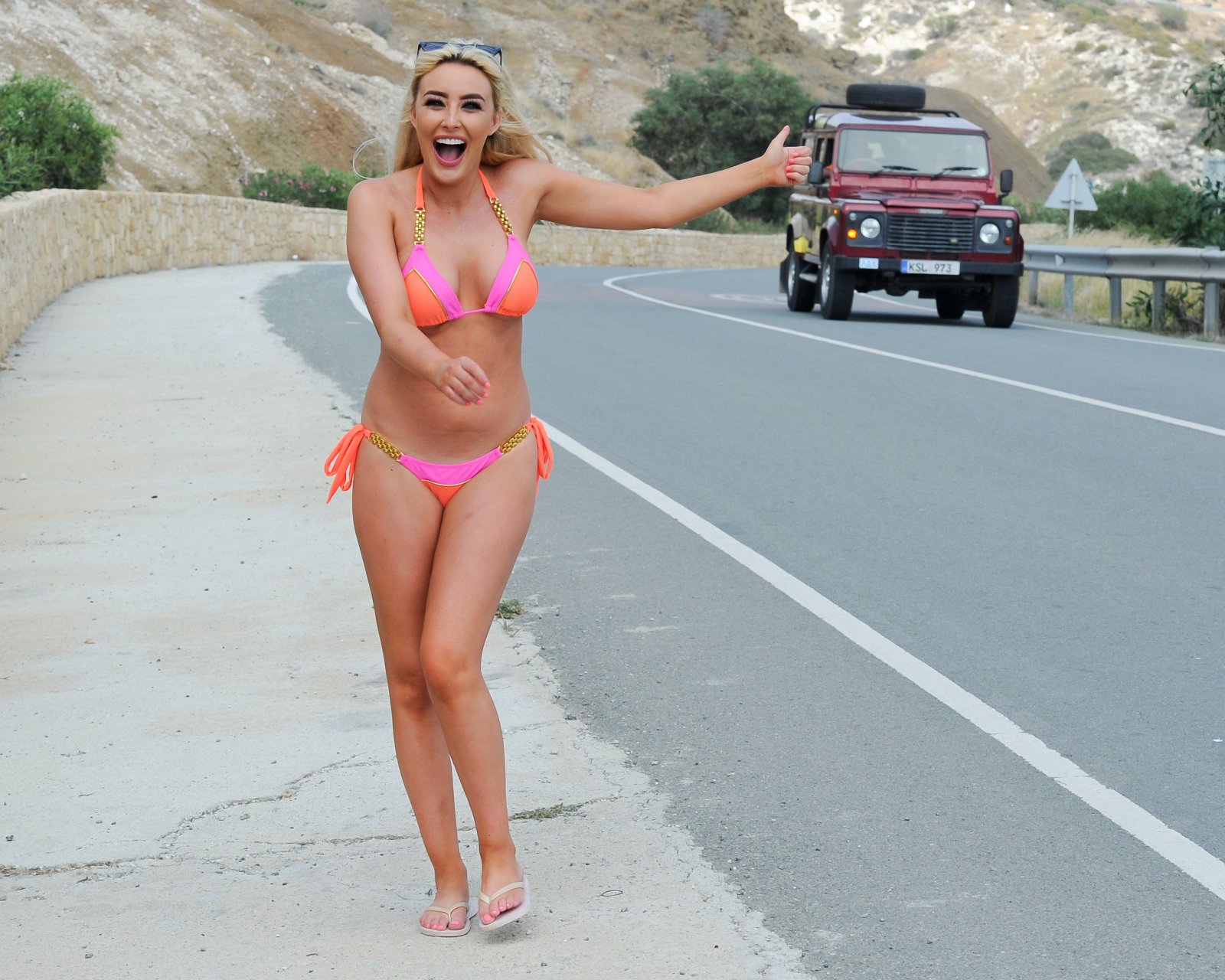 Love Island star Chloe Crowhurst, 21 ans, photographiée sur une plage rocheuse espagnole lors d’une séance photo en bikini éclatant, puis tente de faire de l’auto-stop pour rentrer chez elle, ce qui échoue car personne ne s’arrête, 20/04/2018.