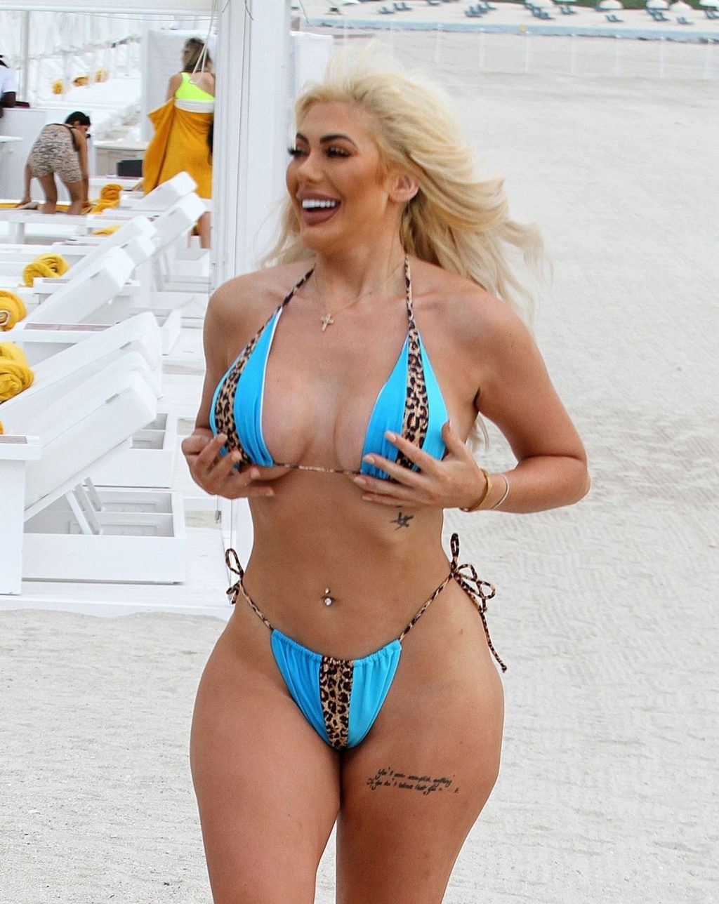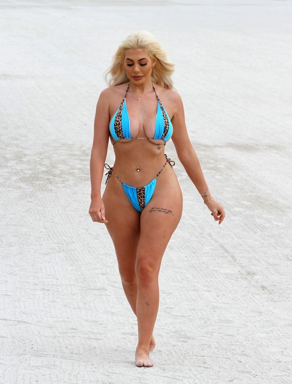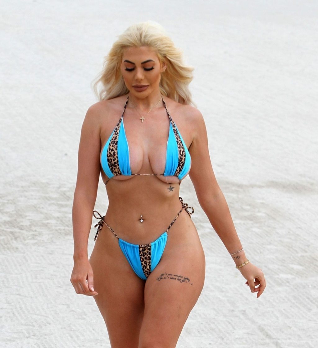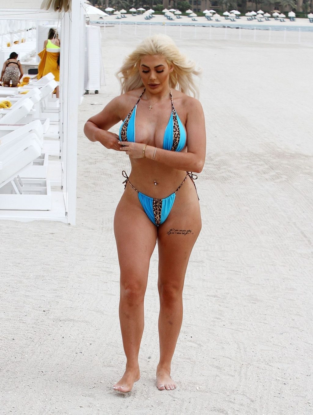 La star de “Geordie Shore” Chloe Ferry a été photographiée montrant sa silhouette en sablier dans un bikini bleu tout en profitant de ses vacances sous le soleil de Dubaï, 27/02/2020.