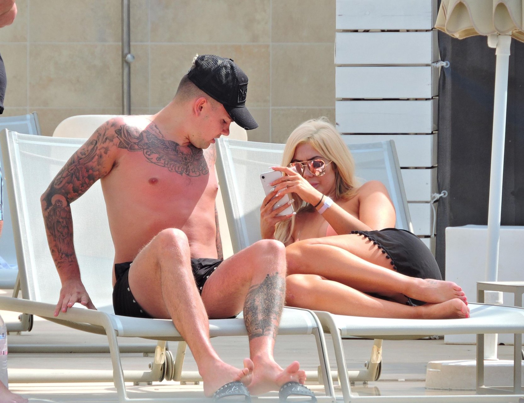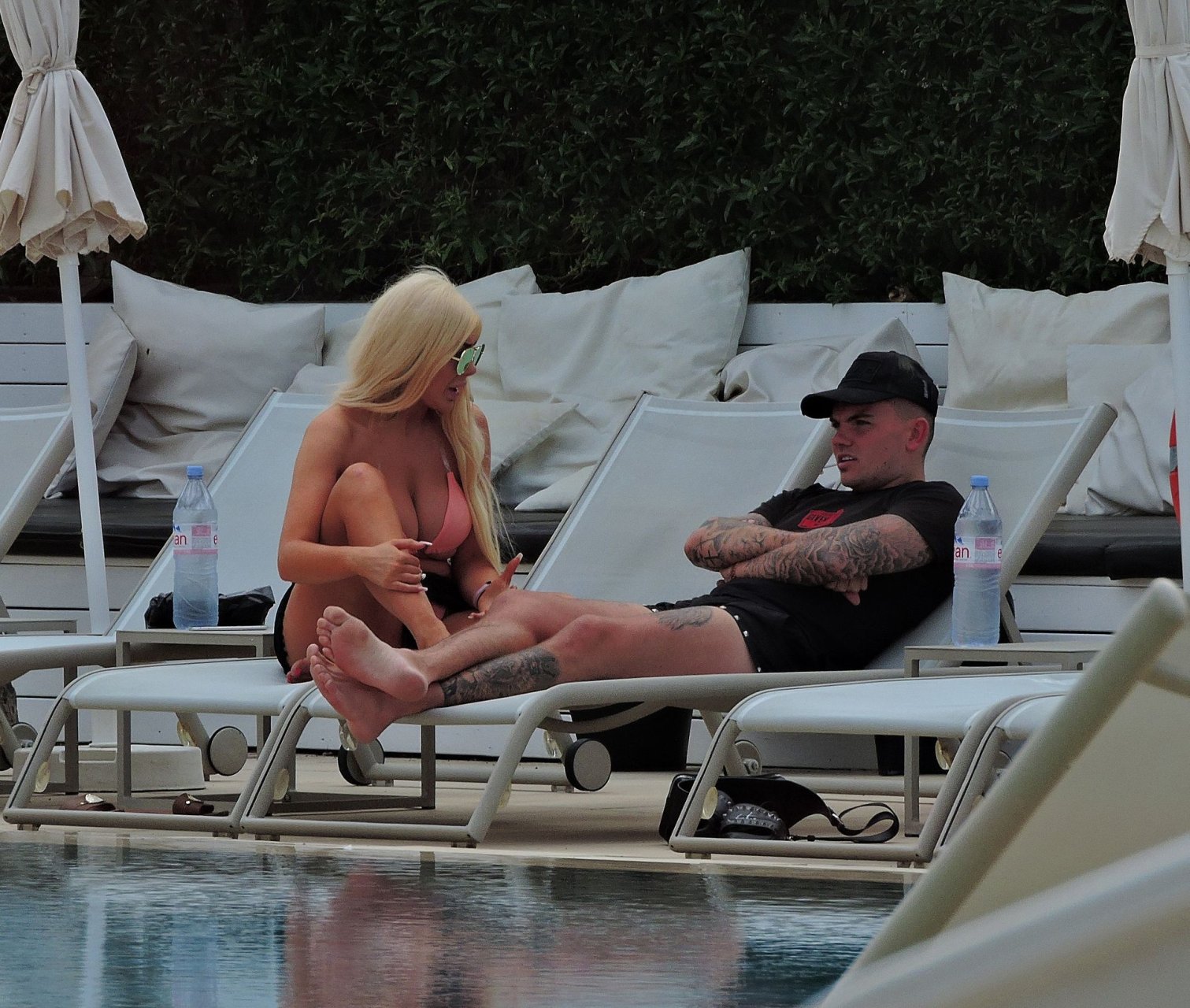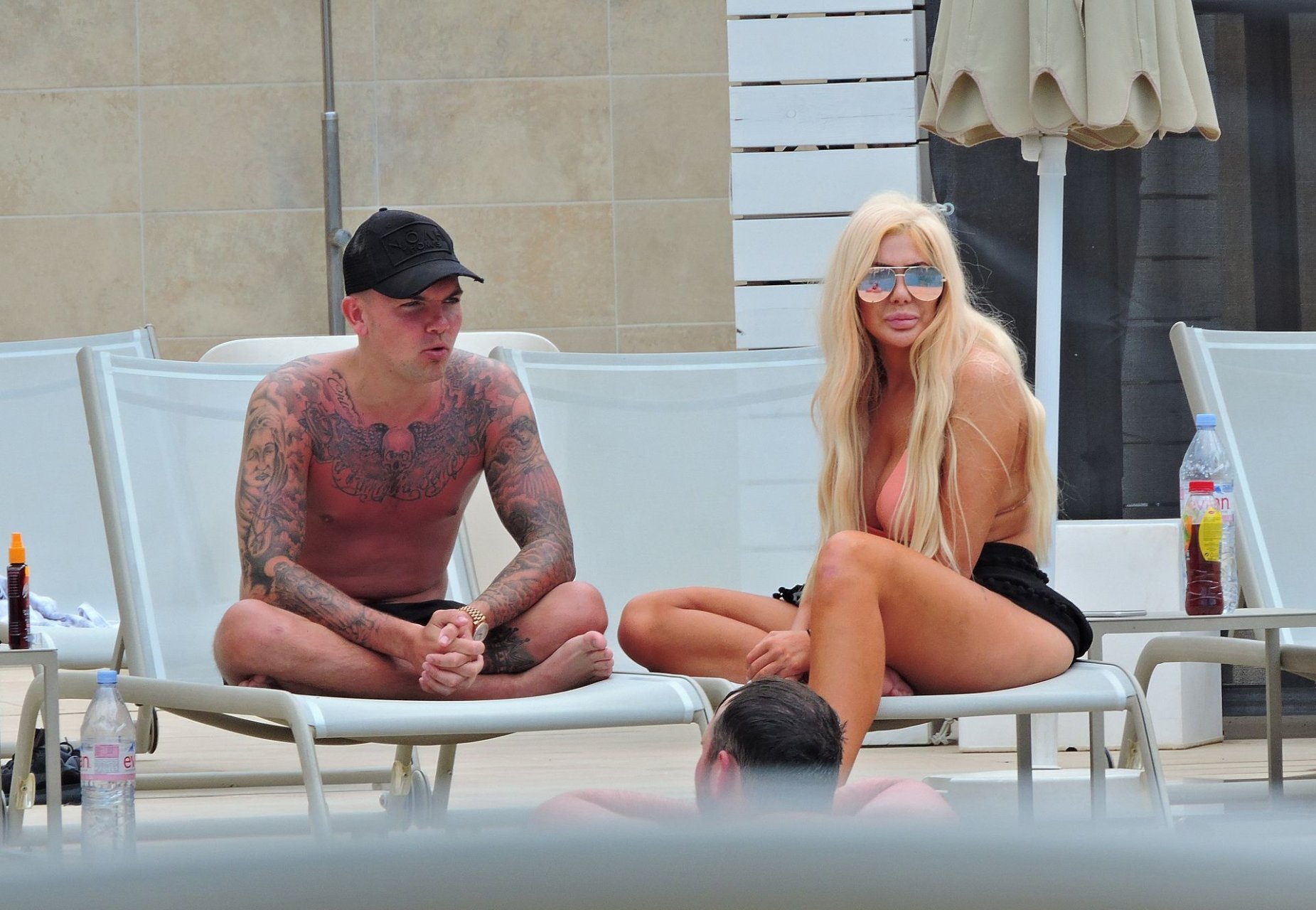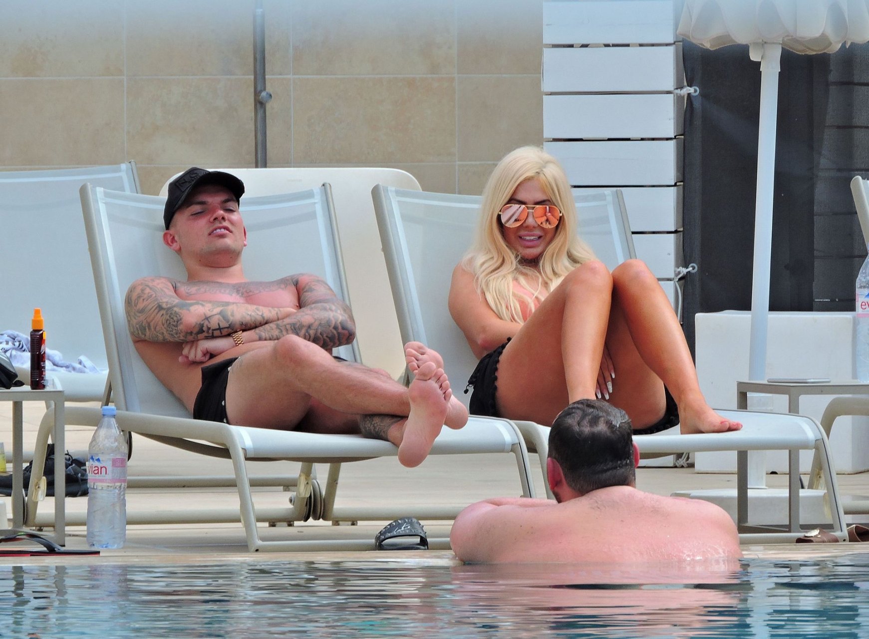 La star anglaise de la télé-réalité Chloe Ferry et son petit ami intermittent Sam Gowland sont vus en train de se détendre au bord de la piscine pendant leurs vacances ensemble à Magaluf, Majorque, 21/05/2019.