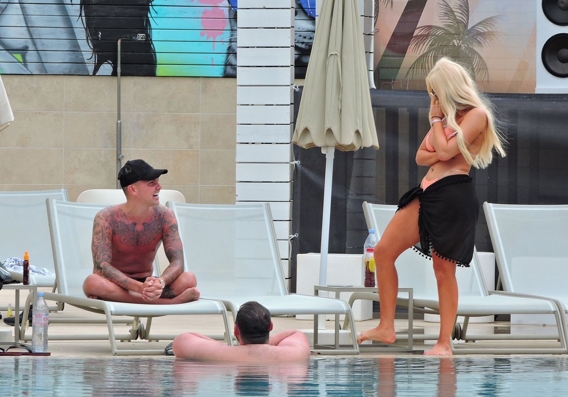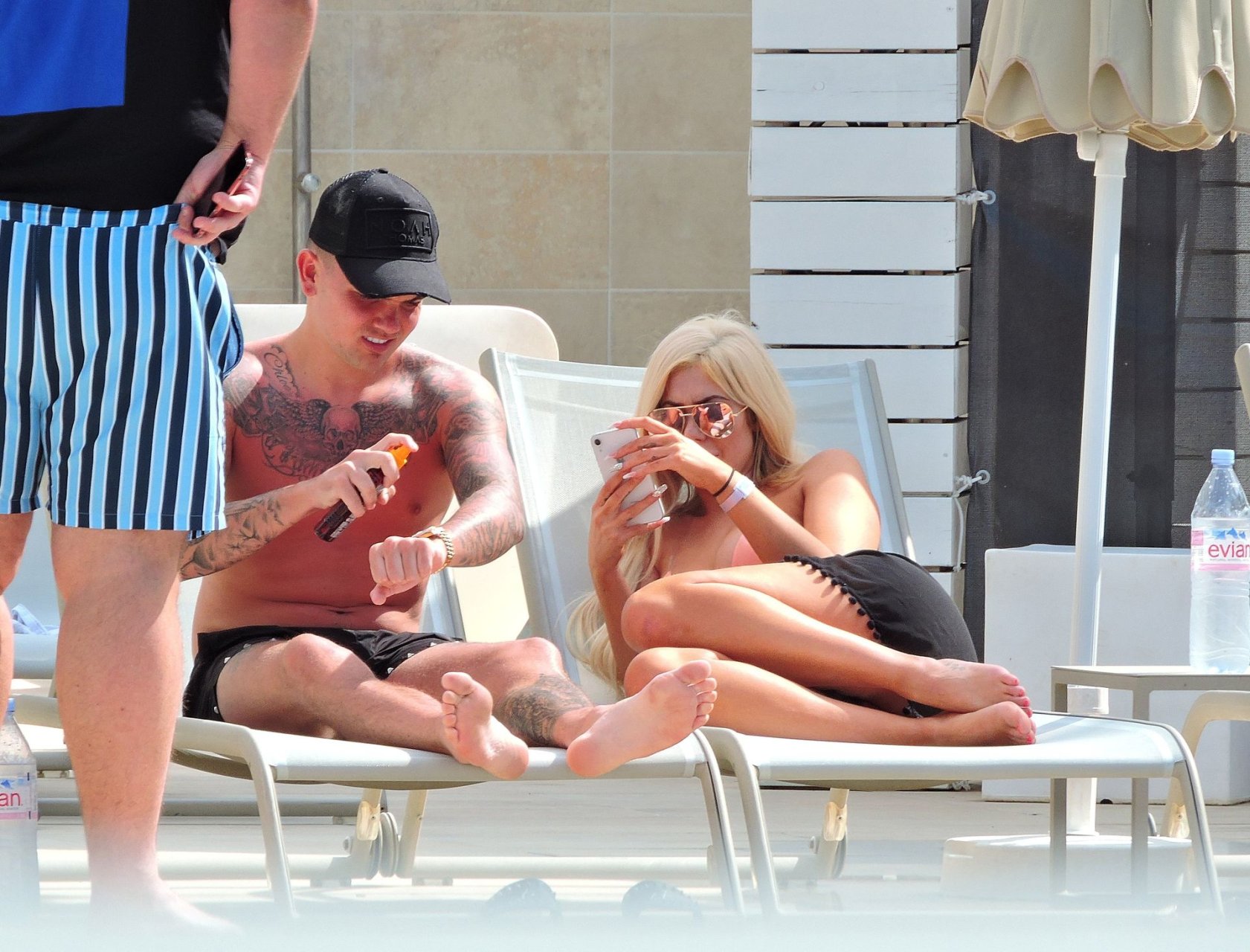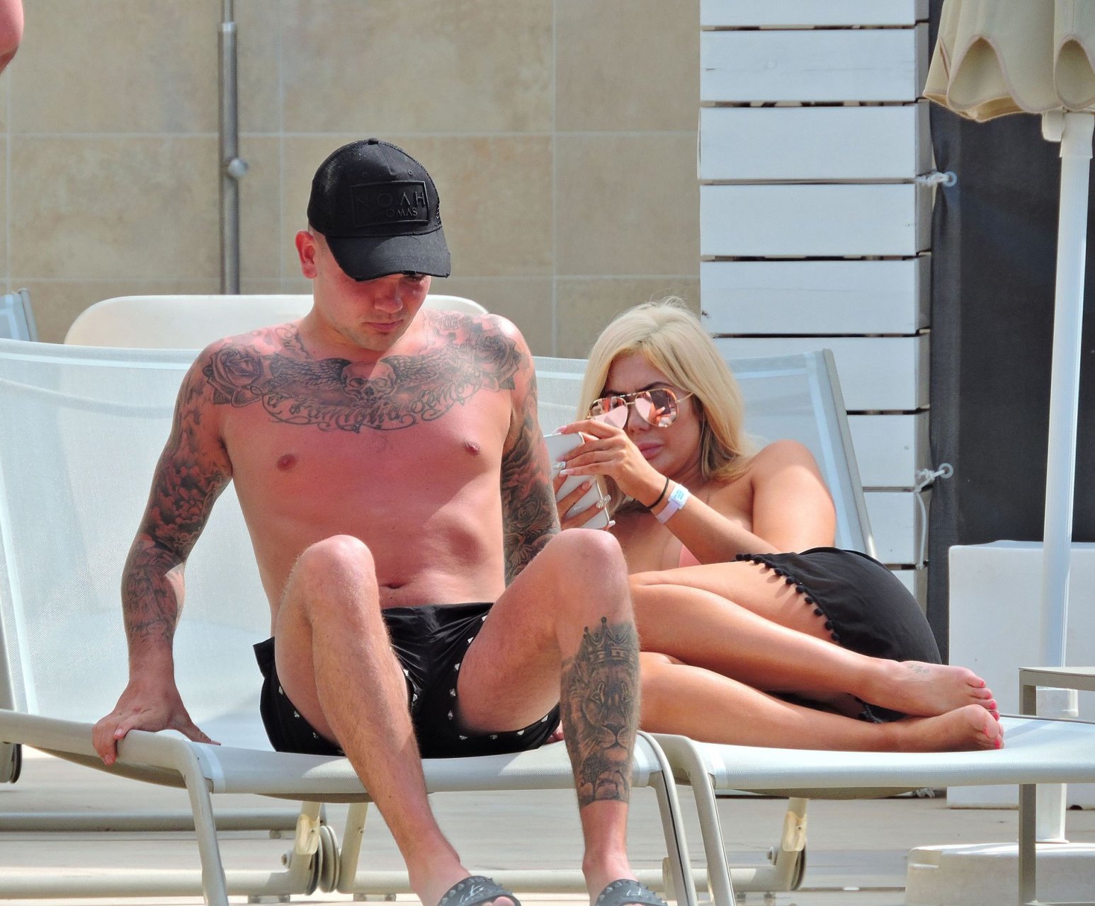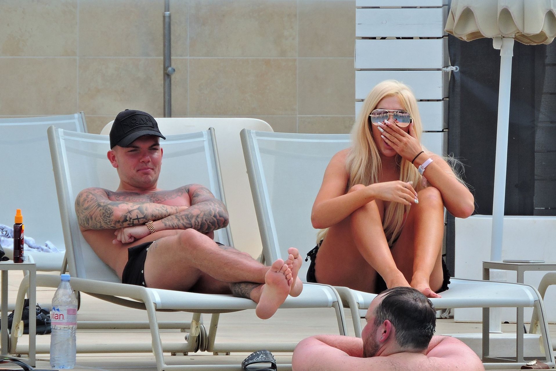 La star anglaise de la télé-réalité Chloe Ferry et son petit ami intermittent Sam Gowland sont vus en train de se détendre au bord de la piscine pendant leurs vacances ensemble à Magaluf, Majorque, 21/05/2019.