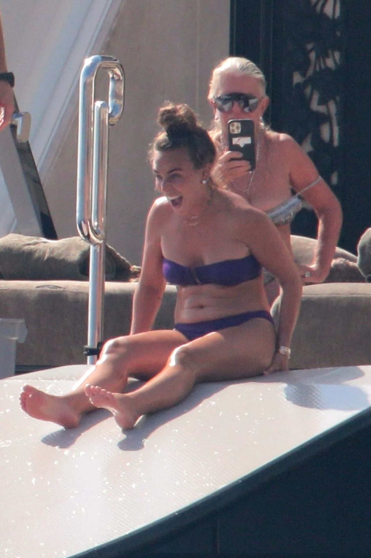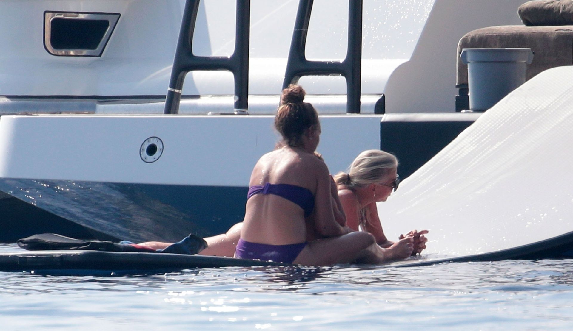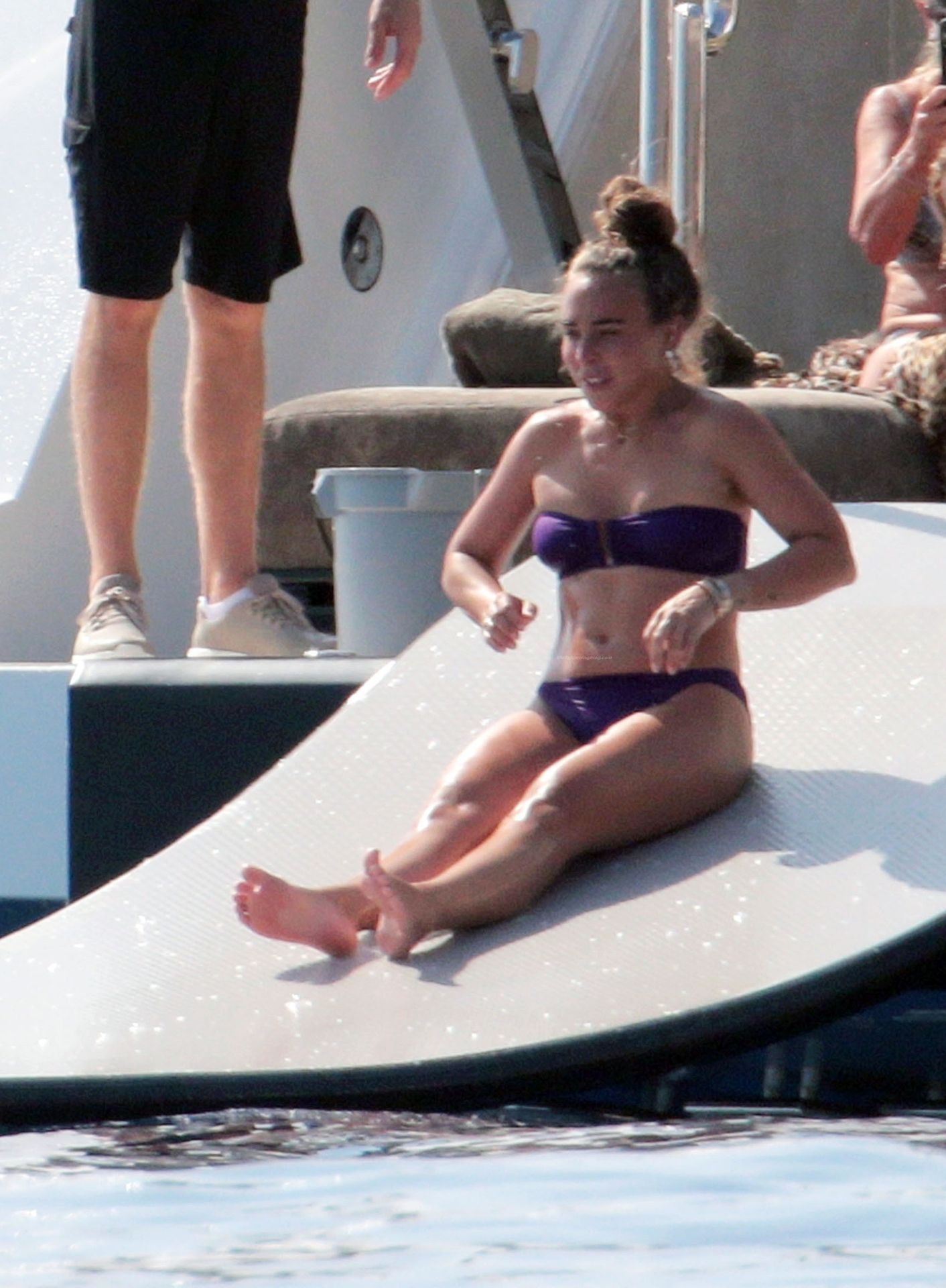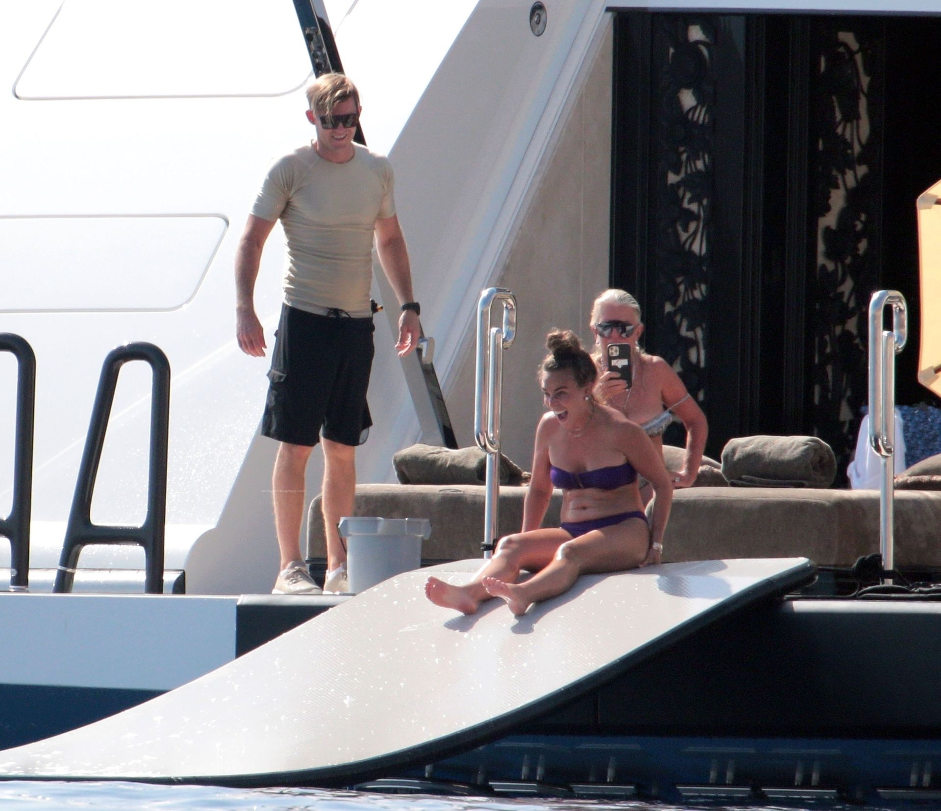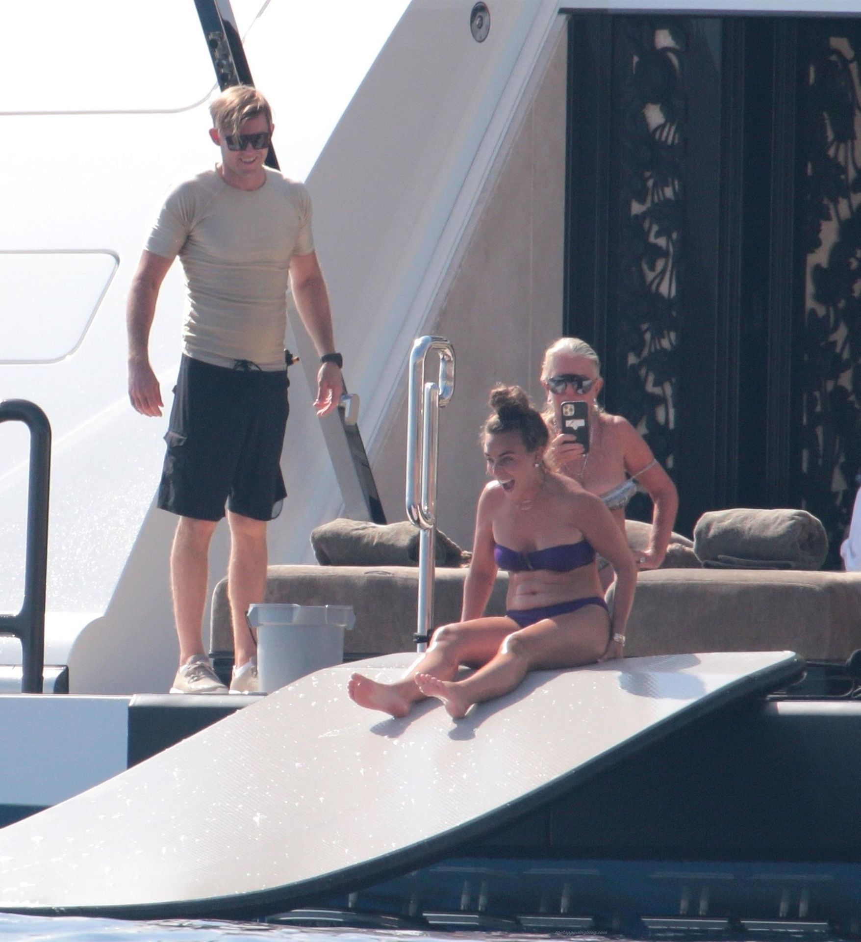 Chloe a été la première à essayer le toboggan, portant son bikini violet minimaliste, tandis que sa mère Tina prenait quelques photos de cet événement plein de sensations fortes avec son téléphone.
