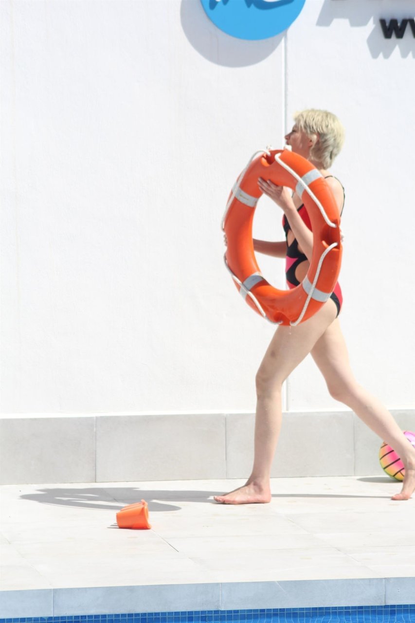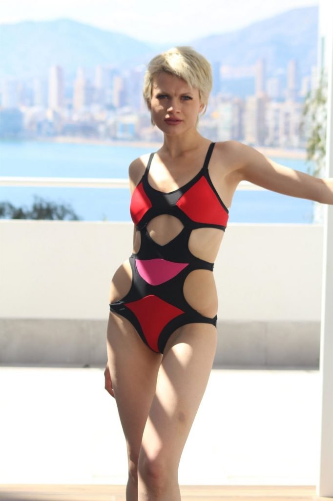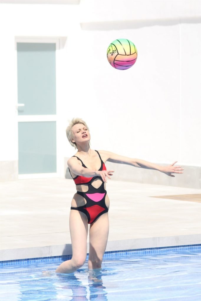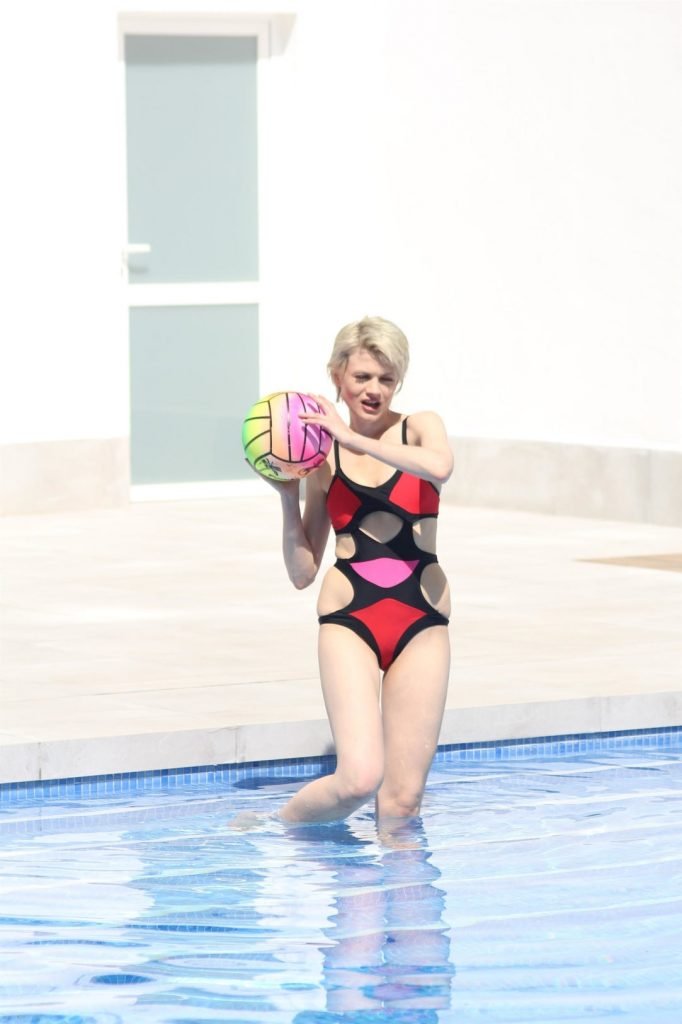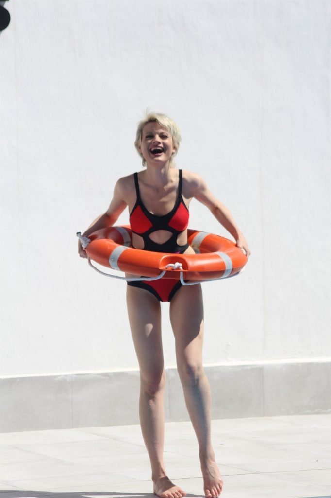 Chloe Jasmine s’amuse en maillot de bain rouge et noir au bord de la piscine au Cap-Vert, 04/05/2018.