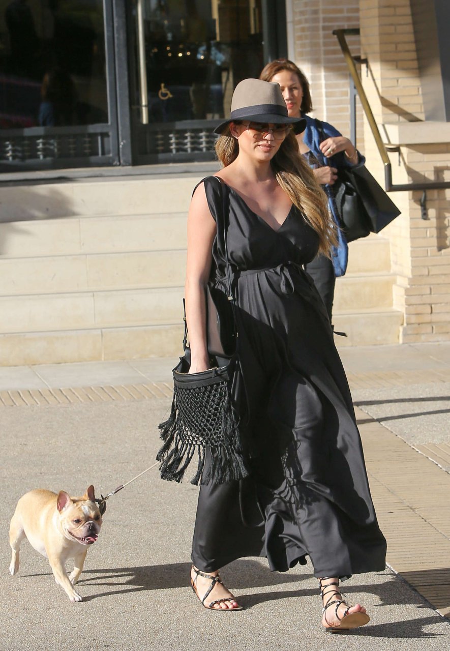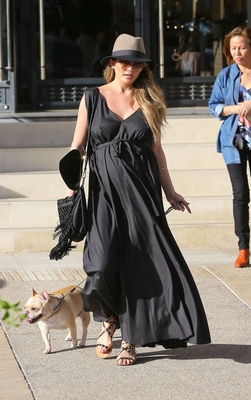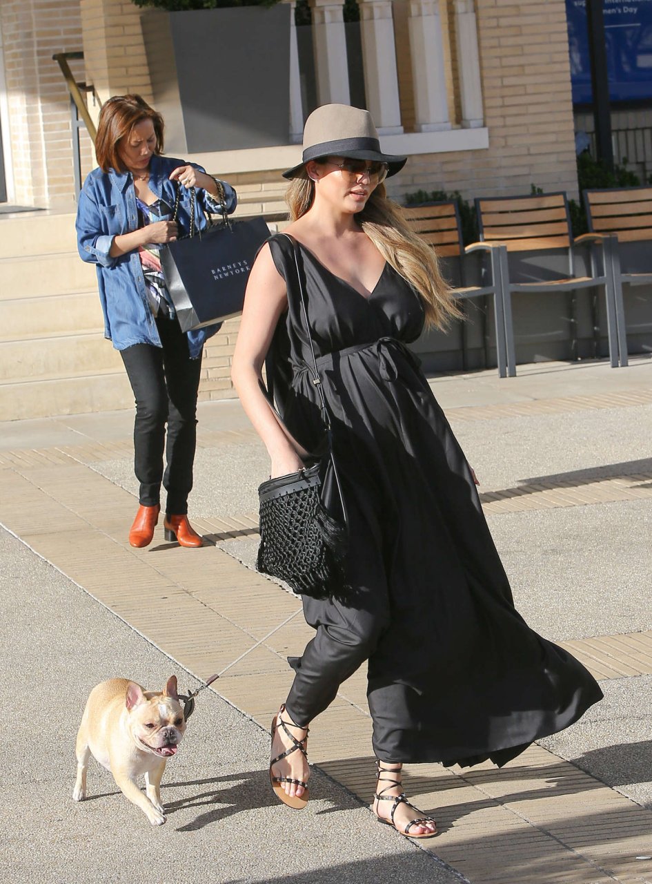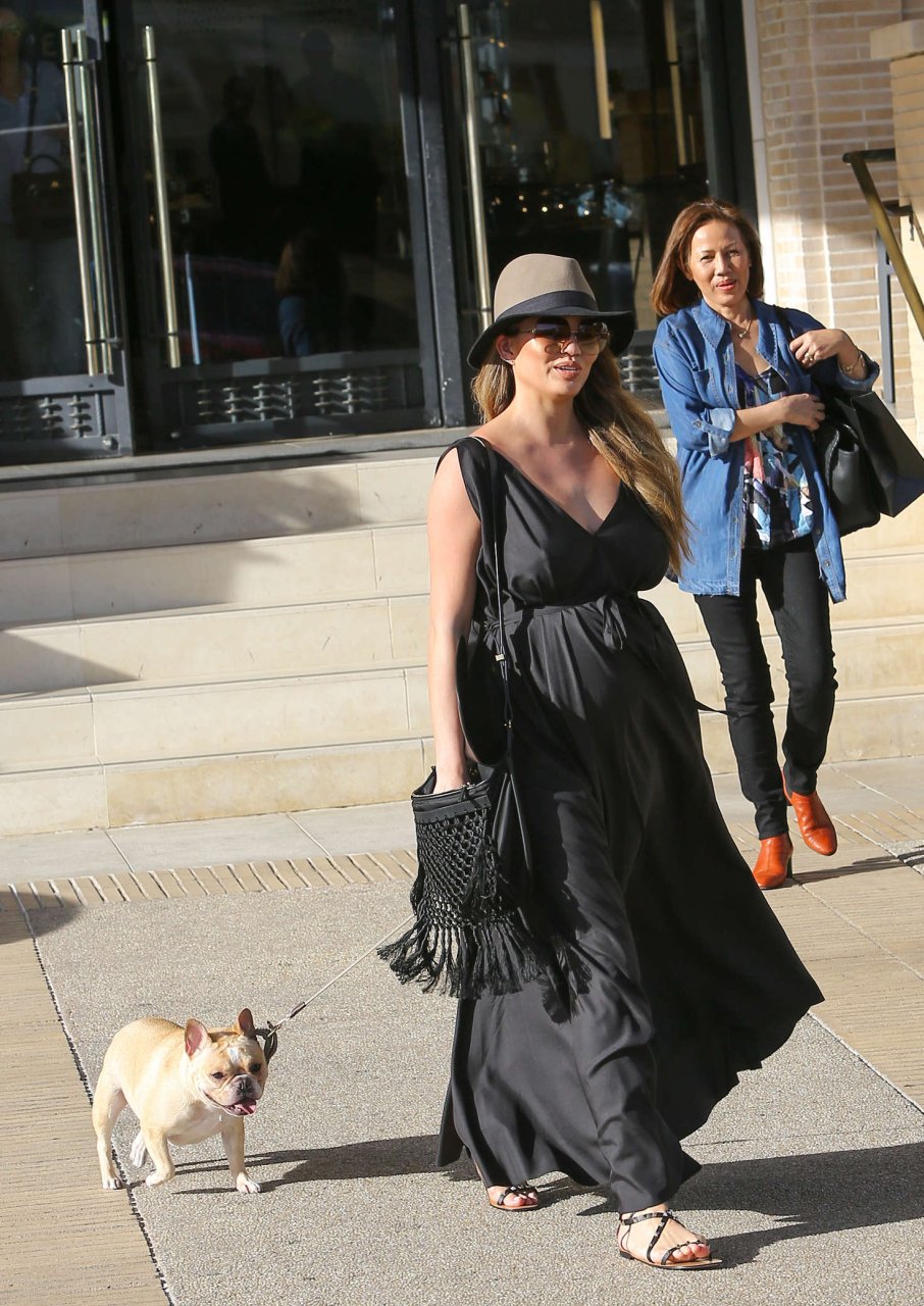 Chrissy Teigen en robe noire chez Barneys New York à Los Angeles, 14/03/2016. Poitrine super laiteuse ! Chrissy Teigen est un mannequin américain. Âge 30 ans (30 novembre 1985). Taille 174 cm.