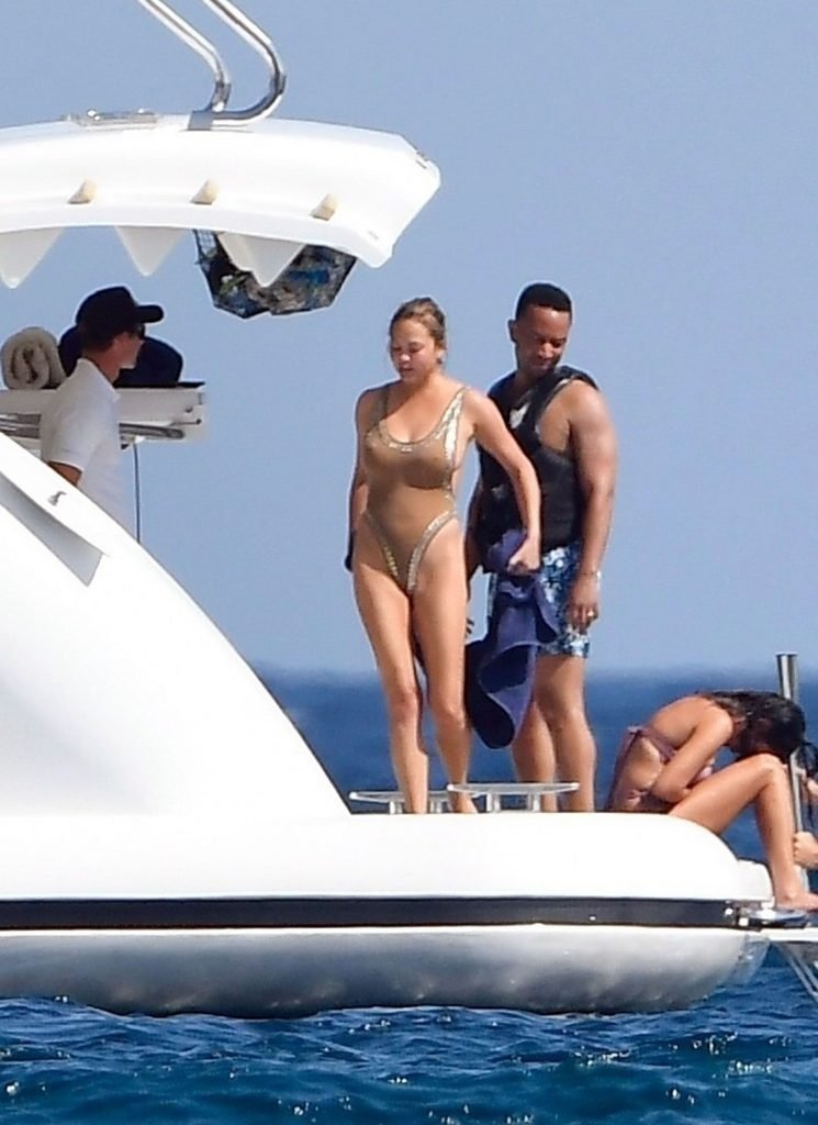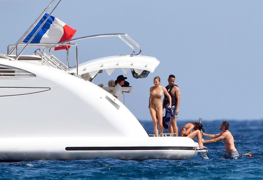 Le mannequin de Victoria’s Secret Chrissy Teigen (31 ans) photographiée, ayant l’air fabuleuse et montrant son corps chaud de plage tout en se relaxant sur un super yacht en Corse, 28/08/2017.