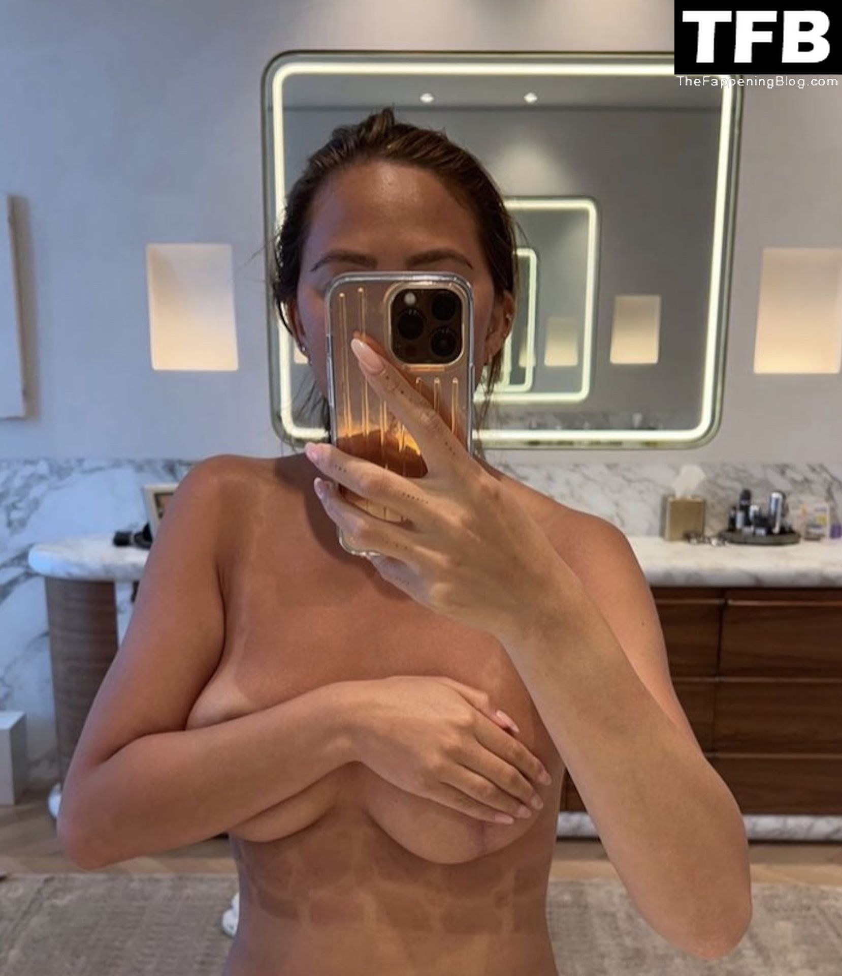 Le mannequin Chrissy Teigen, épouse du chanteur John Legend, pose totalement nue dans ce selfie devant le miroir, 18/04/2022.