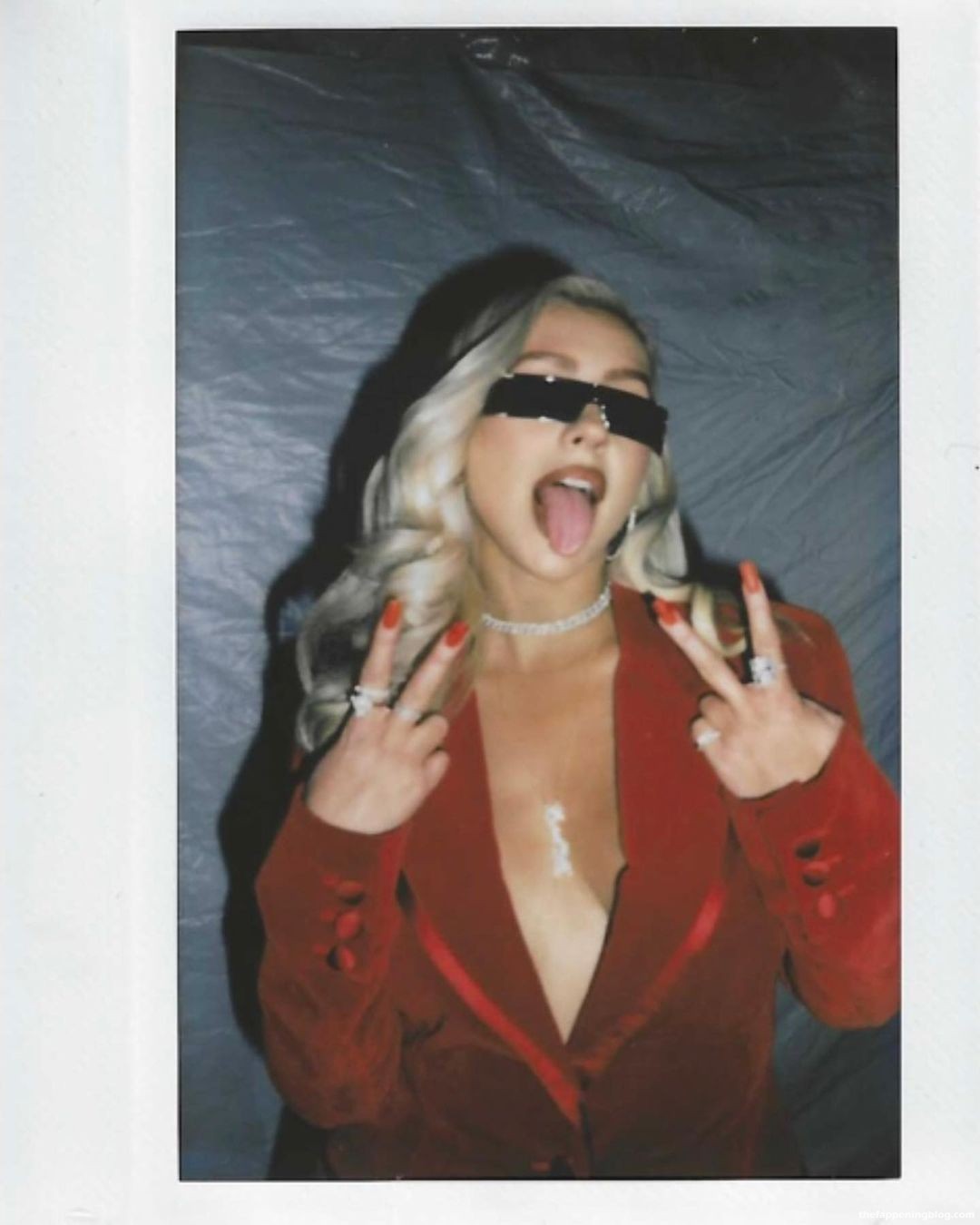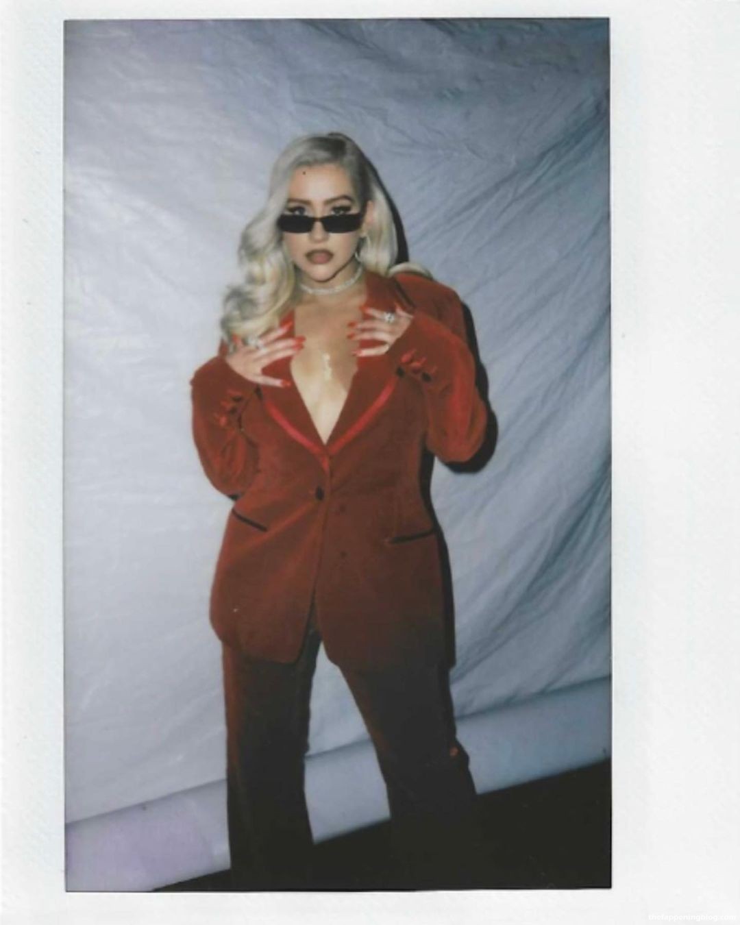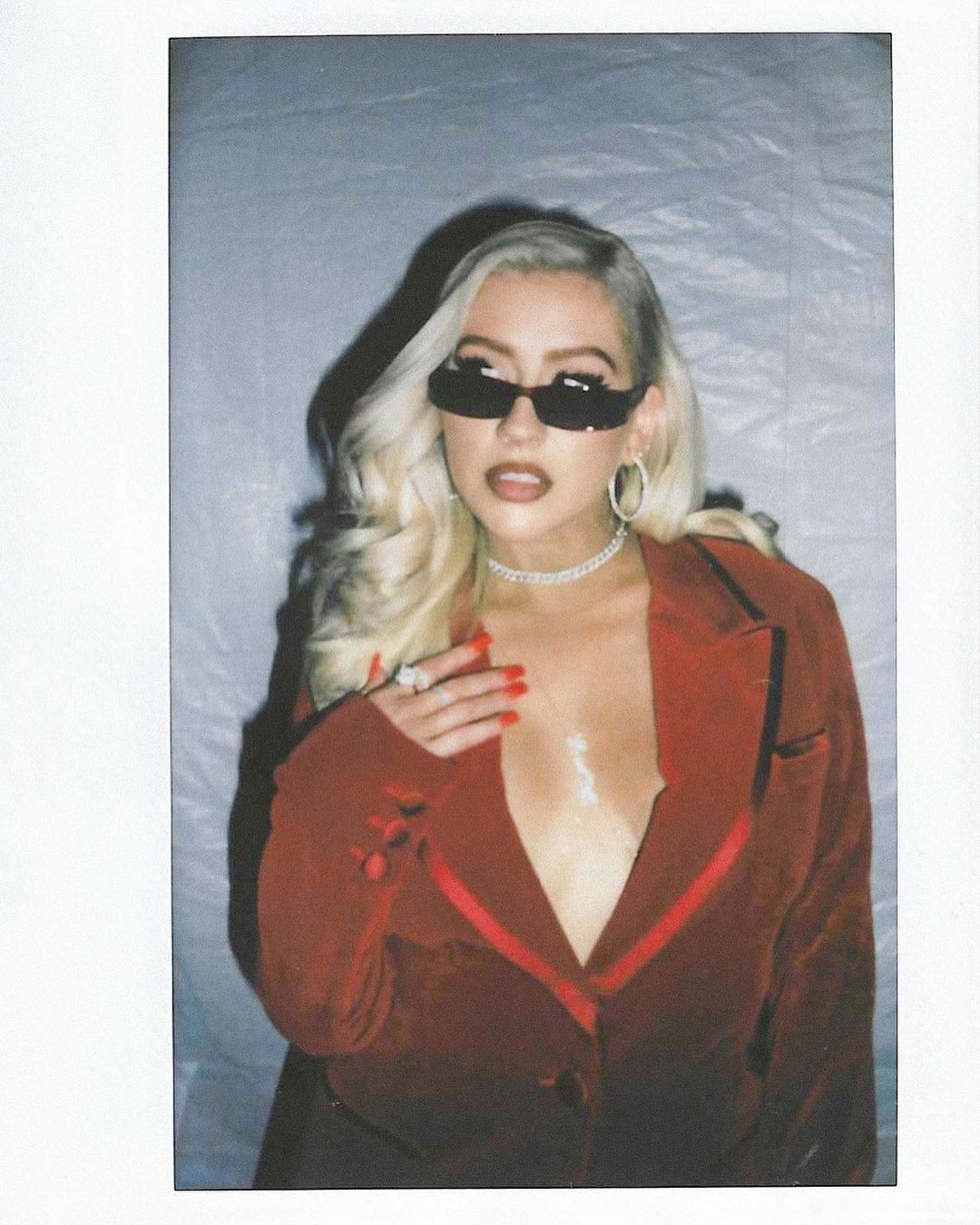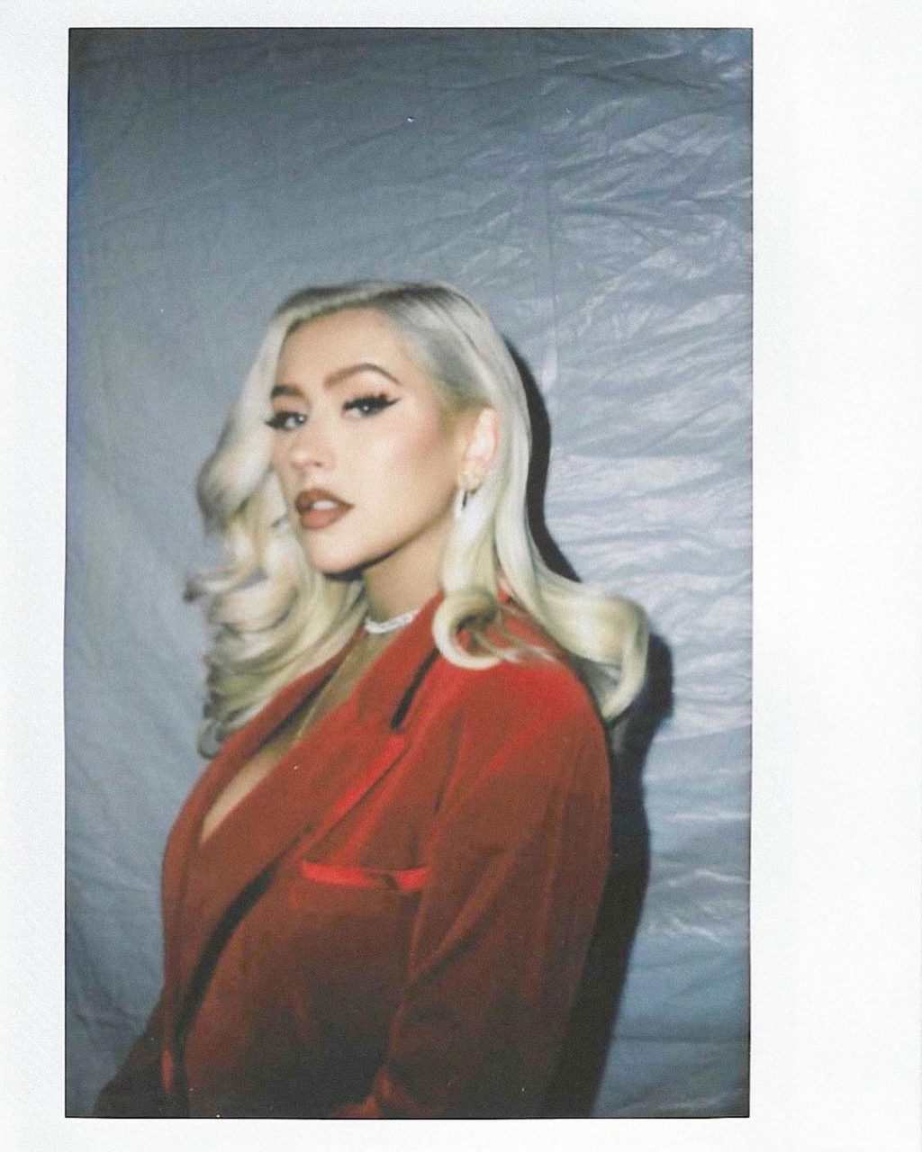 Chanteuse Christina Aguilera pose sans soutien-gorge, montrant un joli décolleté avec ses gros seins dans un tailleur-pantalon rouge – Instagram, 28/08/2021.