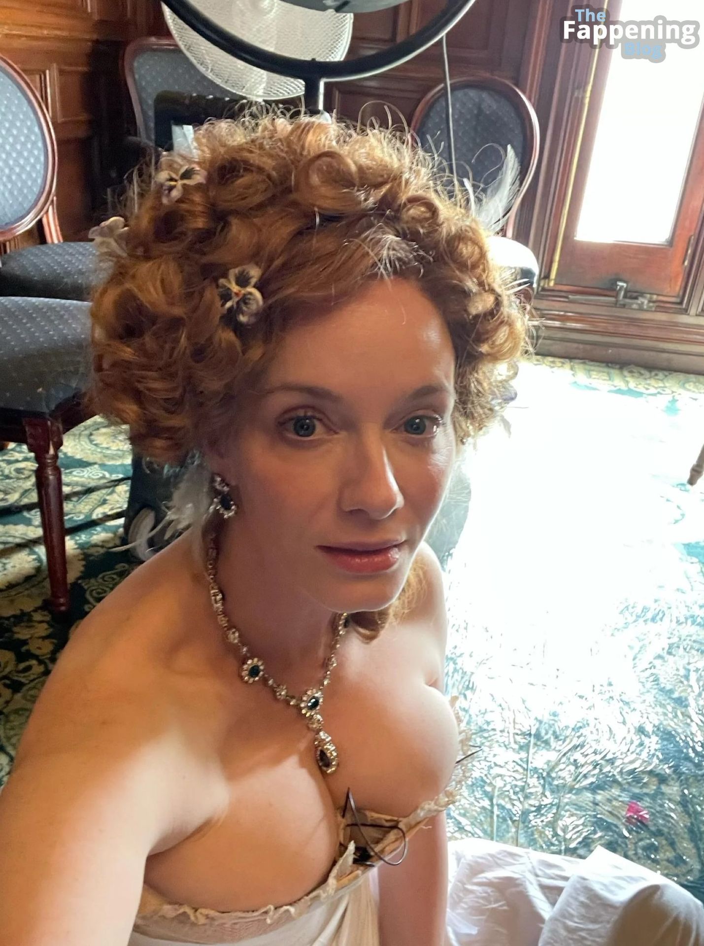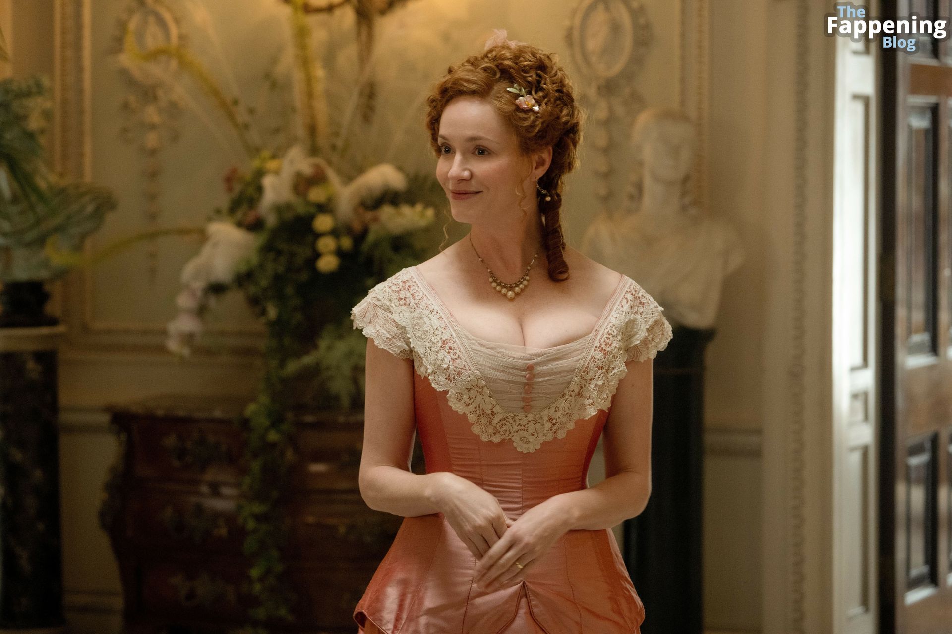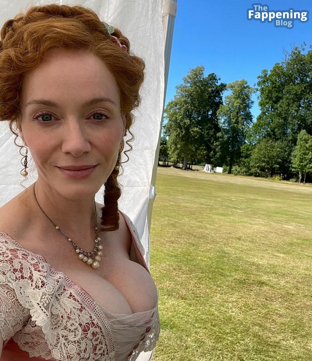 Christina Hendricks exhibe son célèbre décolleté et ses grosses poitrines sur le plateau de “The Buccaneers”.