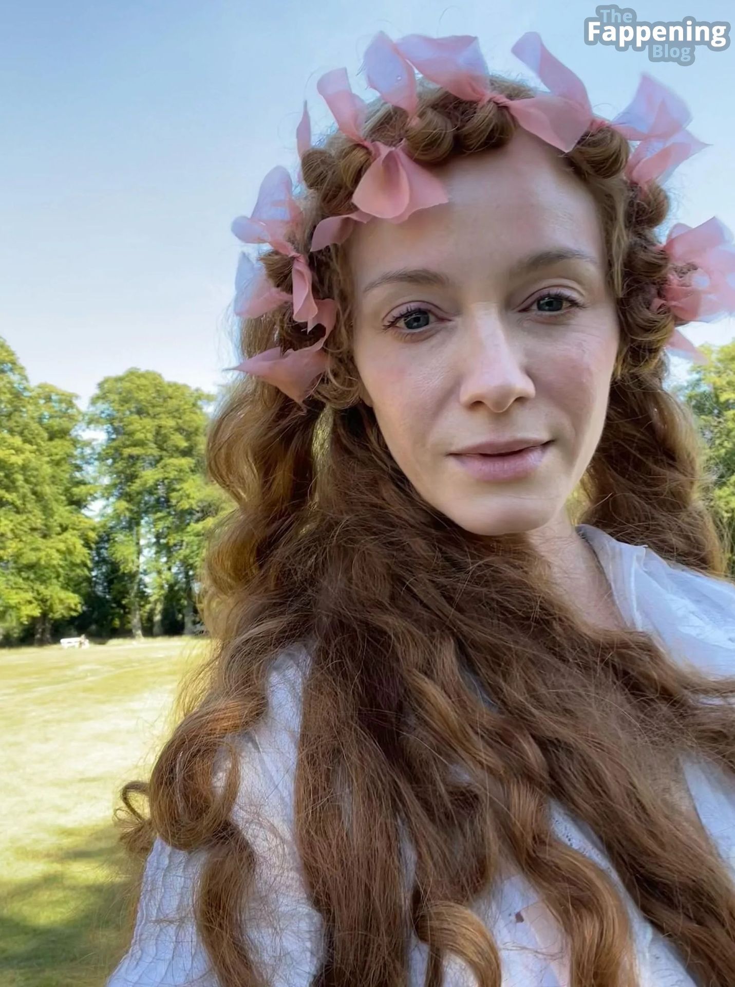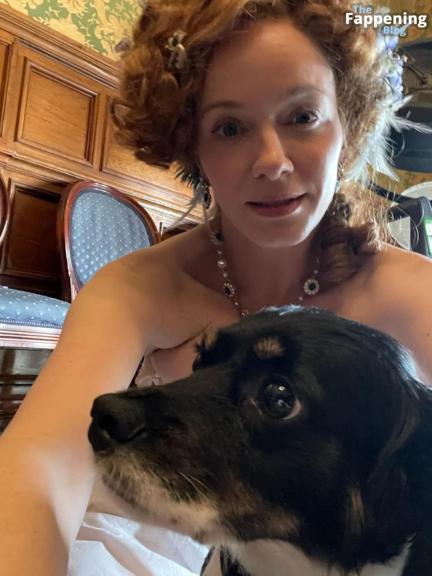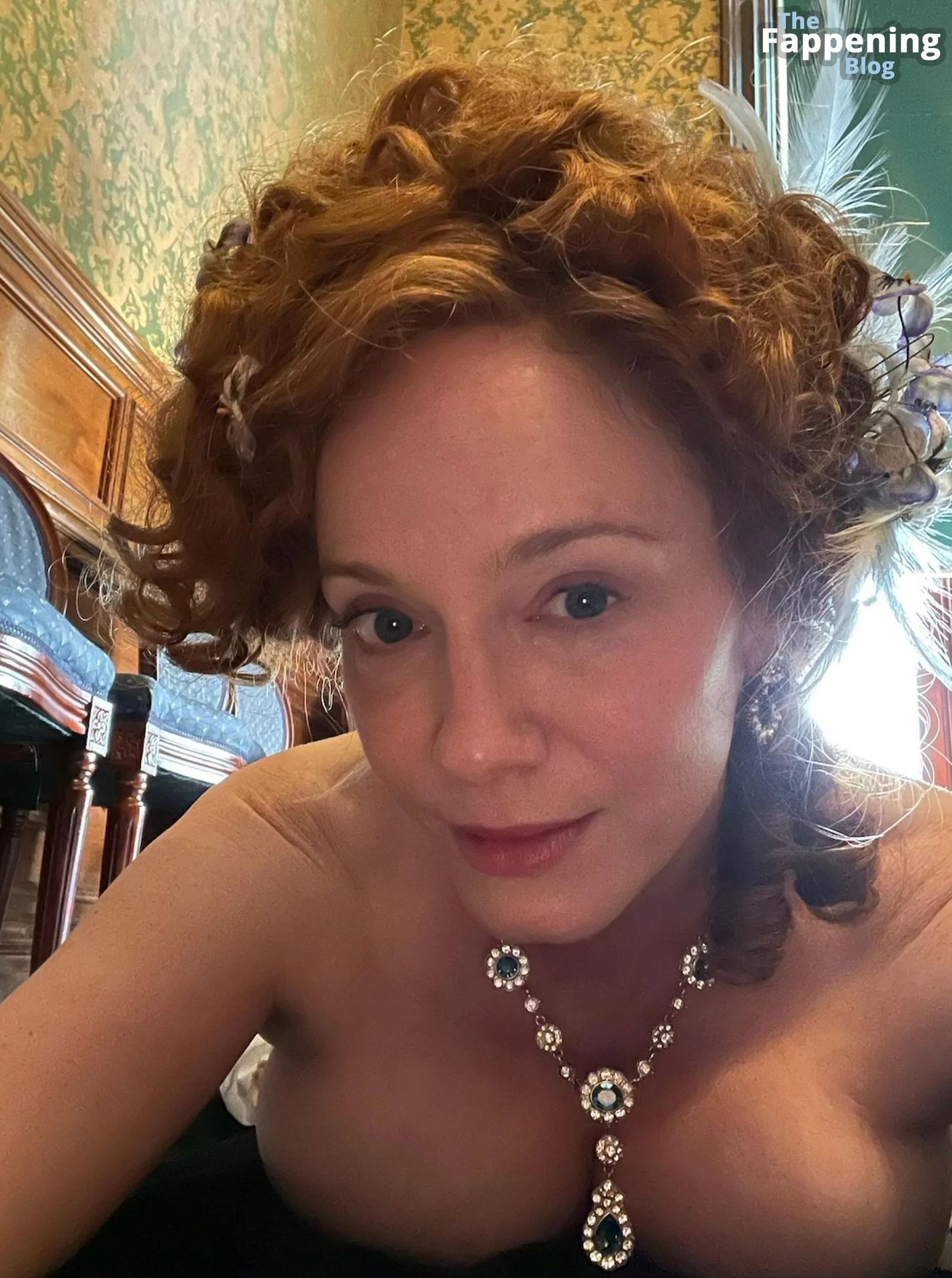 Christina Hendricks exhibe son célèbre décolleté et ses grosses poitrines sur le plateau de “The Buccaneers”.