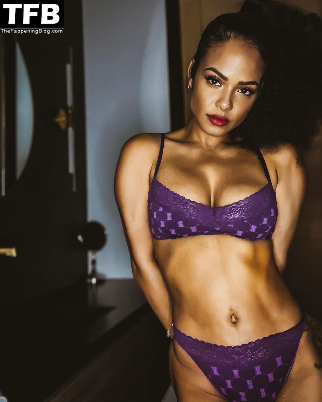 L’actrice Christina Milian pose en lingerie violette dans une nouvelle séance photo promotionnelle pour Savage X Fenty (janvier 2022).