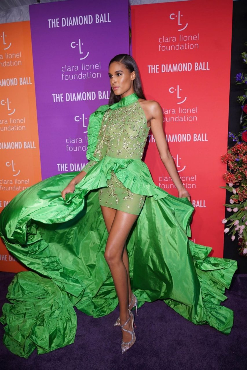 Le mannequin Cindy Bruna affiche ses jambes et sa poitrine sexy, portant une robe verte lors du 5e Bal Annuel du Diamant au profit de la Clara Lionel Foundation au Cipriani Wall Street à New York, le 12/09/2019.