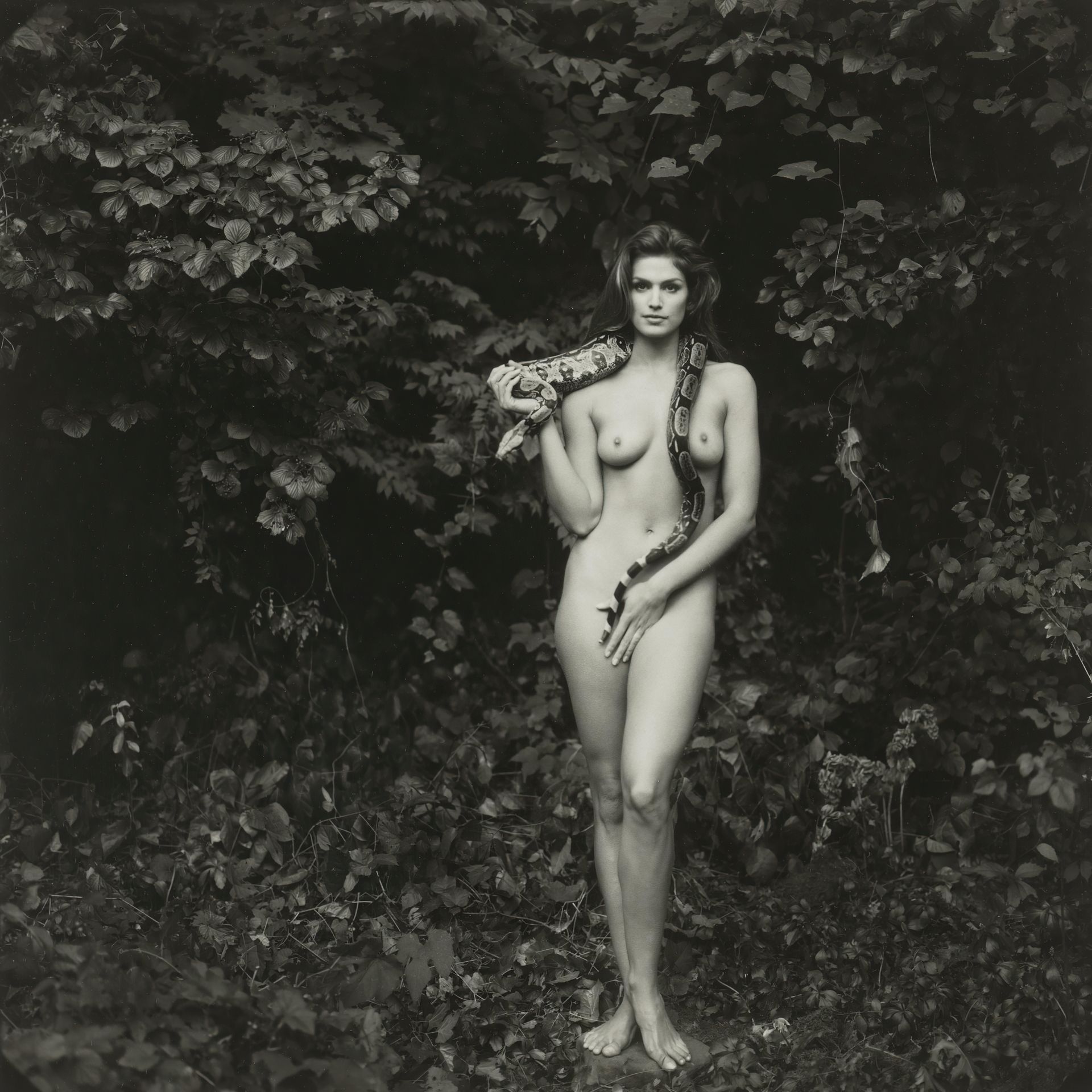 La photo nue colorisée de Cindy Crawford par Annie Leibovitz est ici (1993). La jeune Cindy a posé complètement nue avec un serpent couvrant son sexe avec sa main. Vous la laisseriez toucher votre python.