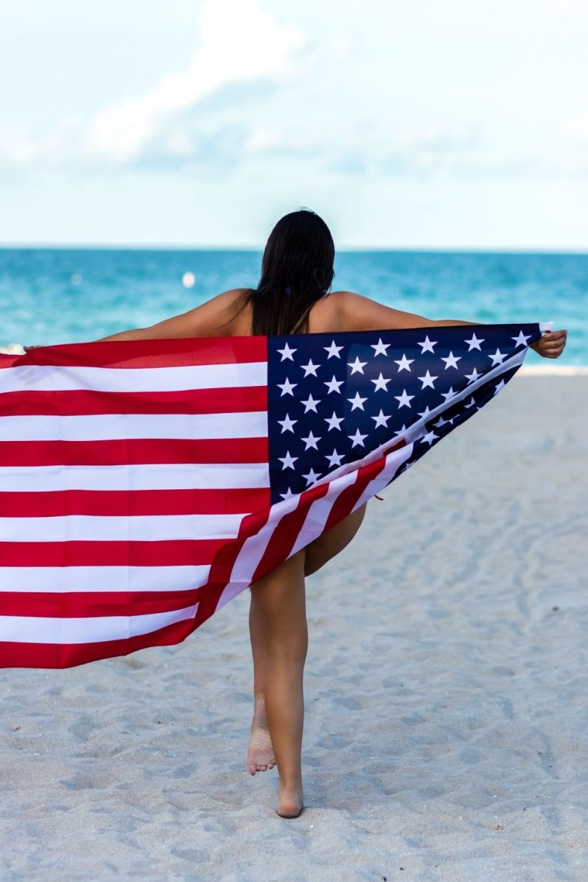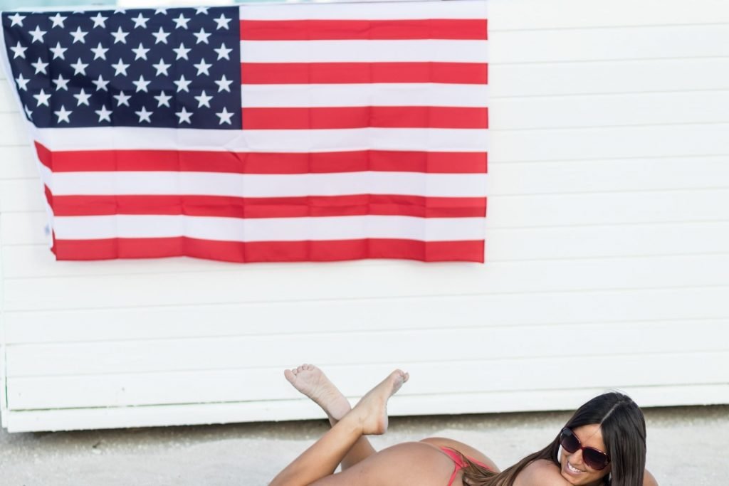 Nouvelle Américaine, mannequin et star de la télé-réalité Claudia Romani célèbre son obtention de la citoyenneté américaine en portant un bikini string rouge et bleu devant un drapeau américain, 04/02/2019. Elle a partagé sa joie d’avoir obtenu la citoyenneté sur les réseaux sociaux. Claudia affichait un large sourire en posant à South Beach avec le drapeau tout en montrant ses atouts à tout le monde.