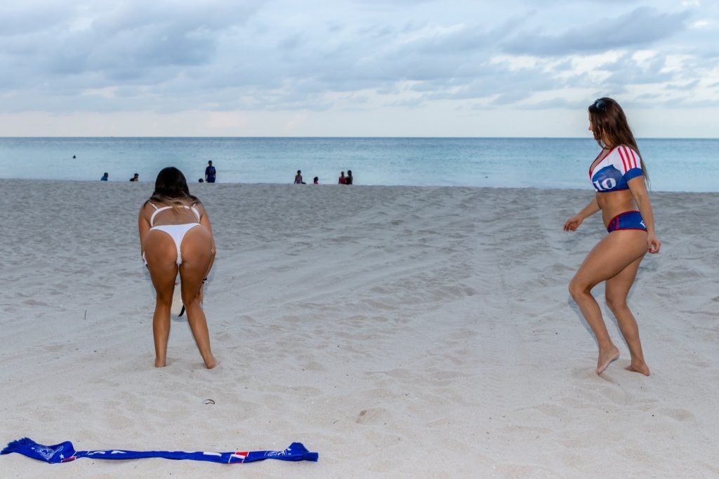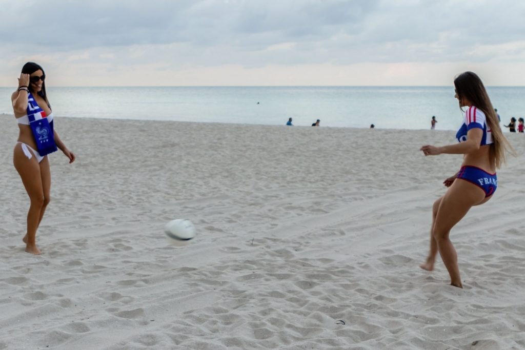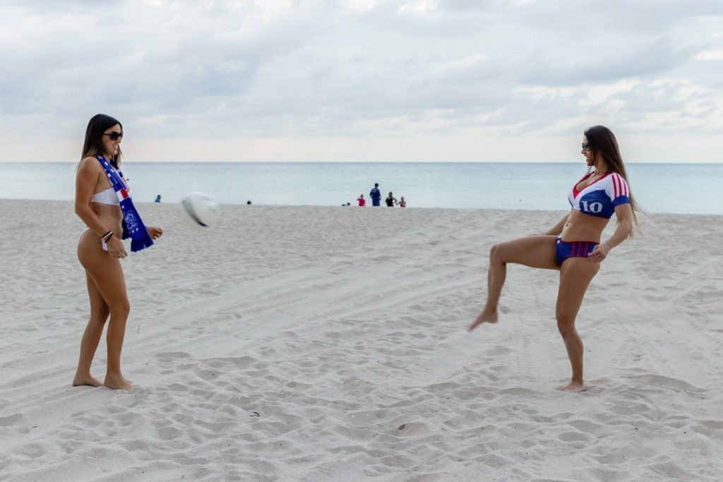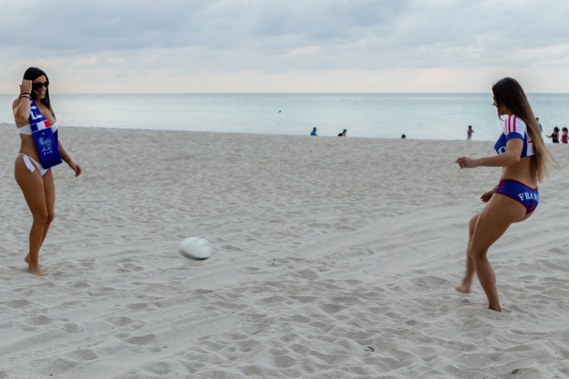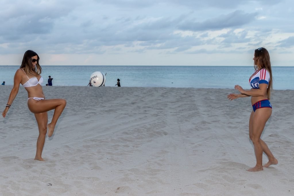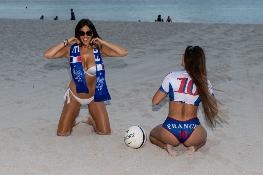 Les mannequins Claudia Romani et Anais Zanotti montrent leur amour pour la France avant le grand match. Coach sportif, cascadeuse, parachutiste et mannequin, Anais est française, tandis que son amie Claudia a participé à l’émission de télé-réalité française “Secret Story”. Toutes deux étaient sur la plage à jouer avec un ballon et à exhiber leurs courbes durement acquises, 07/05/2018.