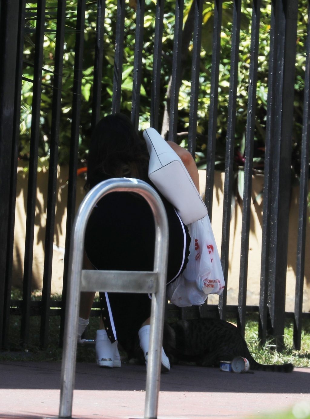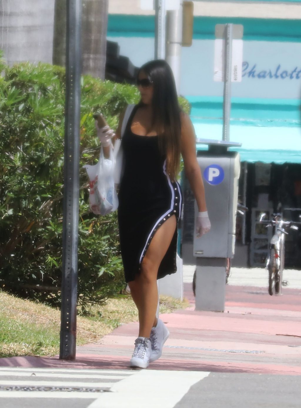 Claudia Romani nourrit les chats du quartier pendant l’urgence du coronavirus à Miami Beach, 22/03/2020. Claudia a opté pour une robe sportive noire fendue et des baskets compensées blanches ainsi que des gants de protection tout en portant des sacs de nourriture pour chats.