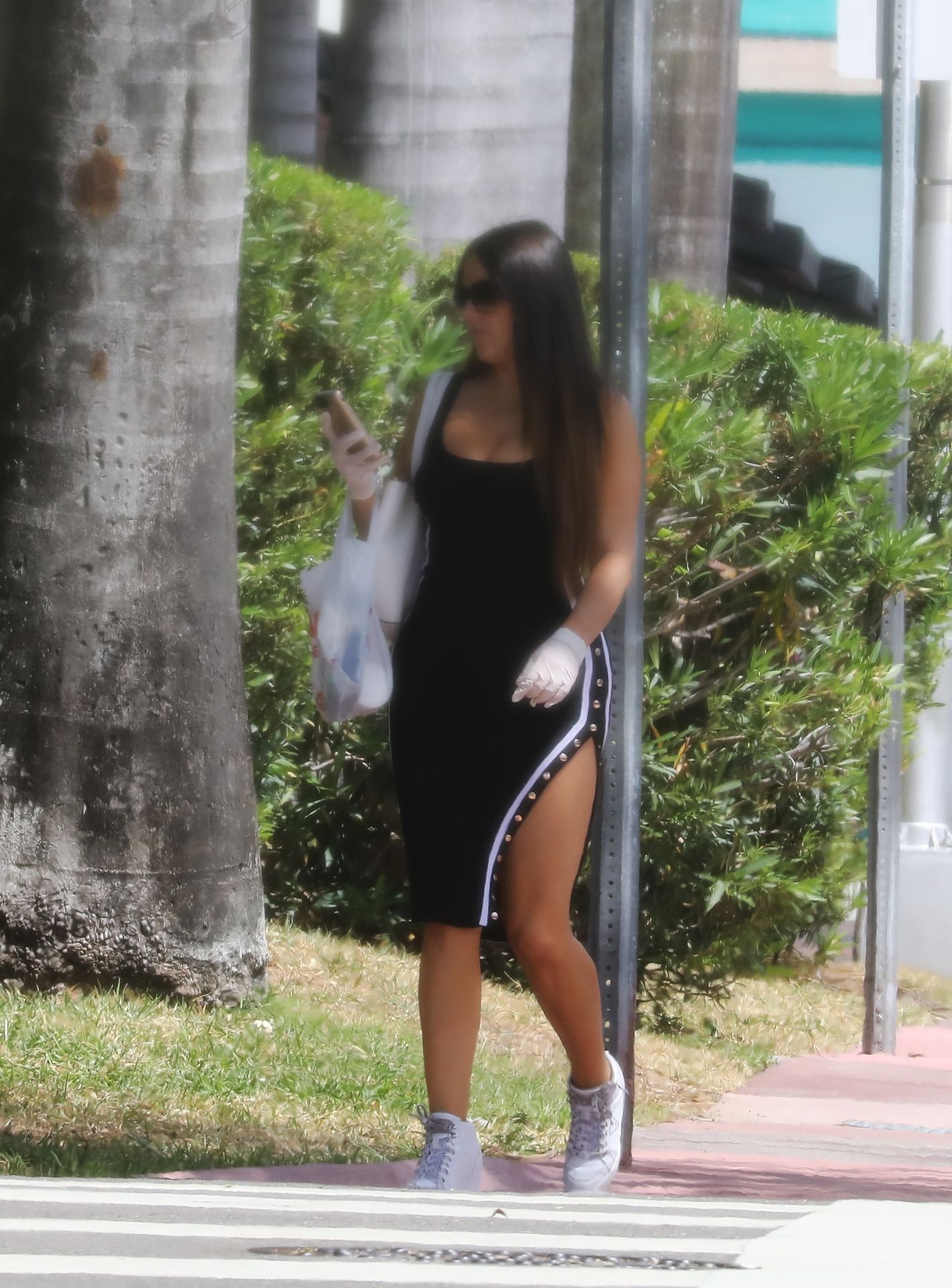Claudia Romani nourrit les chats du quartier pendant l’urgence du coronavirus à Miami Beach, 22/03/2020. Claudia a opté pour une robe sportive noire fendue et des baskets compensées blanches ainsi que des gants de protection tout en portant des sacs de nourriture pour chats.