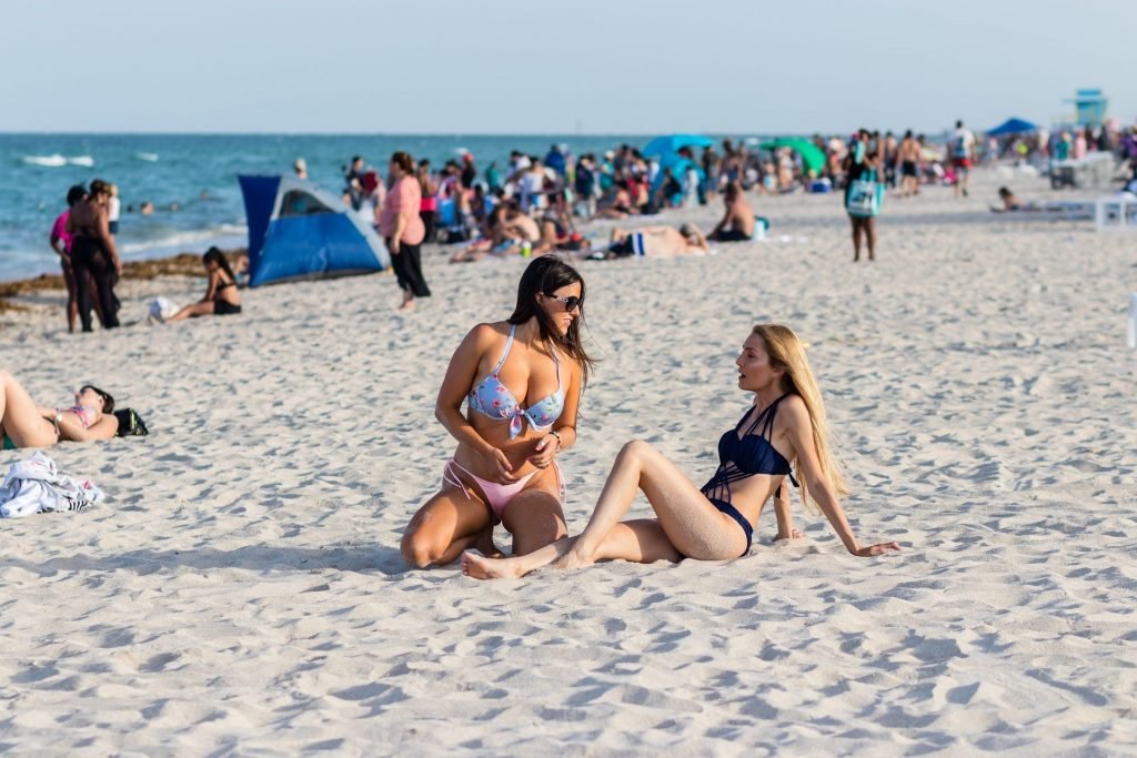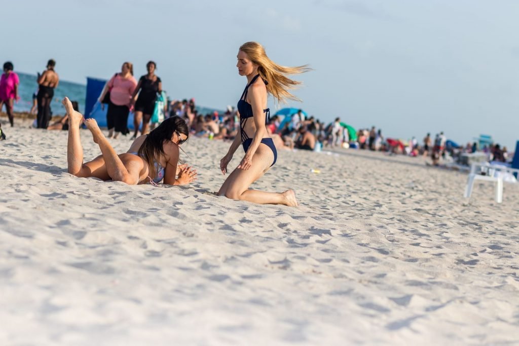 La star de la télé-réalité Claudia Romani et le mannequin italien Lucia Luciano discutent et se promènent sur South Beach, le 08/08/2019. Claudia, comme toujours en string minuscule, et son amie Lucia en maillot de bain tendance passent un excellent moment.