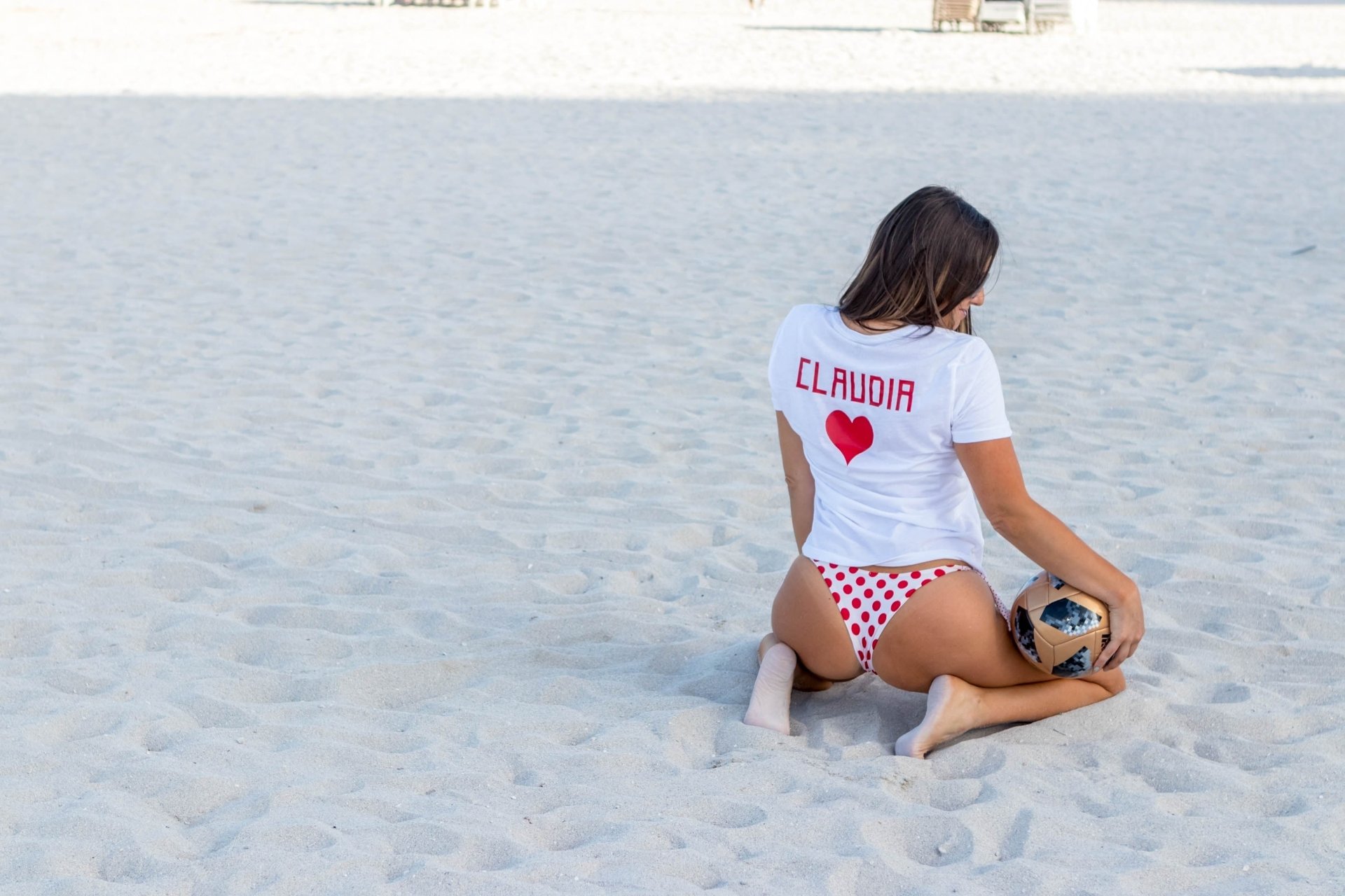 Claudia Romani à South Beach juste avant la finale de la Coupe du Monde portant un t-shirt personnalisé Russie 2018 et un bas de bikini à pois, 14/07/2018. Le mannequin de 36 ans et personnalité de la télé-réalité affichait un grand sourire et ses courbes, s’amusant.