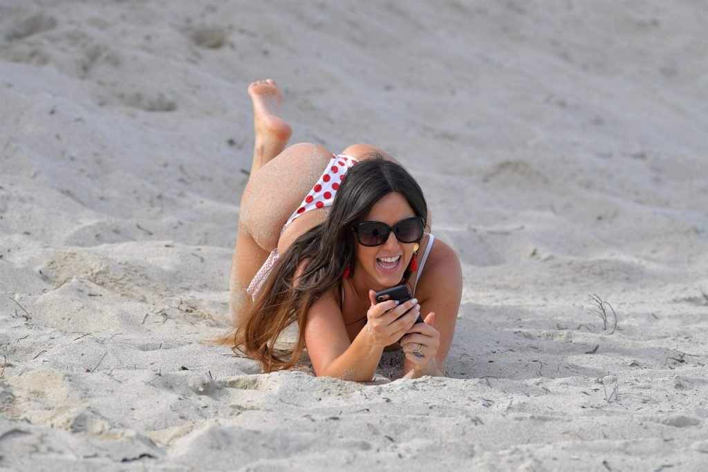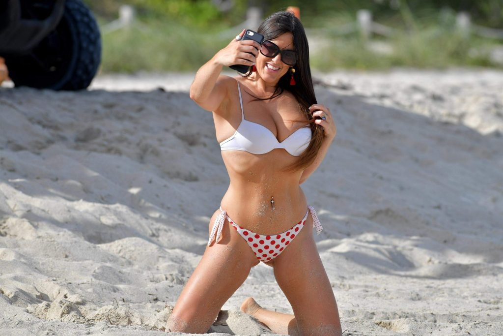 Le mannequin et star de la télé-réalité Claudia Romani, 35 ans, pose en bikini pour une séance photo de la Saint-Valentin sur la plage de Miami, 14/02/2018.
