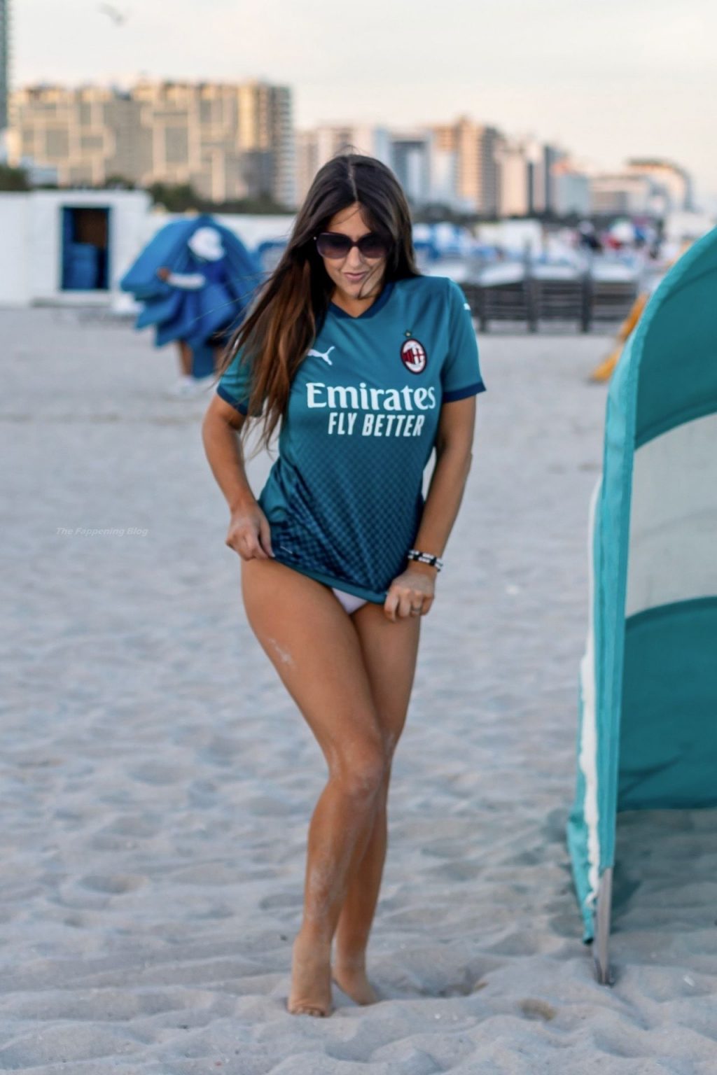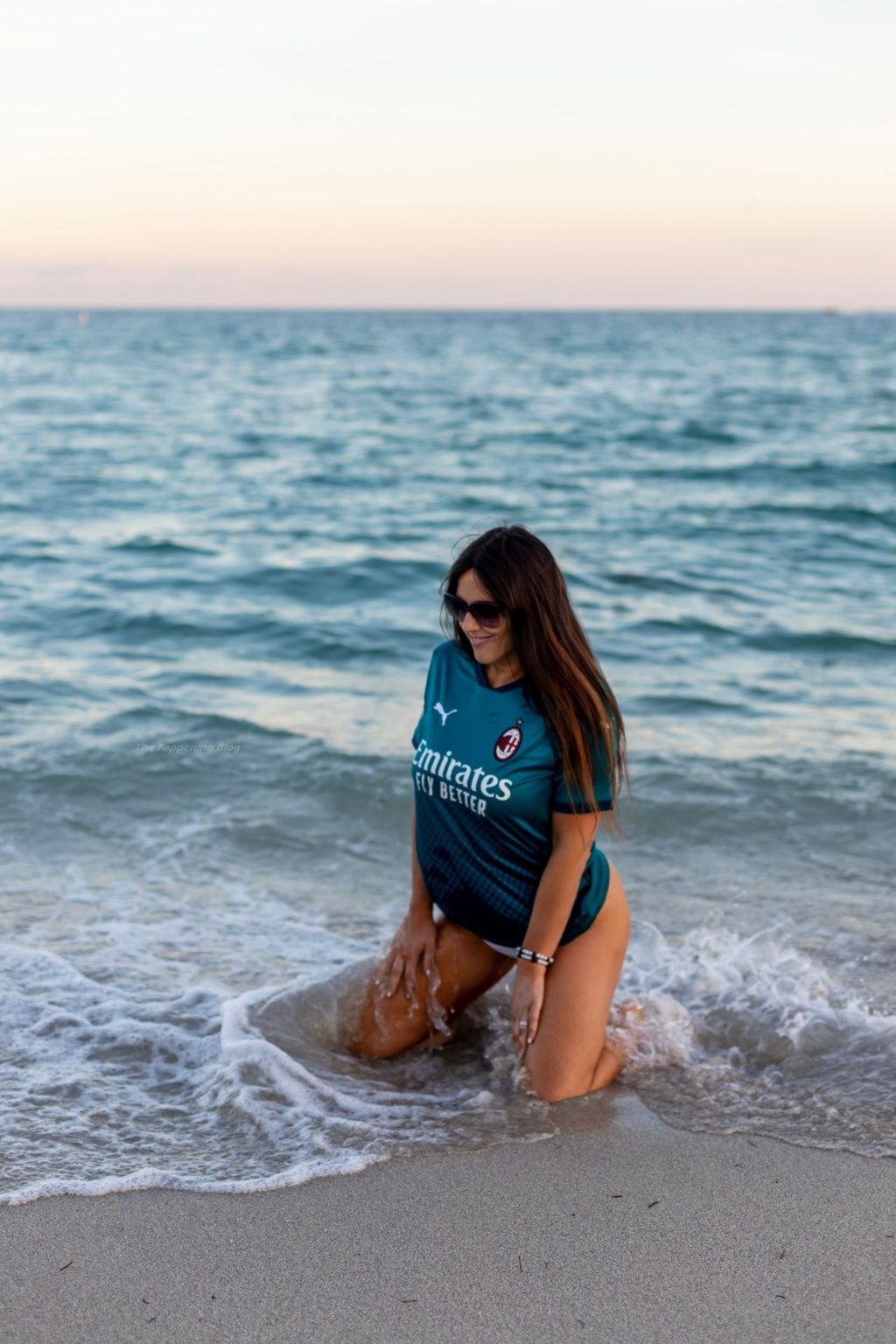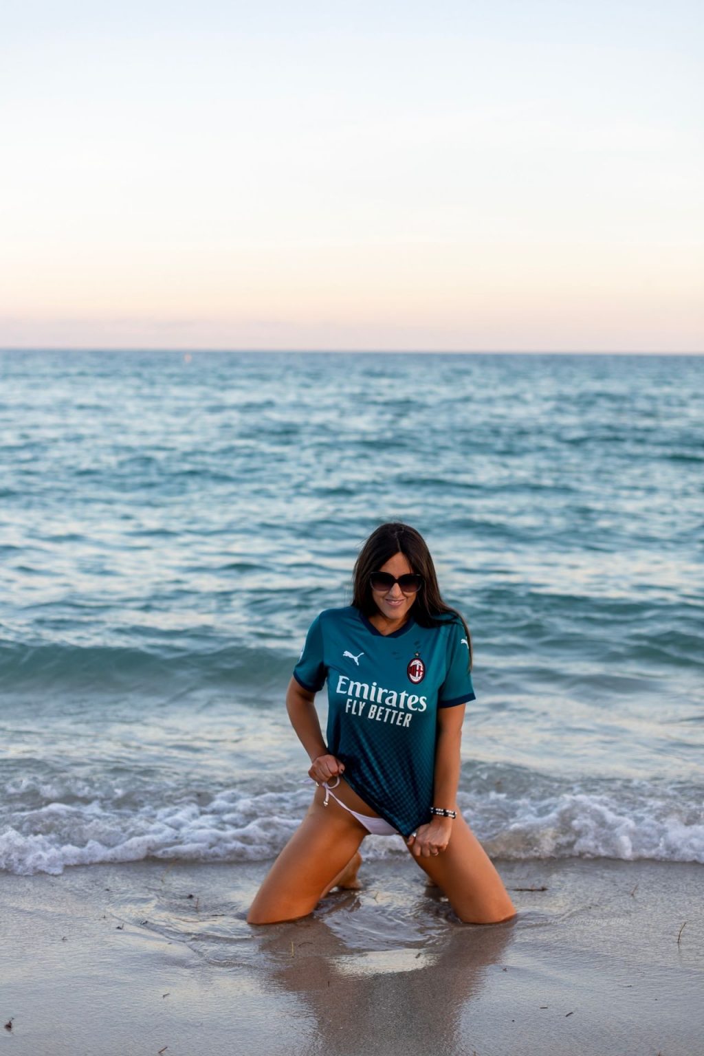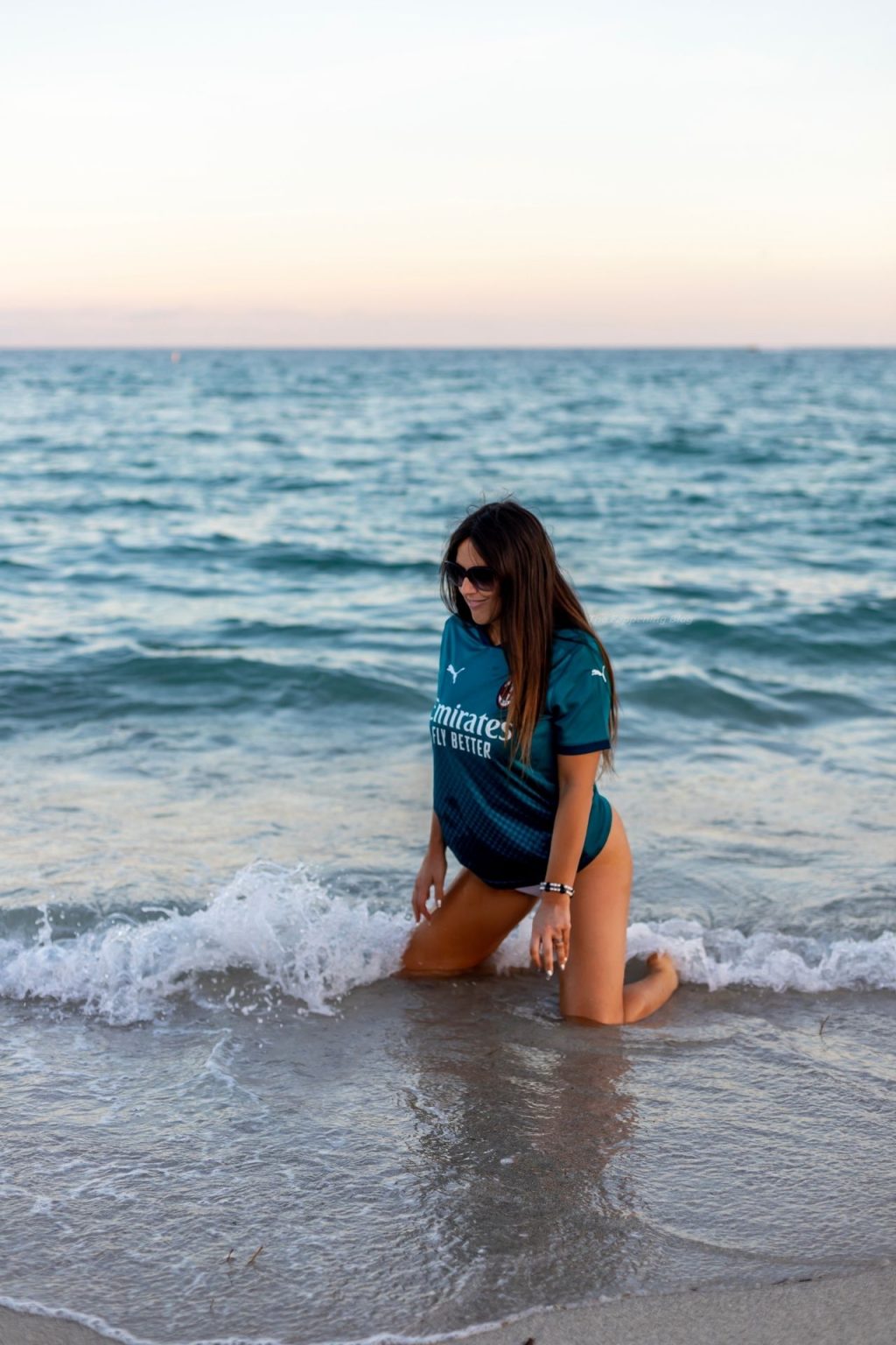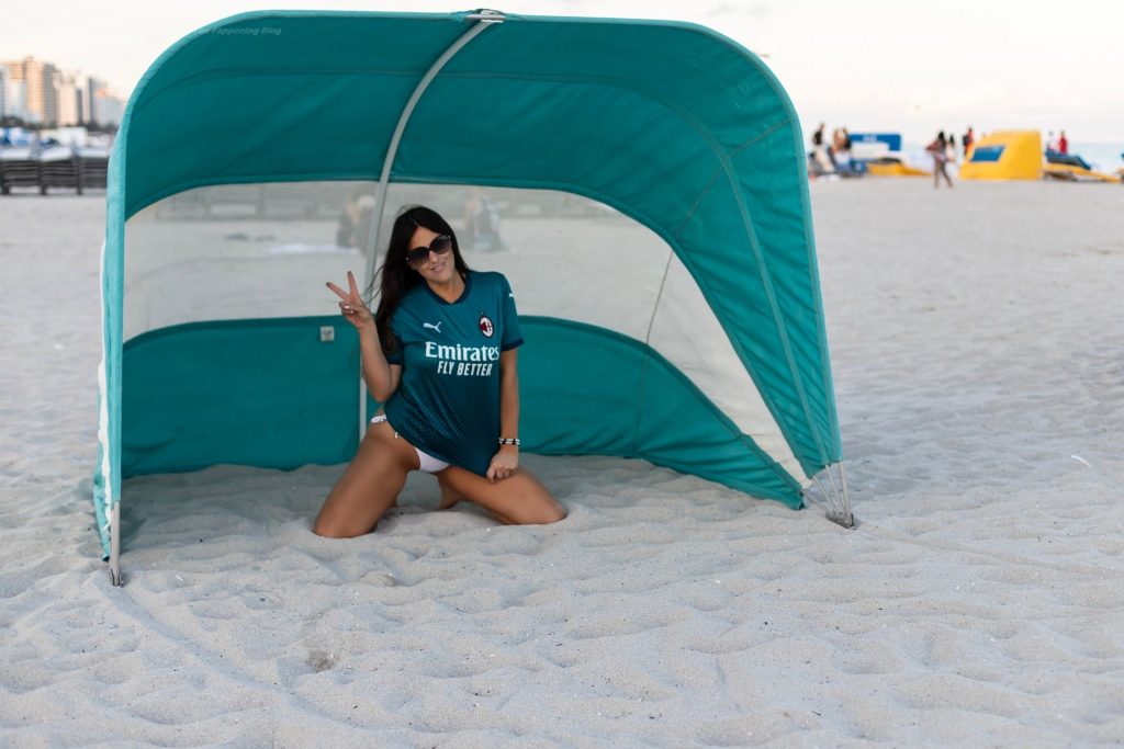 Le mannequin international et personnalité télé Claudia Romani est vue à South Beach portant son troisième maillot bien-aimé de l’AC Milan, ainsi qu’un petit string blanc. La fan de football et arbitre célébrait la grande saison que l’AC Milan est en train de vivre.