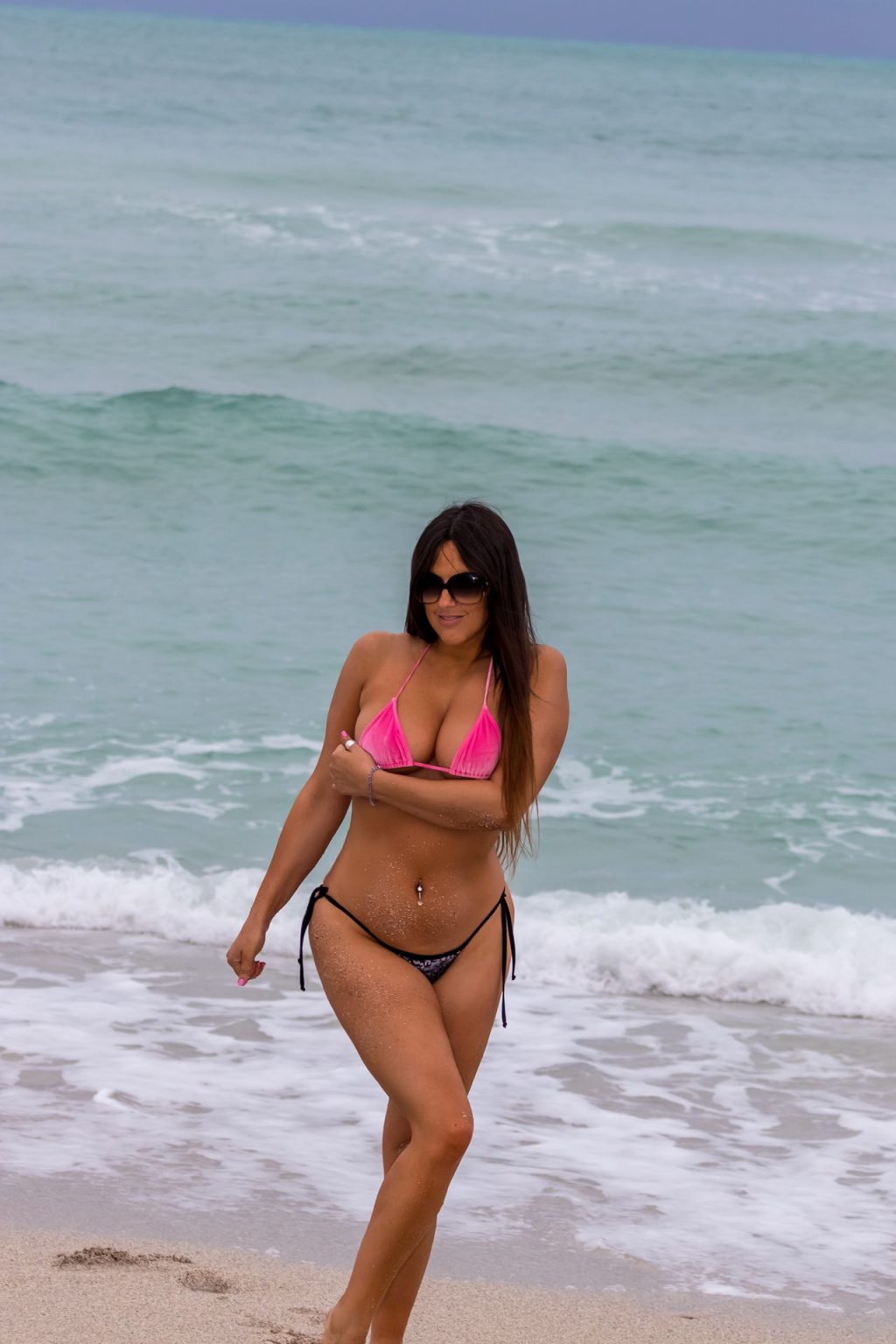 Le mannequin italo-américain et star de la télé-réalité Claudia Romani passe la journée à la plage lors du Festival du Vin et de la Gastronomie à Miami Beach, le 23/02/2020. Elle portait un bikini string dépareillé mettant en valeur ses courbes.