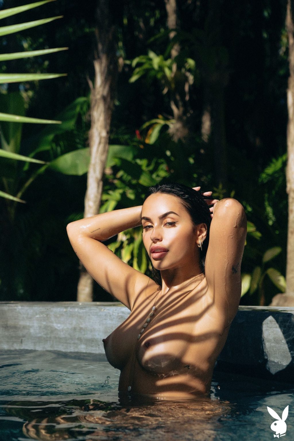 Claudia Tihan montre ses seins nus parfaits et mouillés ainsi que ses fesses dans une piscine lors d’une nouvelle séance photo pour Playboy Plus (juillet 2020).
