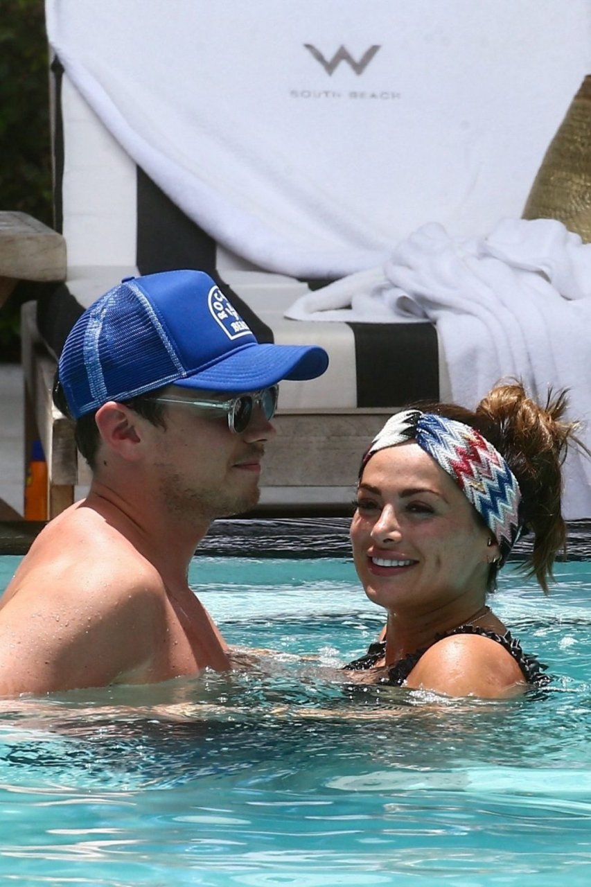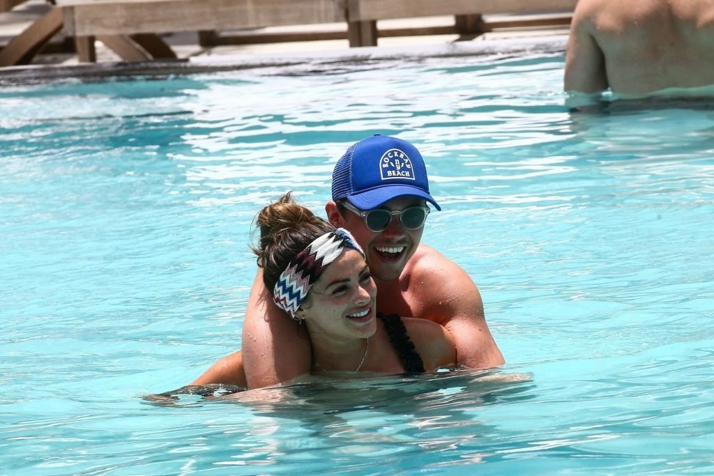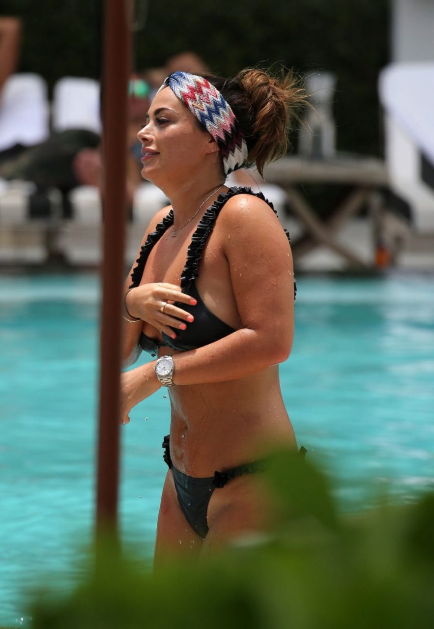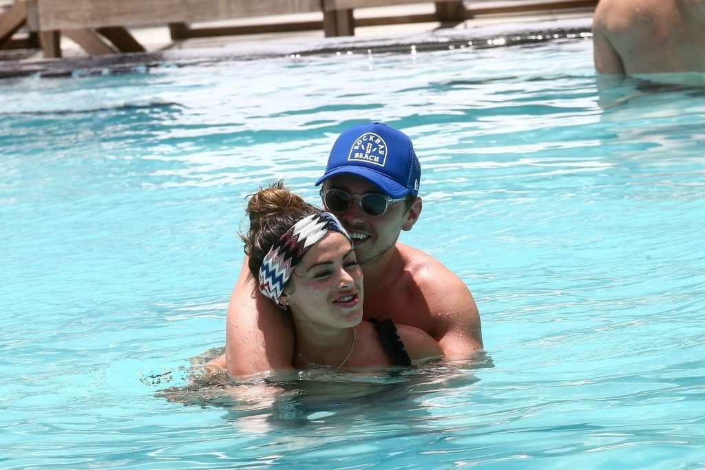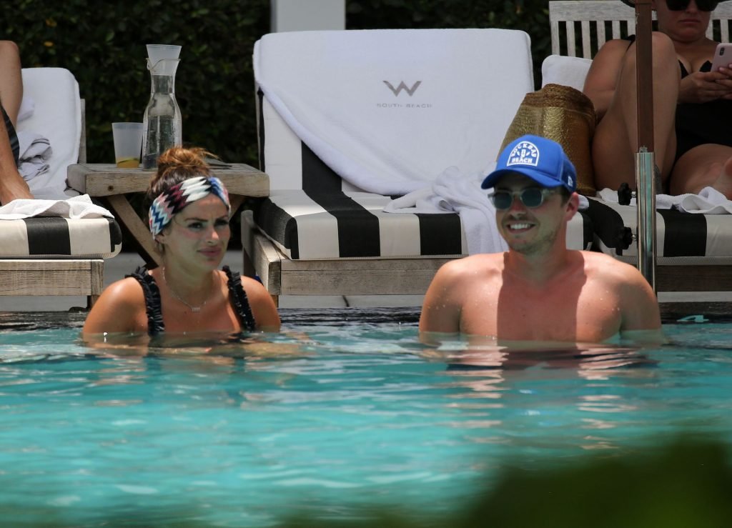 La star de TOWIE Courtney Green porte un bikini noir à volants tout en partageant des démonstrations publiques d’affection dans la piscine de l’hôtel avec son petit ami Calum Bushby à Miami Beach, 07/06/2019.