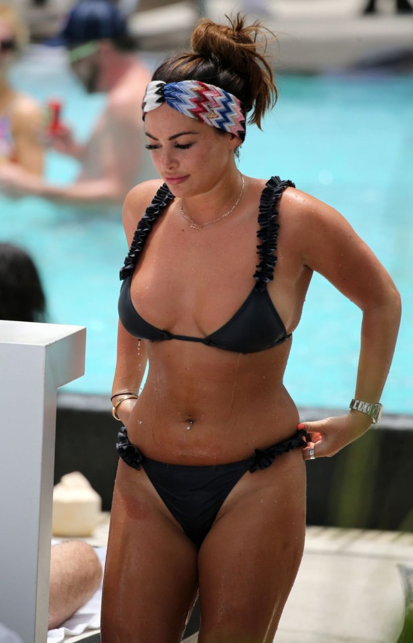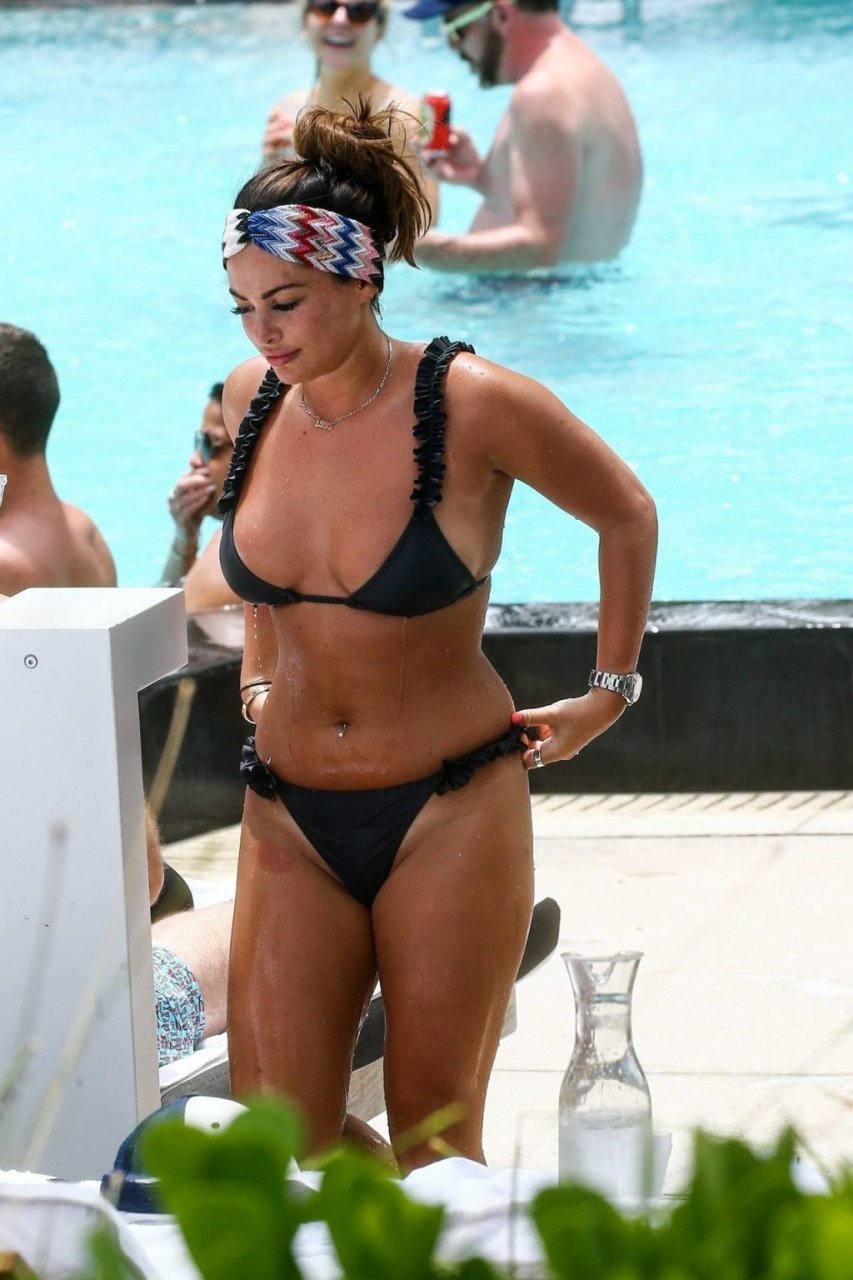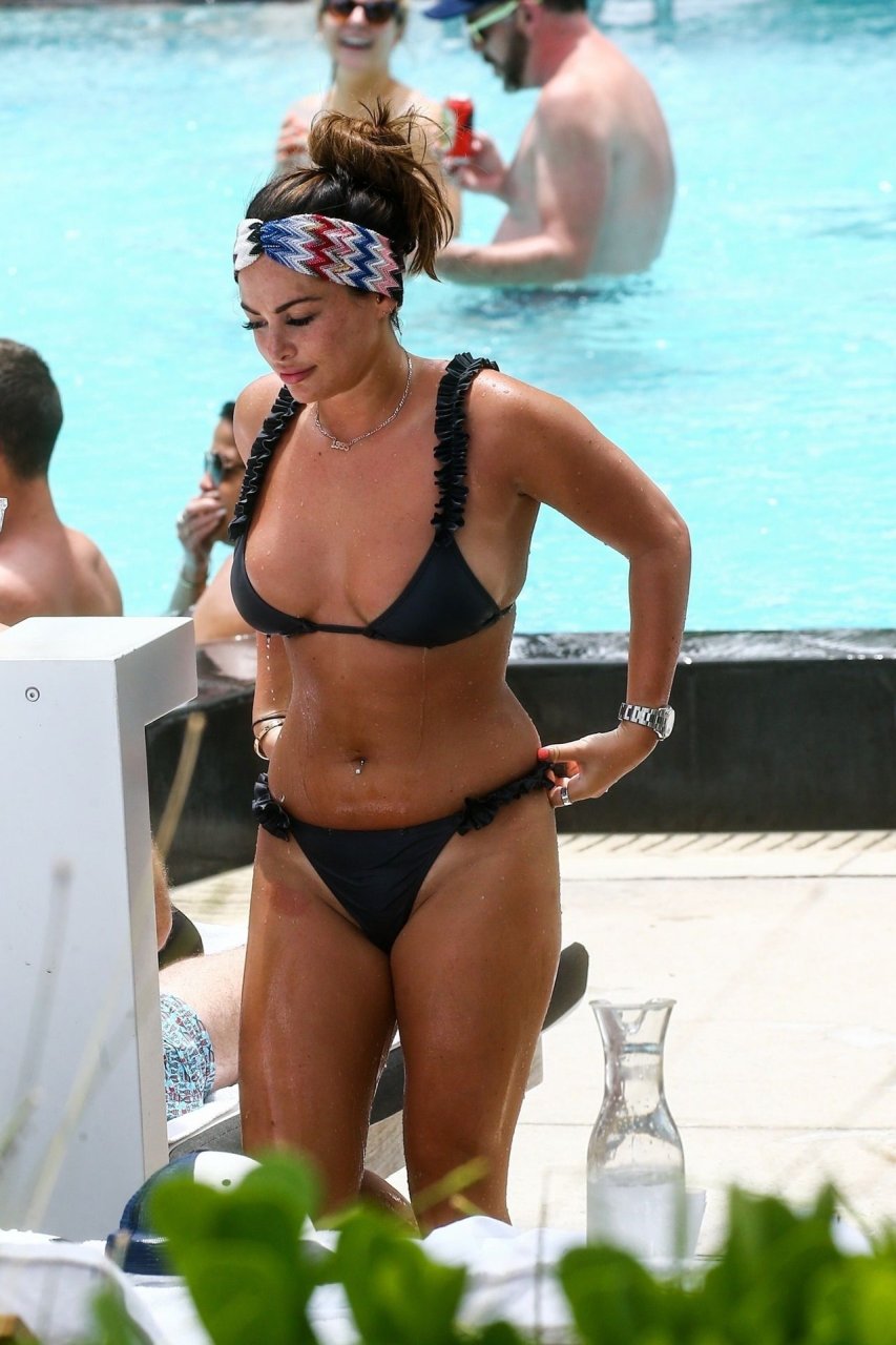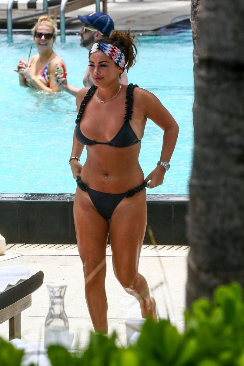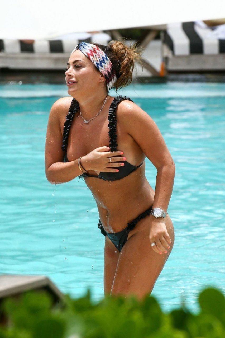 La star de TOWIE Courtney Green porte un bikini noir à volants tout en partageant des démonstrations publiques d’affection dans la piscine de l’hôtel avec son petit ami Calum Bushby à Miami Beach, 07/06/2019.