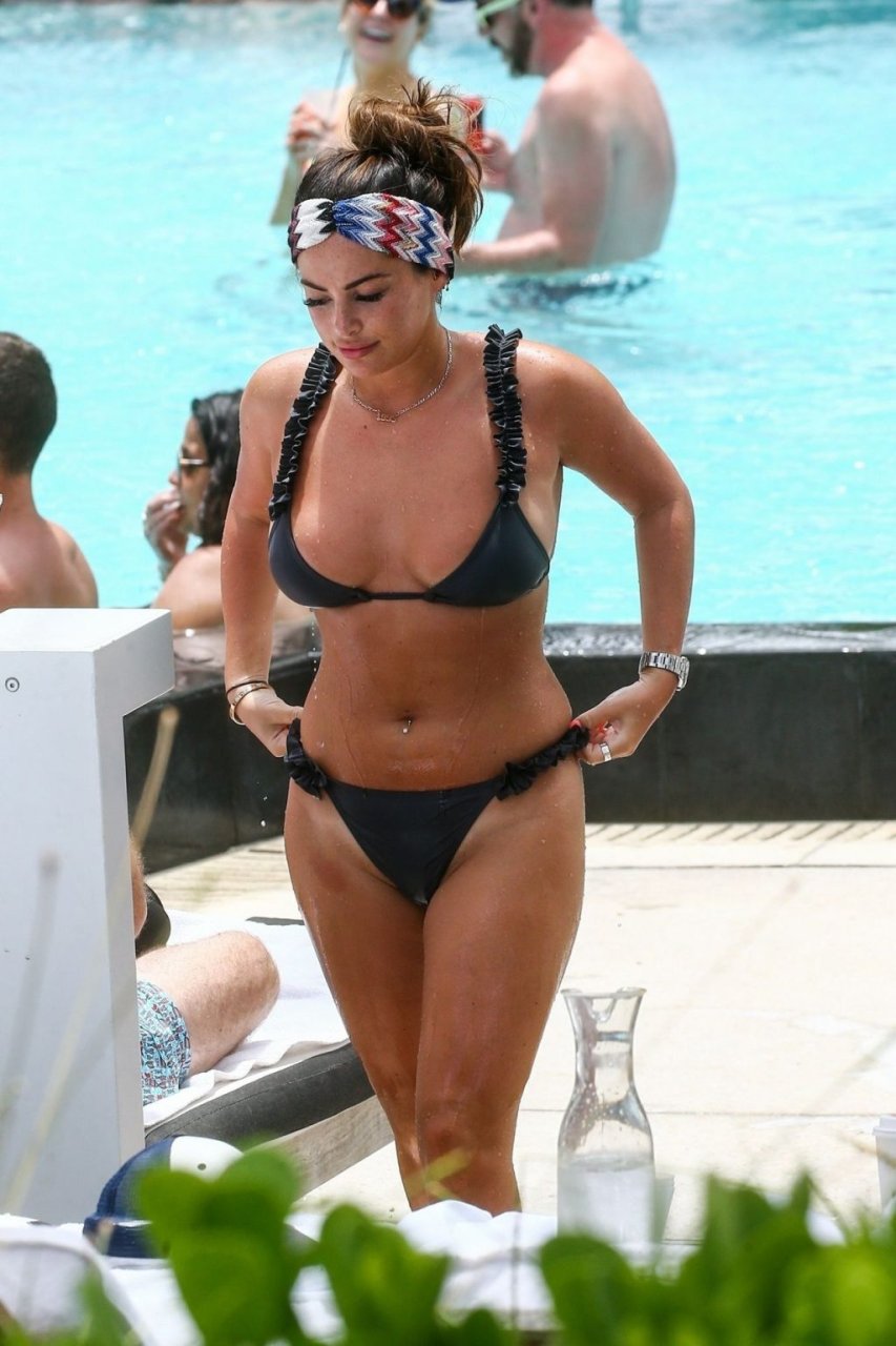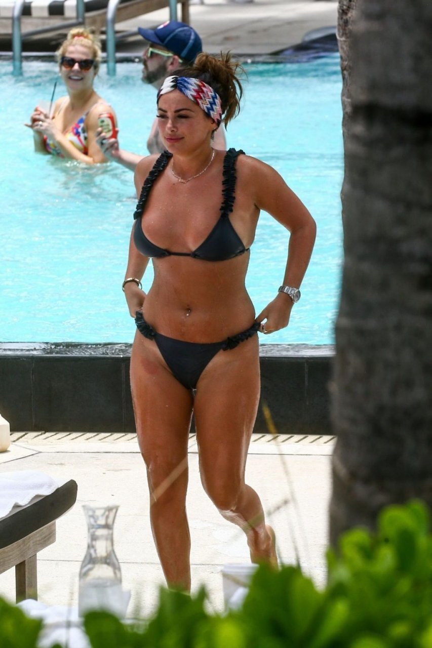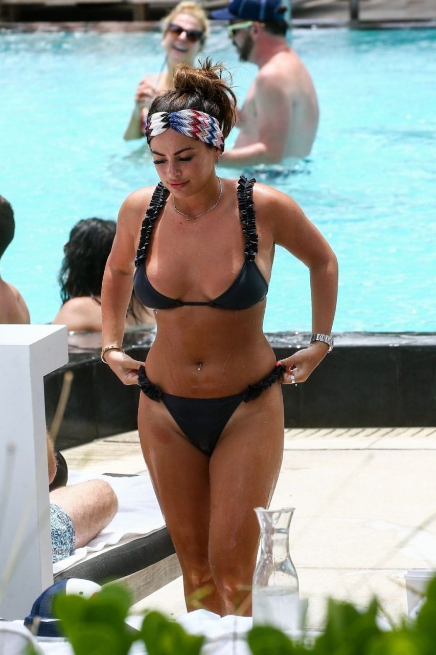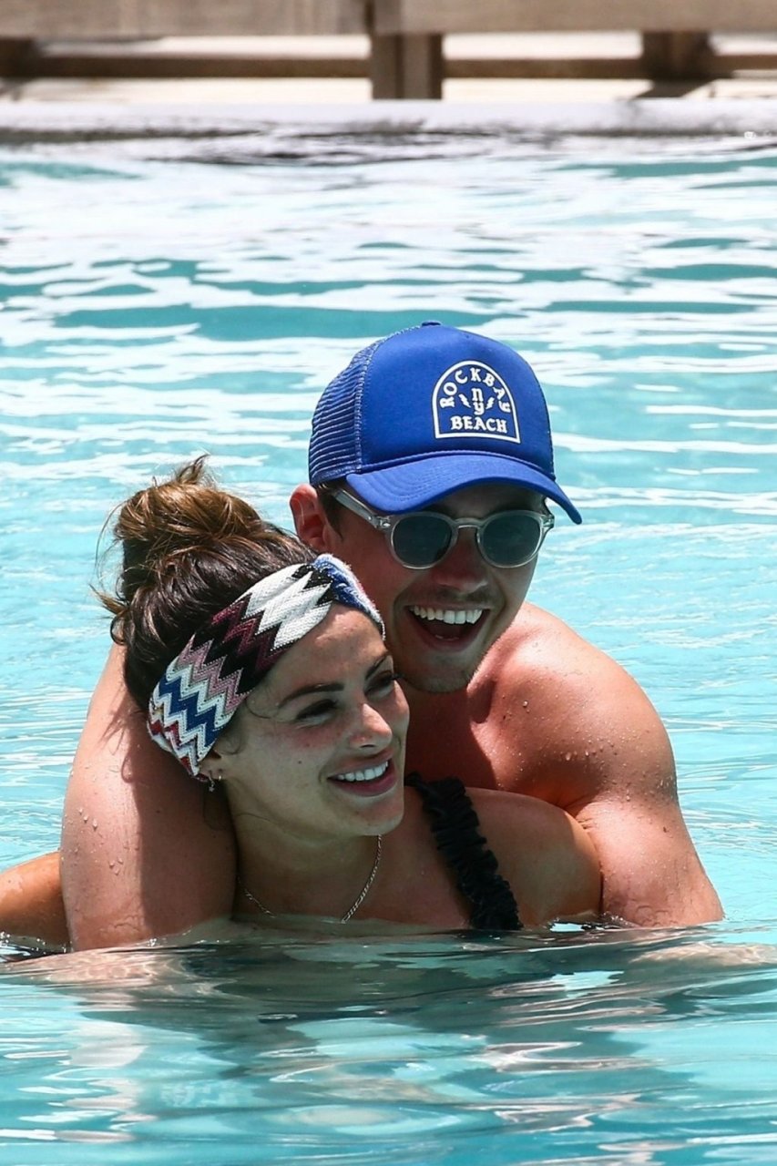 La star de TOWIE Courtney Green porte un bikini noir à volants tout en partageant des démonstrations publiques d’affection dans la piscine de l’hôtel avec son petit ami Calum Bushby à Miami Beach, 07/06/2019.