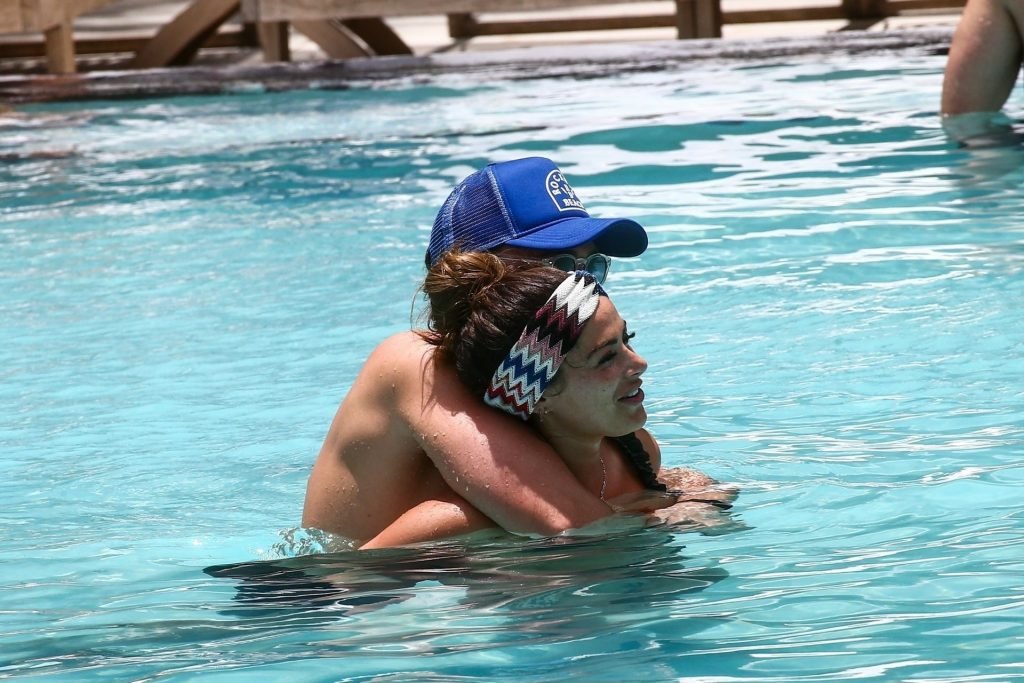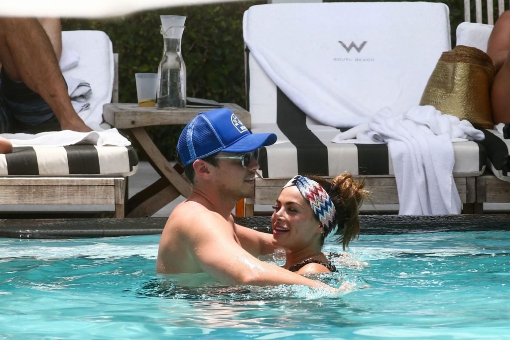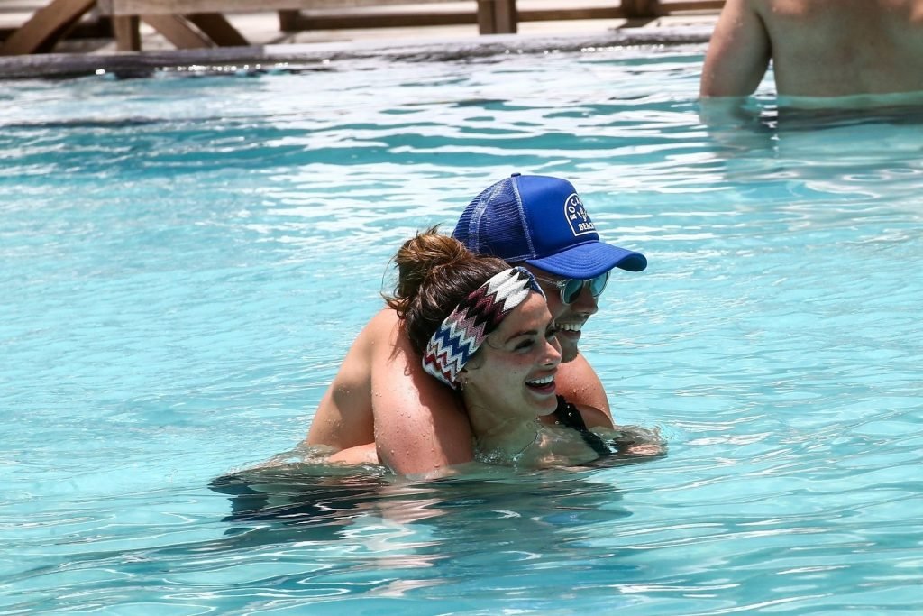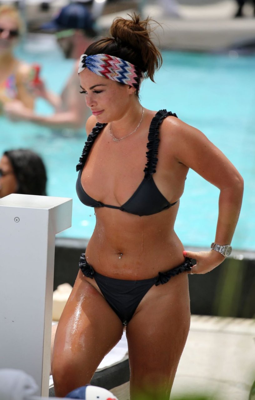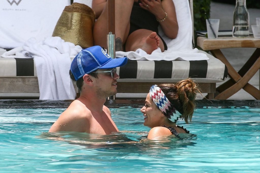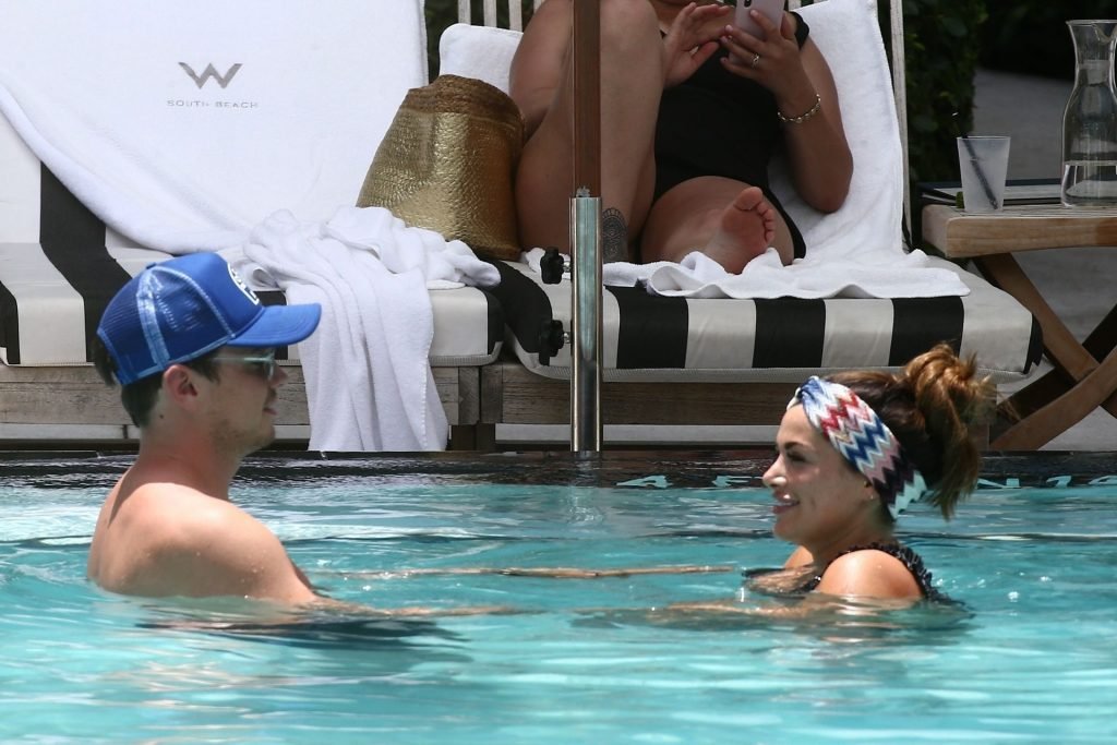 La star de TOWIE Courtney Green porte un bikini noir à volants tout en partageant des démonstrations publiques d’affection dans la piscine de l’hôtel avec son petit ami Calum Bushby à Miami Beach, 07/06/2019.