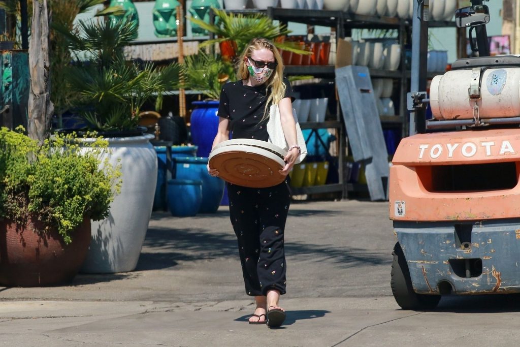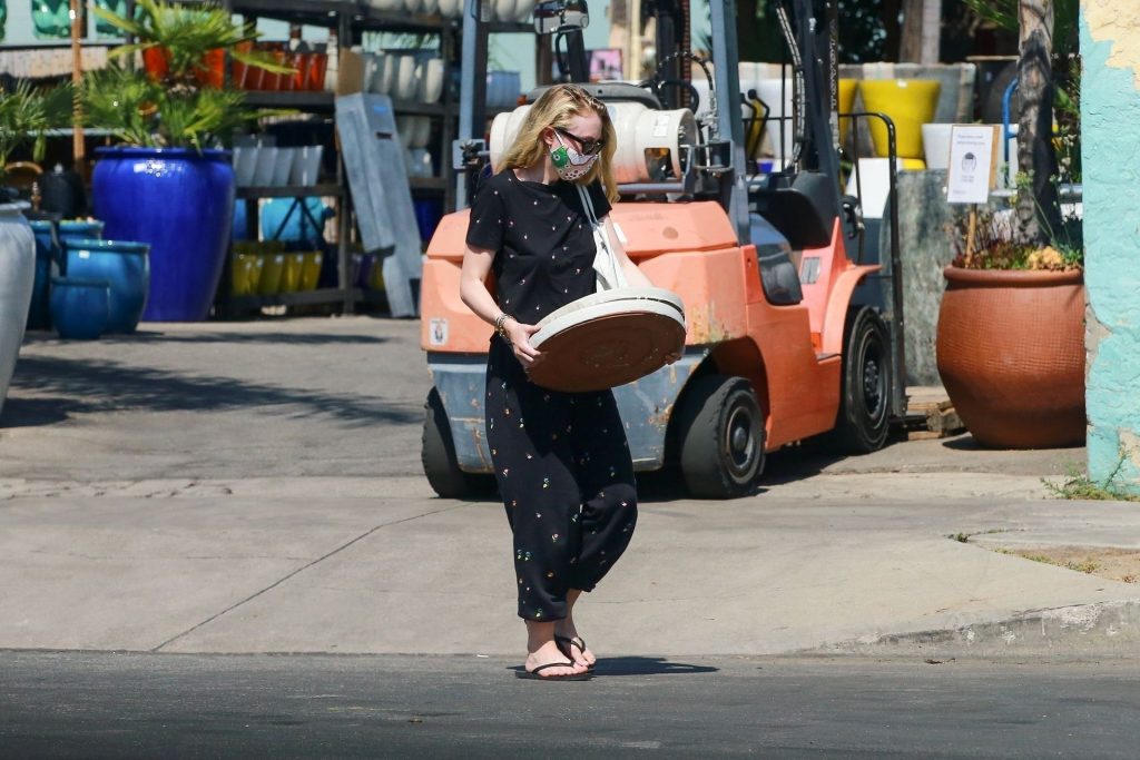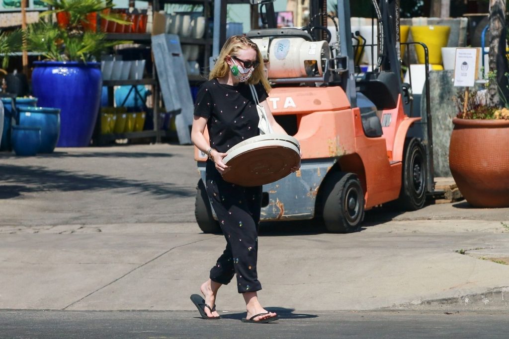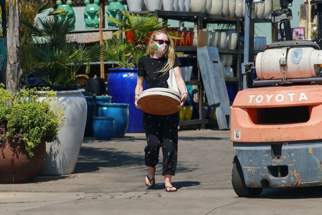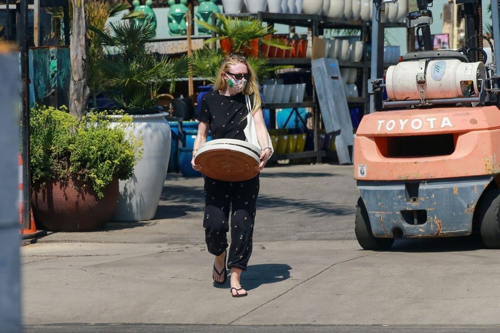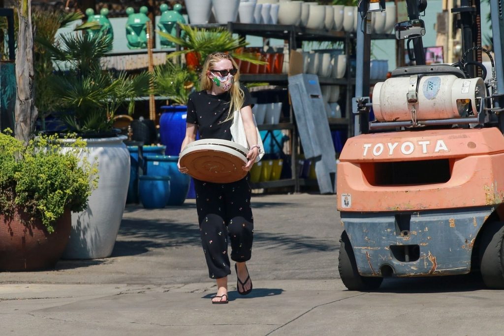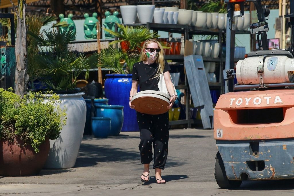 Sans soutien-gorge, Dakota Fanning transporte quelques objets lourds jusqu’à sa voiture alors qu’elle s’arrête dans une pépinière à Los Angeles pendant qu’elle fait du shopping avec sa mère, portant un masque et une tenue noire décontractée, 06/04/2020.
