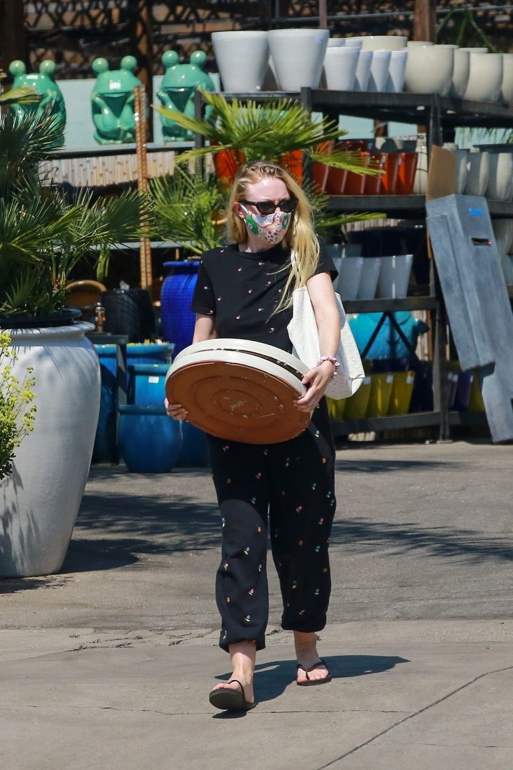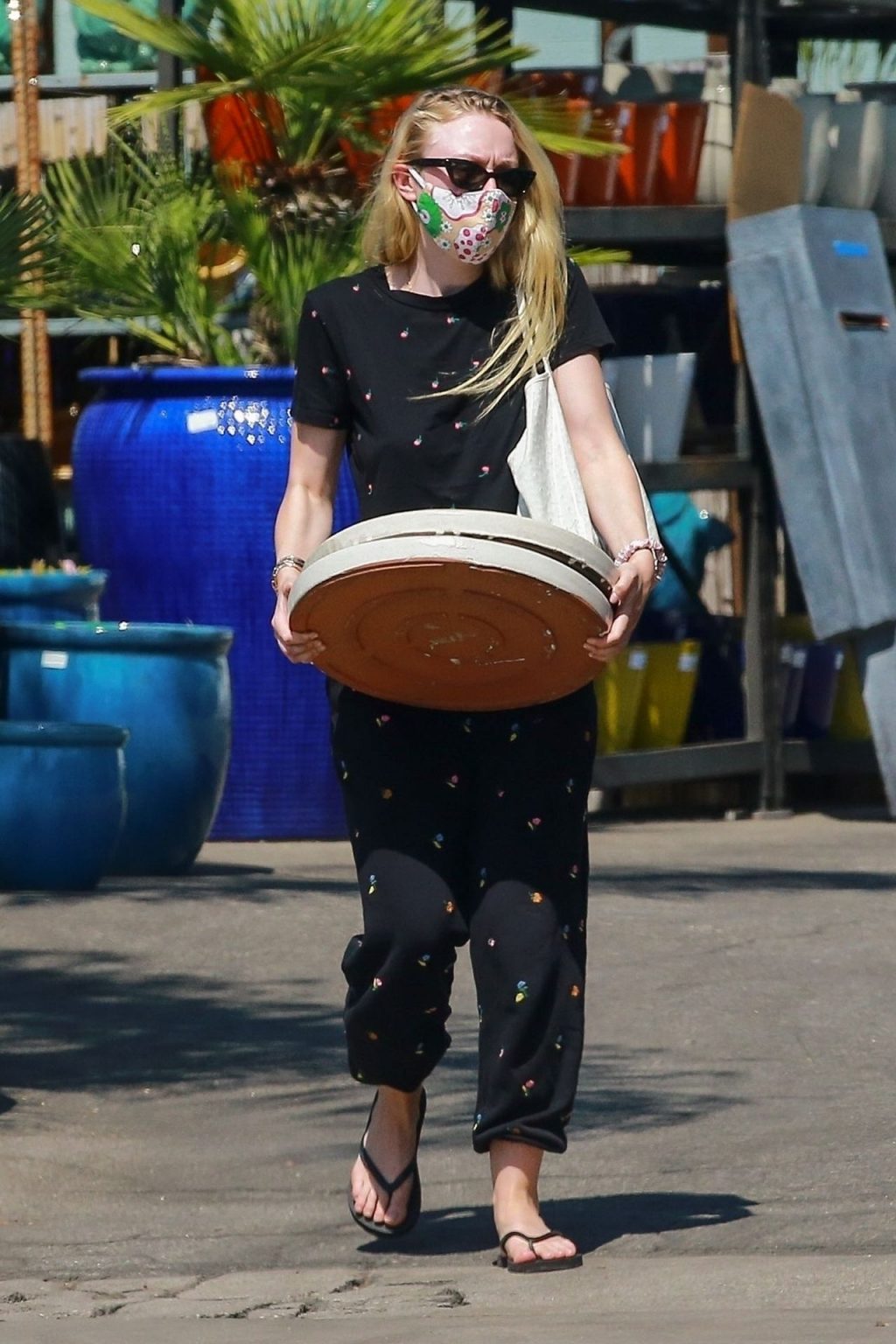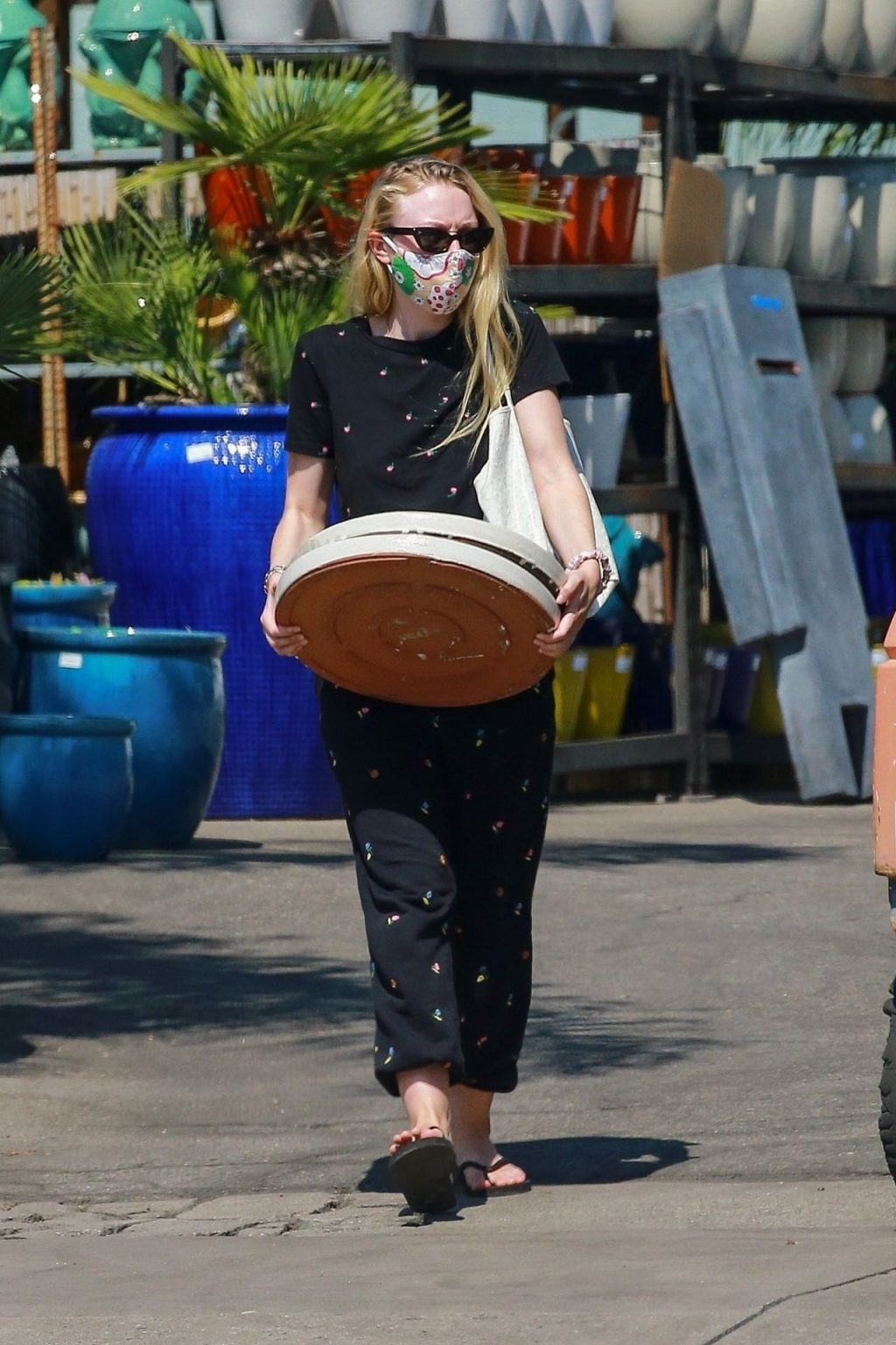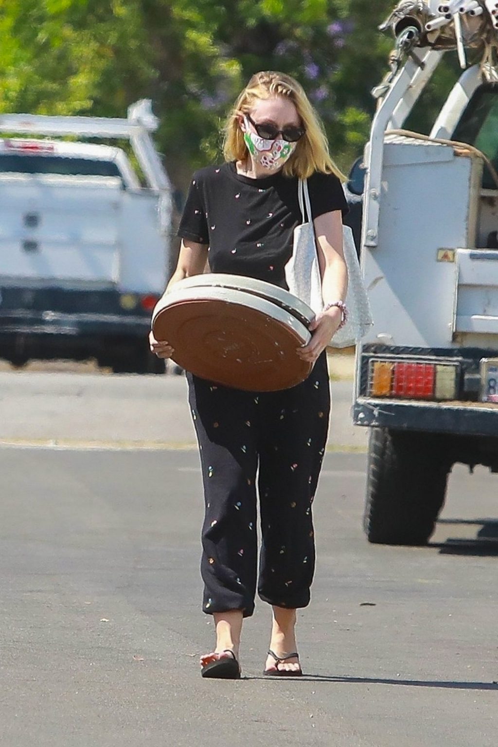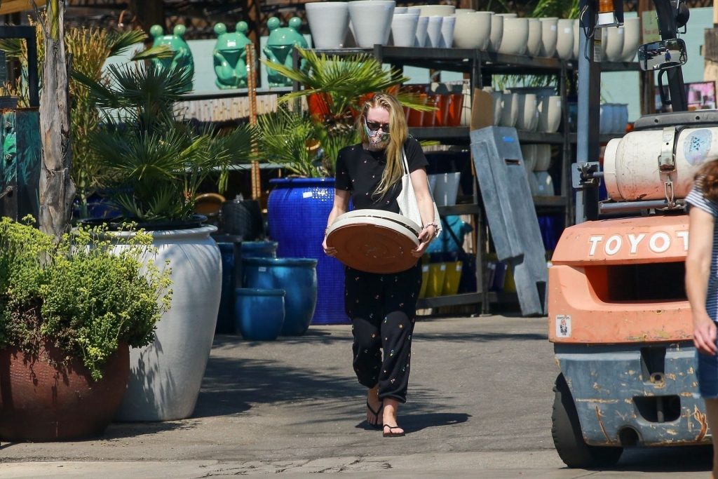 Sans soutien-gorge, Dakota Fanning transporte quelques objets lourds jusqu’à sa voiture alors qu’elle s’arrête dans une pépinière à Los Angeles pendant qu’elle fait du shopping avec sa mère, portant un masque et une tenue noire décontractée, 06/04/2020.