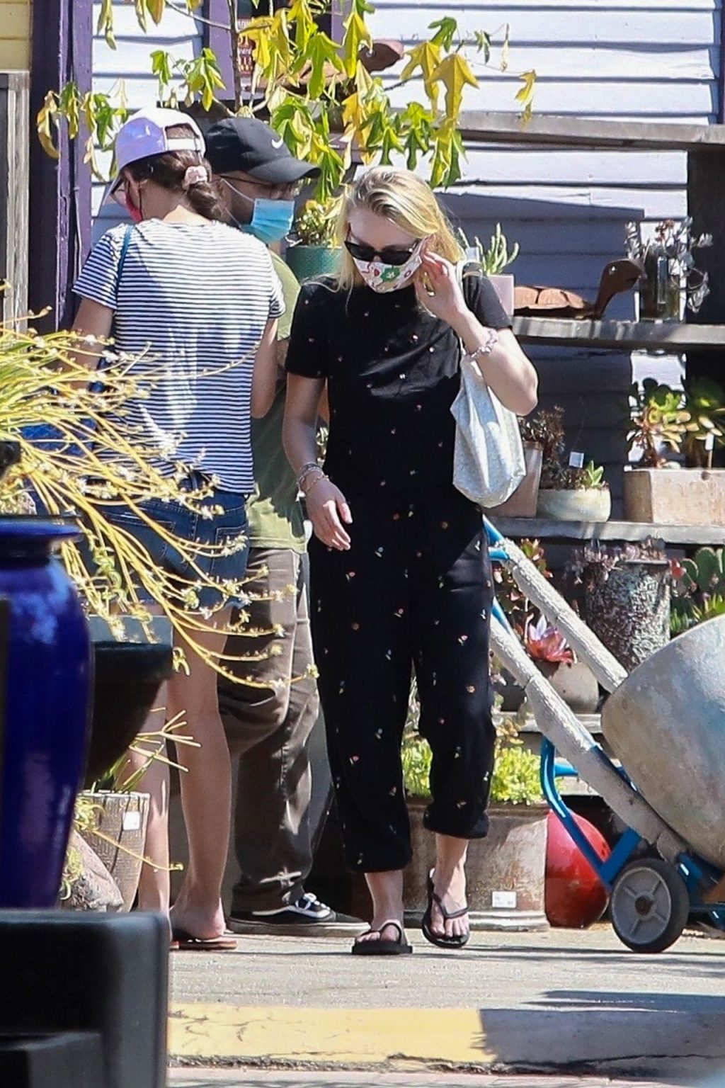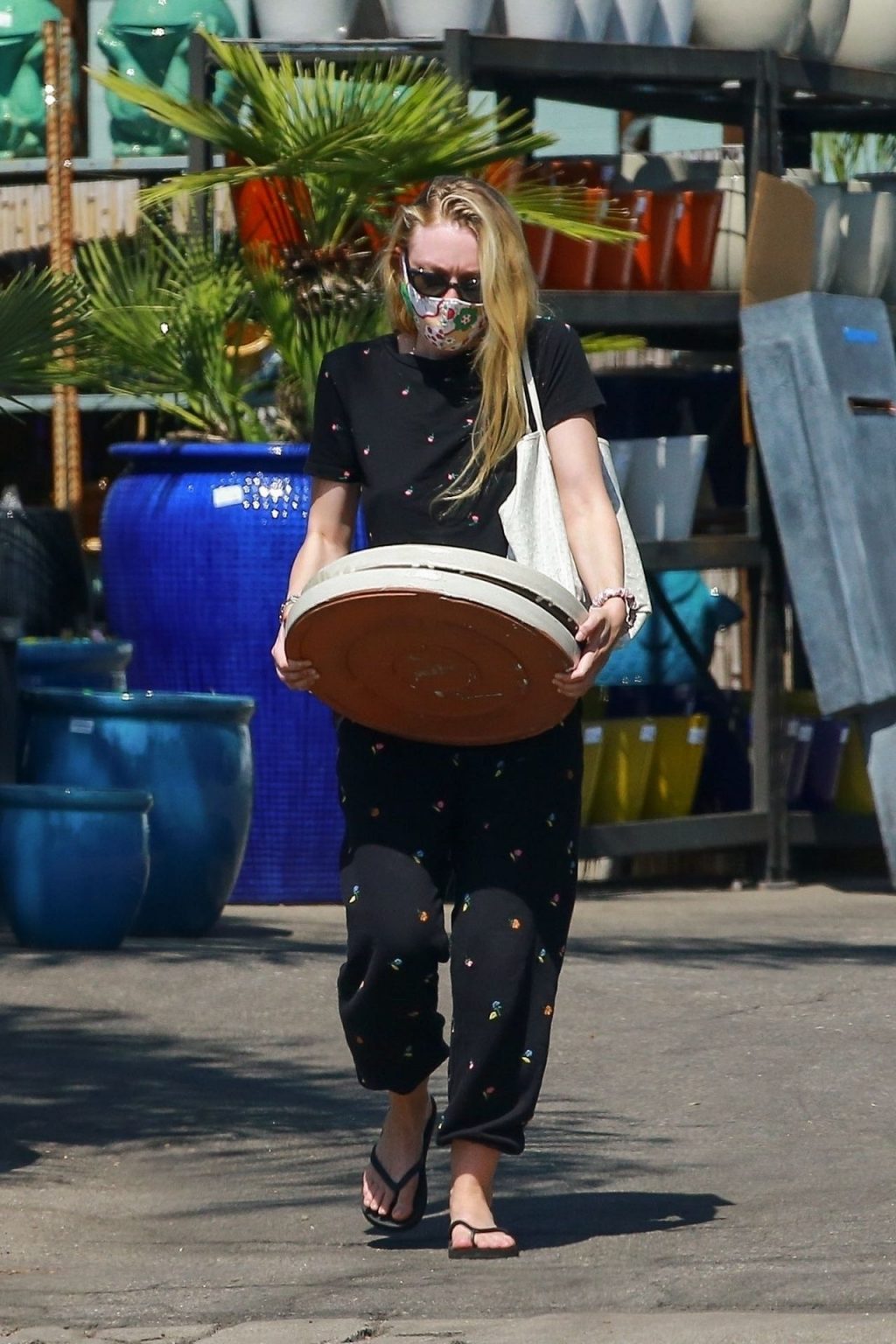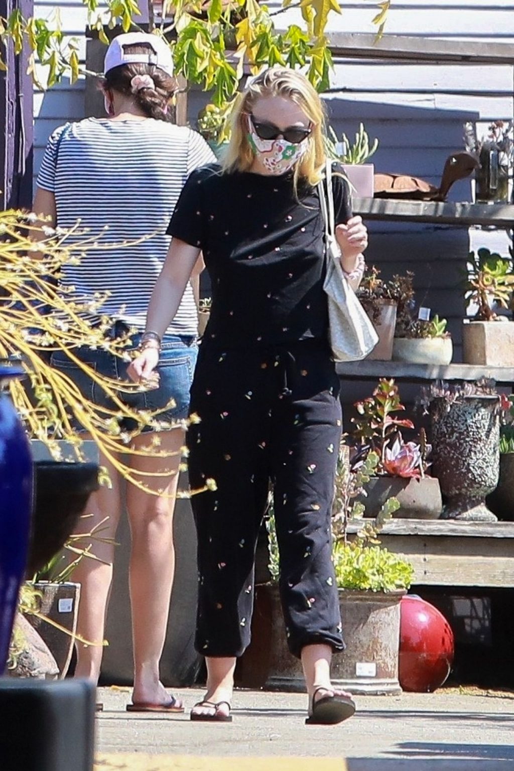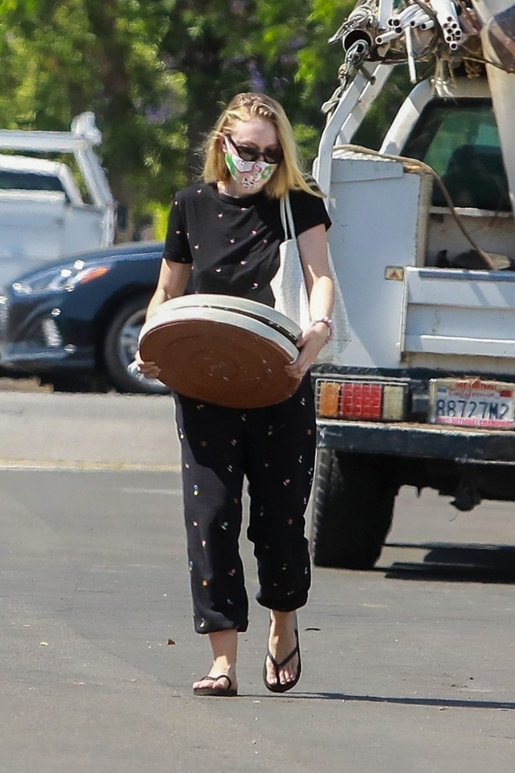 Sans soutien-gorge, Dakota Fanning transporte quelques objets lourds jusqu’à sa voiture alors qu’elle s’arrête dans une pépinière à Los Angeles pendant qu’elle fait du shopping avec sa mère, portant un masque et une tenue noire décontractée, 06/04/2020.