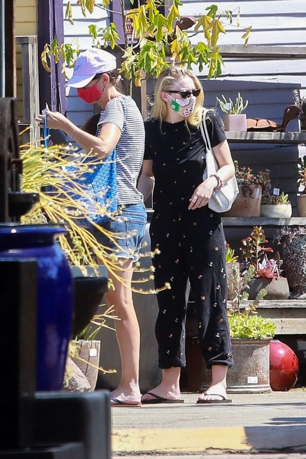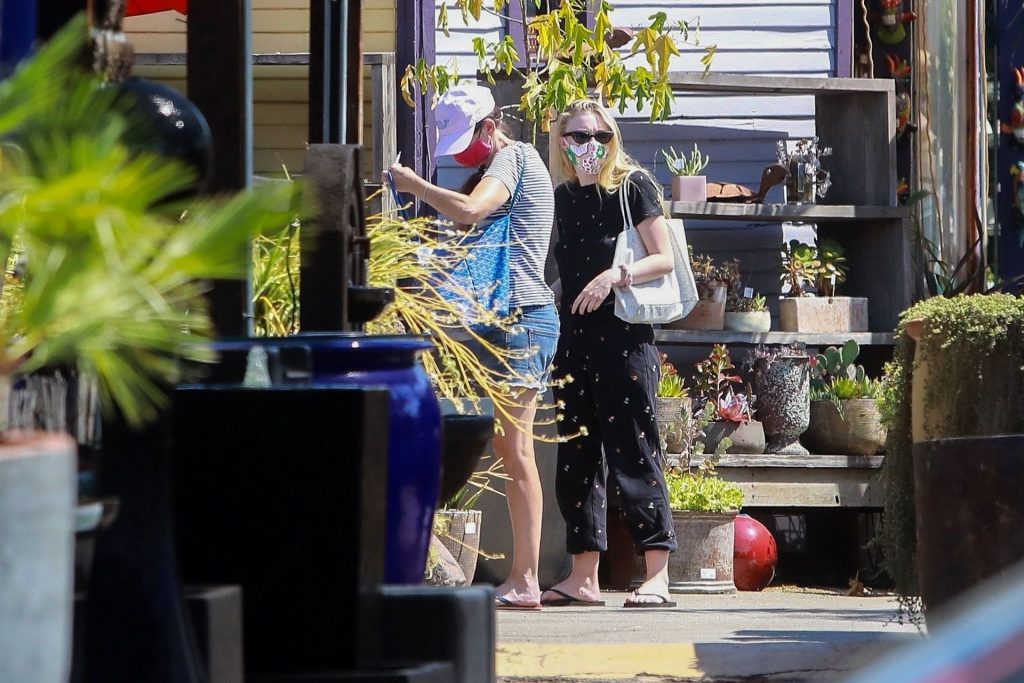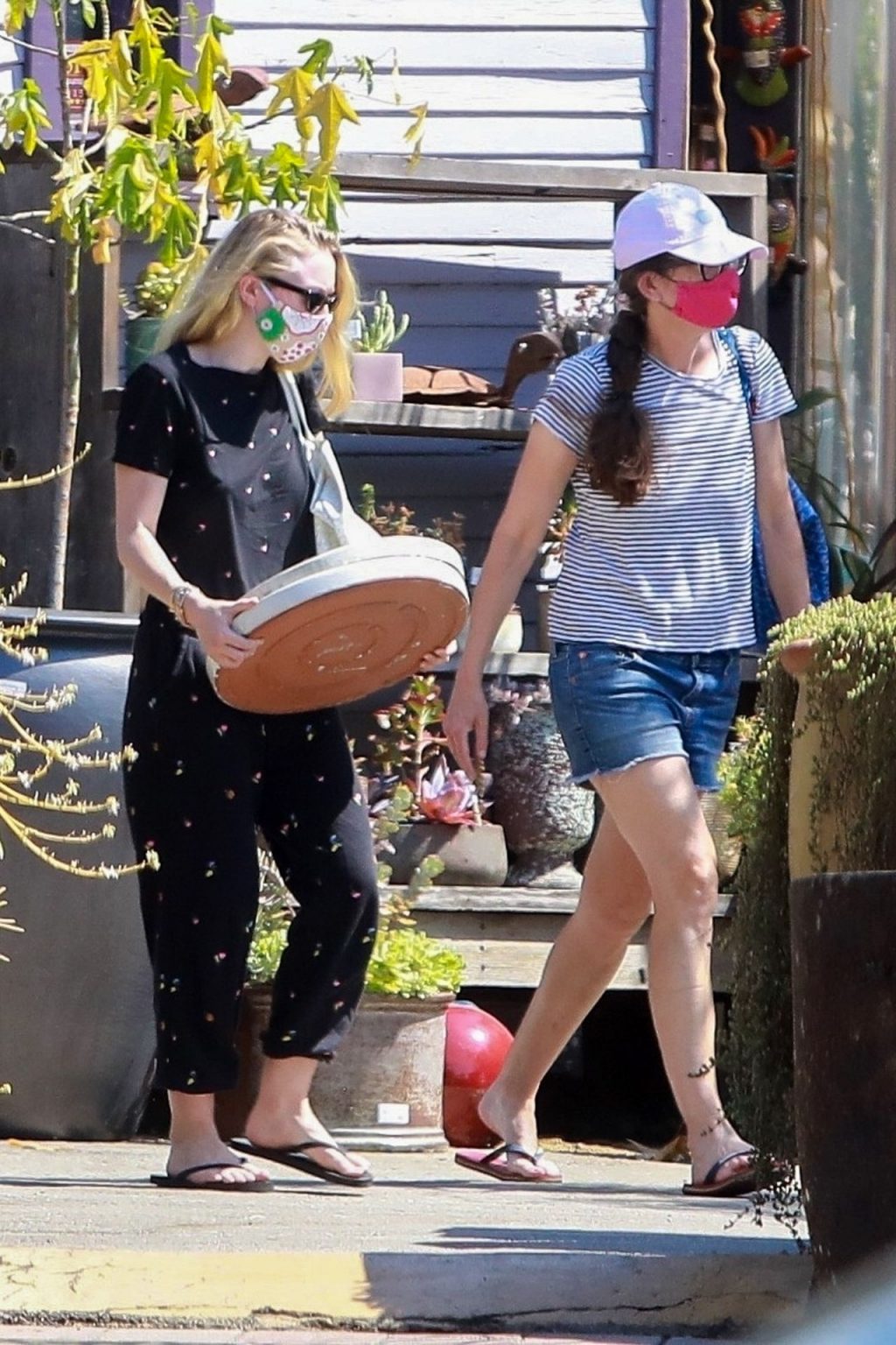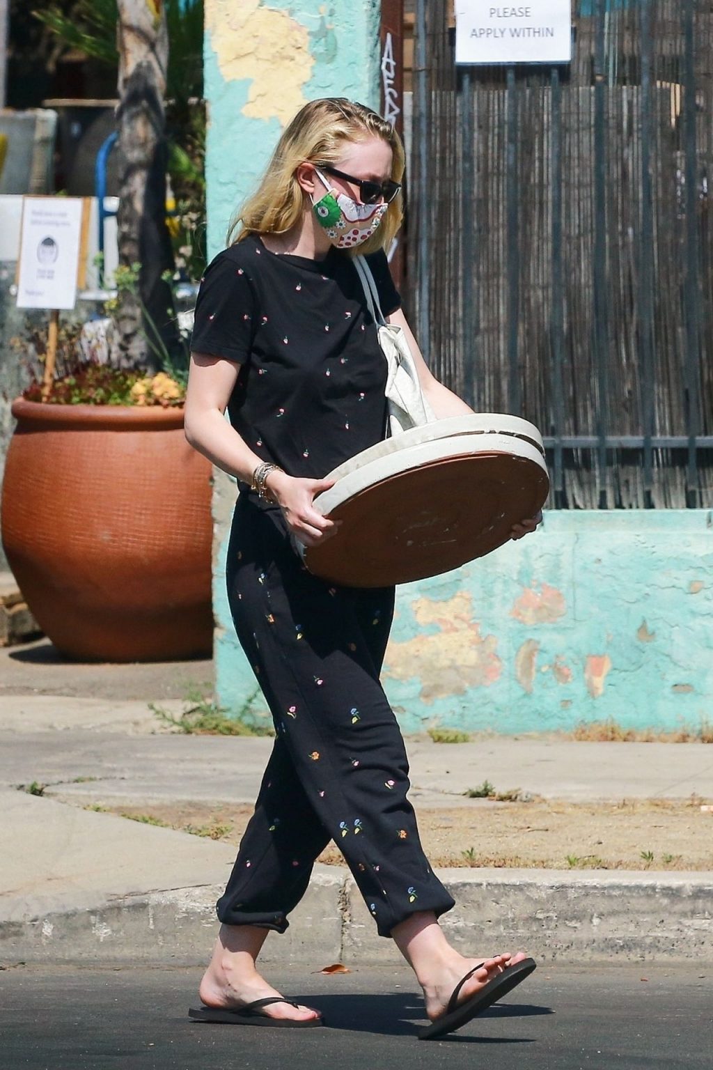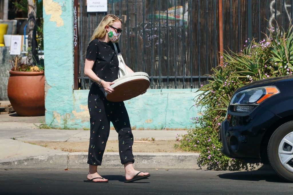 Sans soutien-gorge, Dakota Fanning transporte quelques objets lourds jusqu’à sa voiture alors qu’elle s’arrête dans une pépinière à Los Angeles pendant qu’elle fait du shopping avec sa mère, portant un masque et une tenue noire décontractée, 06/04/2020.