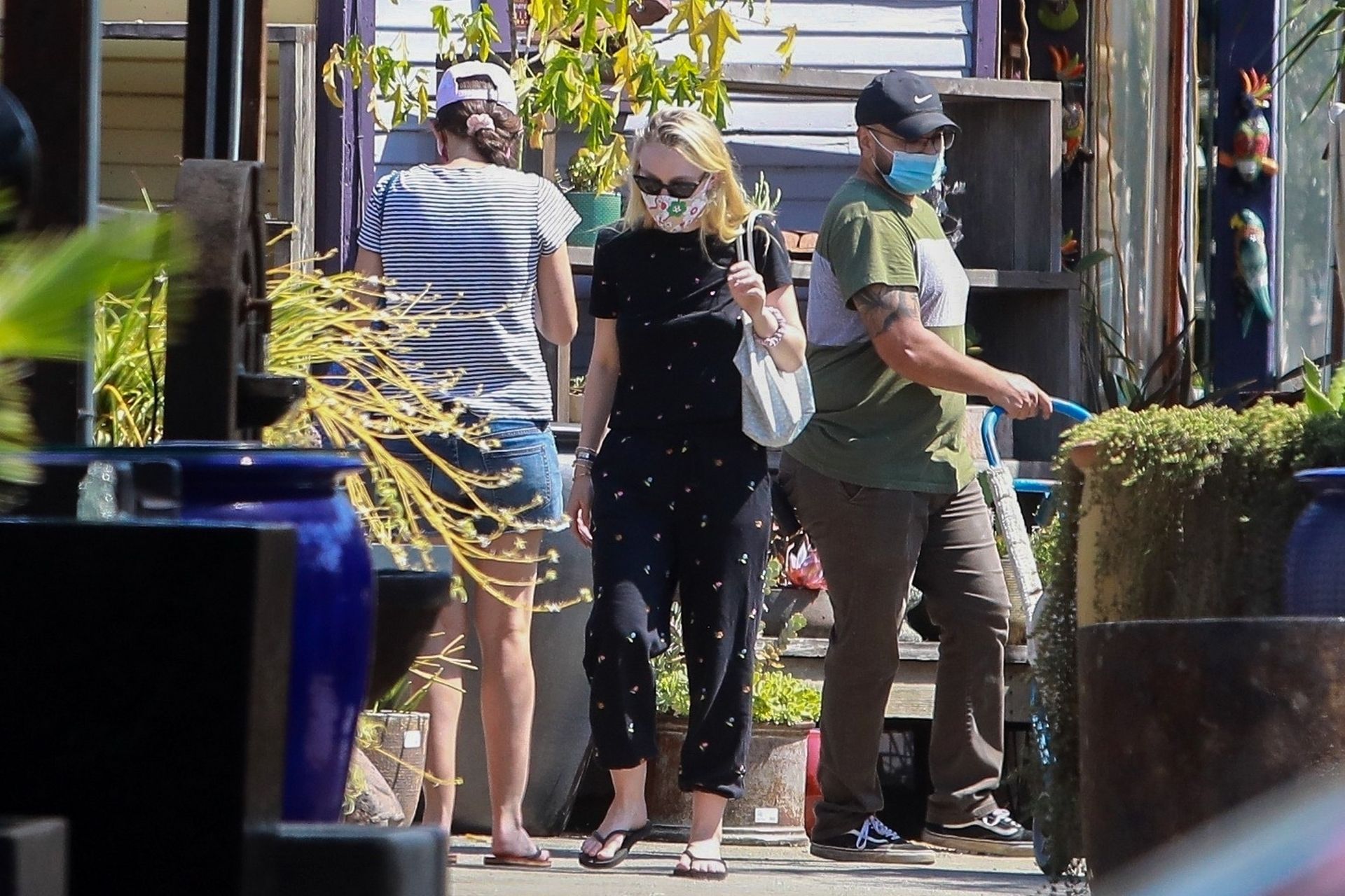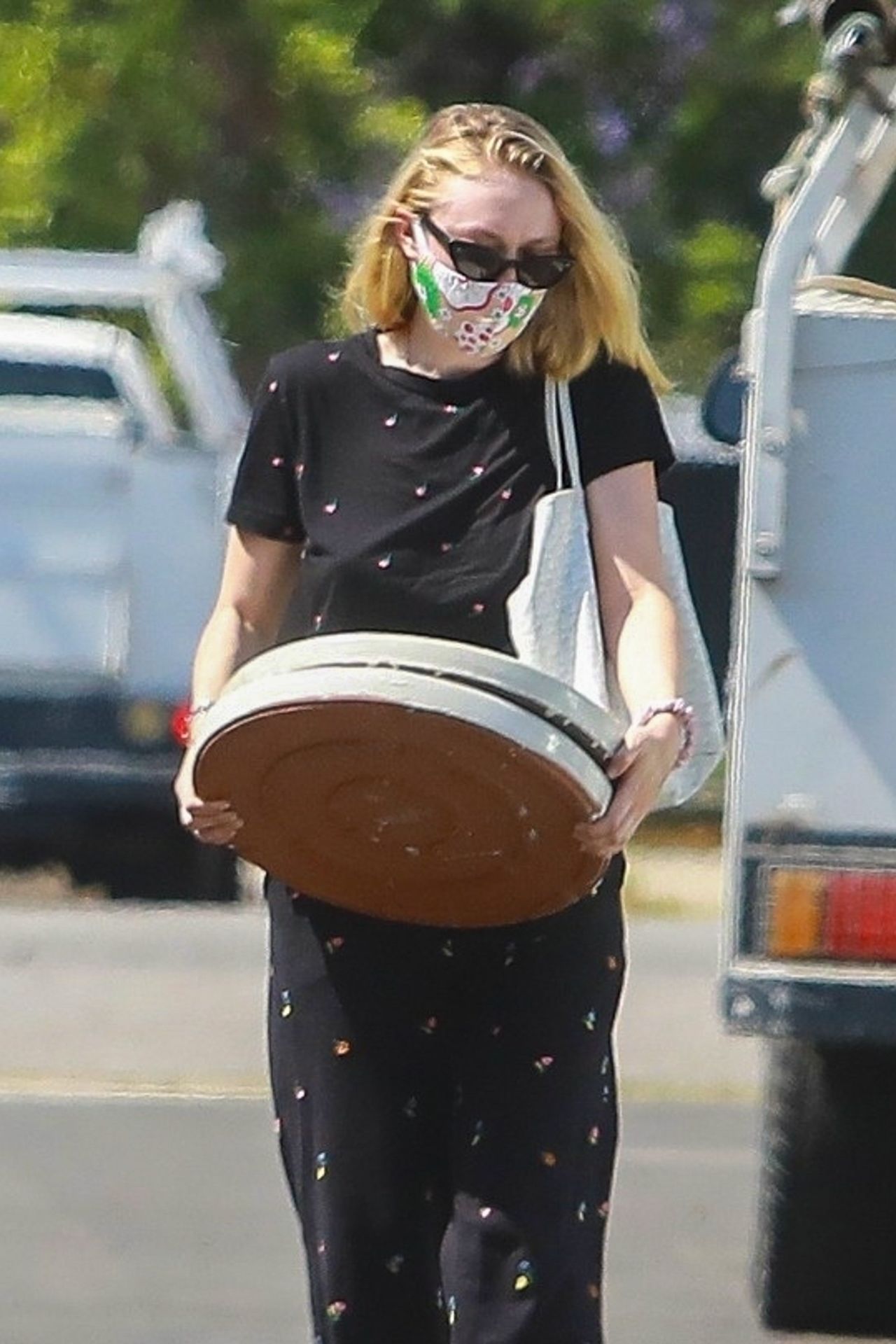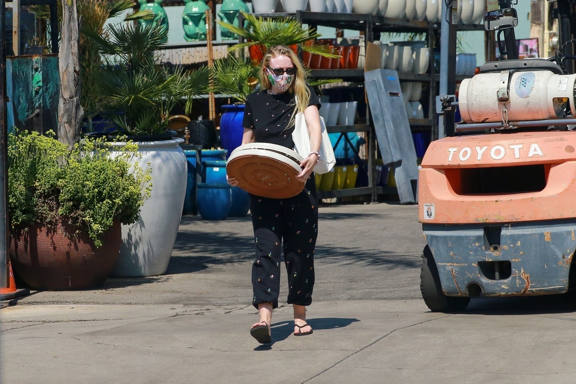 Sans soutien-gorge, Dakota Fanning transporte quelques objets lourds jusqu’à sa voiture alors qu’elle s’arrête dans une pépinière à Los Angeles pendant qu’elle fait du shopping avec sa mère, portant un masque et une tenue noire décontractée, 06/04/2020.