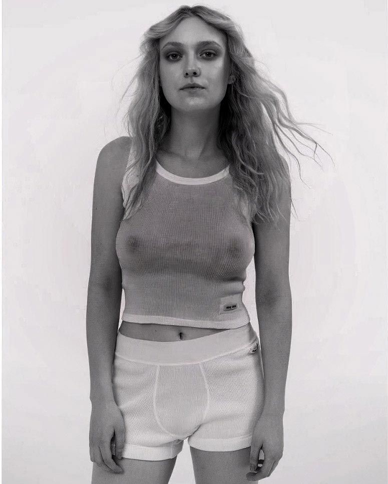 Cette fille refuse tout simplement de porter un soutien-gorge. Et pas seulement cela, il semble que toute sa garde-robe soit composée de chemises fines et transparentes. Elles exposent entièrement les seins nus de Dakota Fanning et ses tétons durs sous le tissu fin.