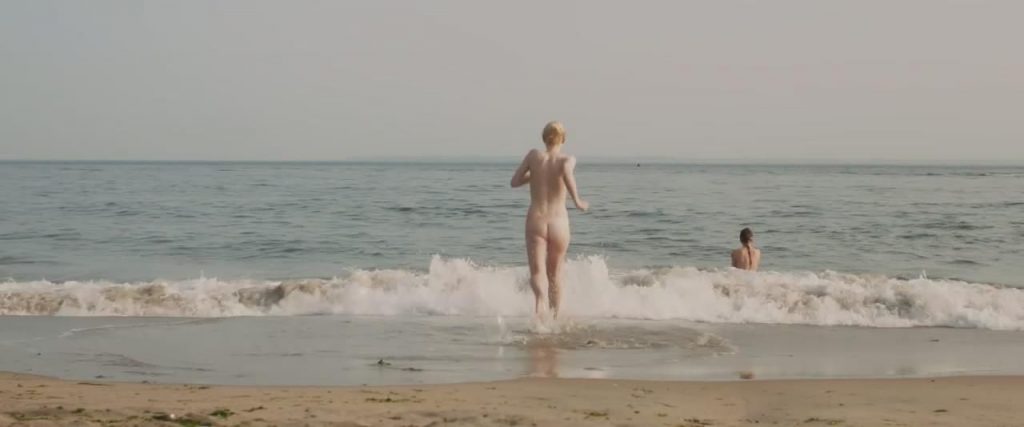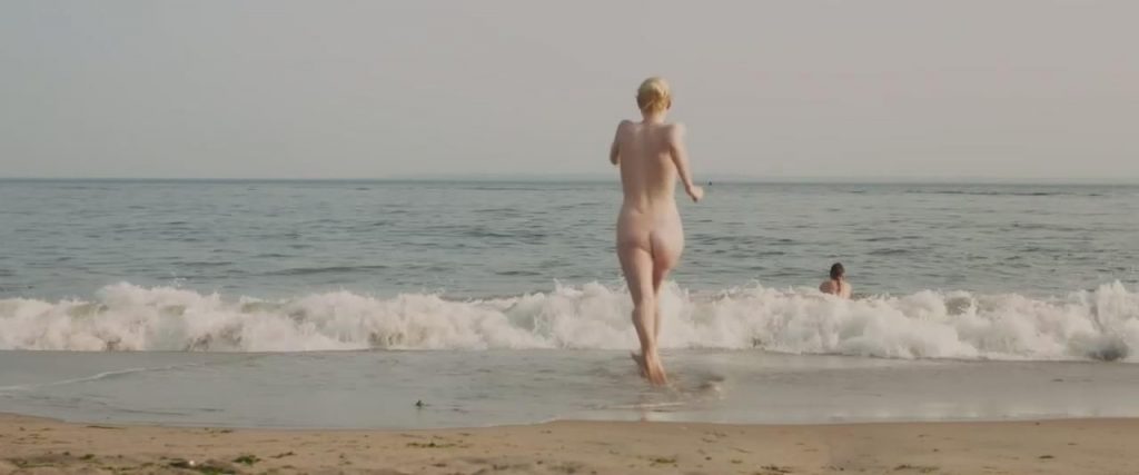 Dakota Fanning et Elizabeth Olsen à la plage où Elizabeth est topless tout en cachant ses seins alors qu’elle encourage Dakota à se dénuder pour une baignade nue. Une scène de Very Good Girls.