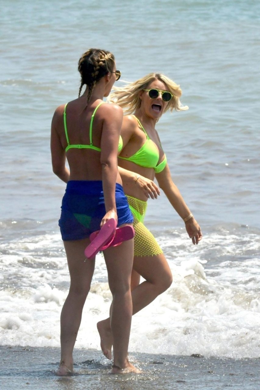 Les deux dames étaient magnifiques, exhibant leurs corps sensuels avec leurs petits bikinis assortis vert citron alors qu’elles se dirigeaient vers la mer pour une baignade.