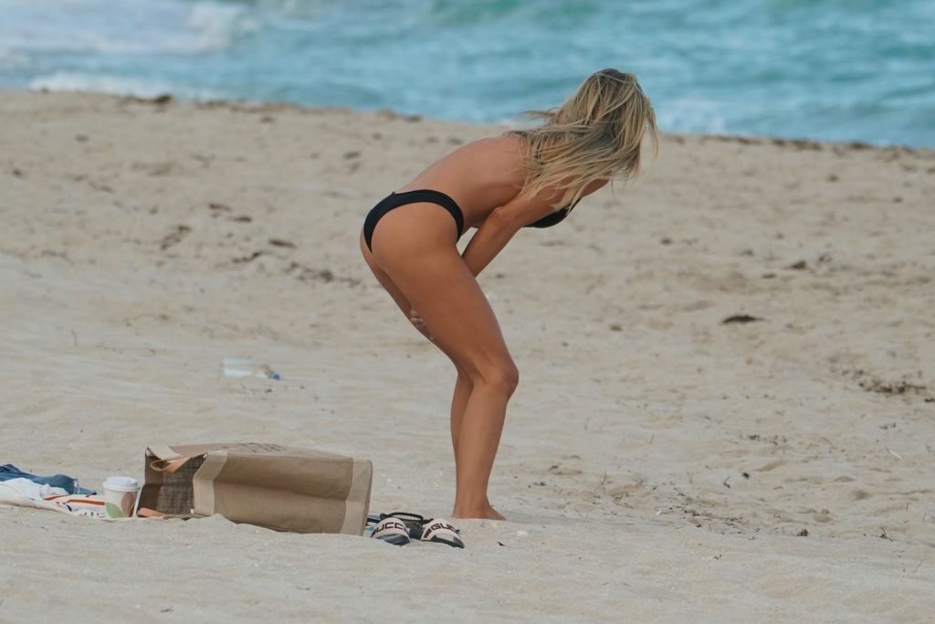 Le mannequin canadien Danielle Knudson a été vue en bikini string noir avec son amie, la beauté germano-croate Jelena Cikoja, à la plage de Miami Beach, le 12/08/2018.
