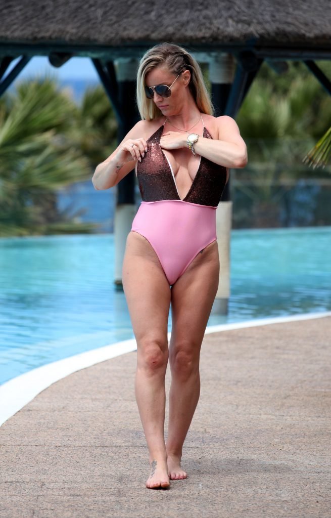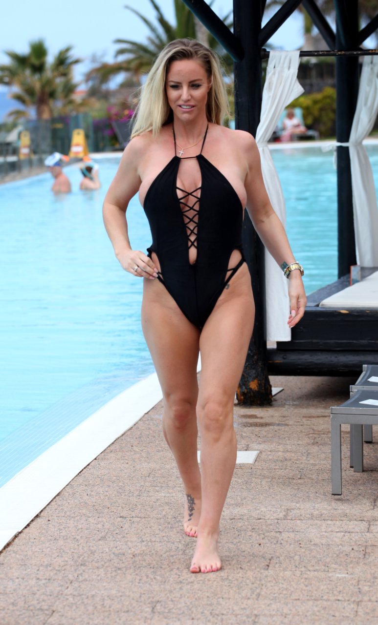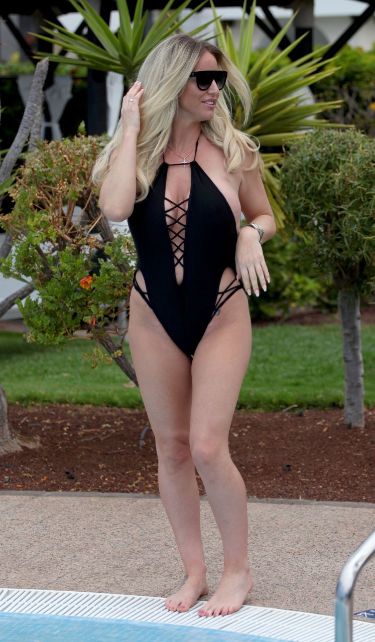 Danielle Mason montre les résultats de sa récente perte de poids, alors qu’elle lutte avec son maillot de bain en prenant un bain de soleil en Espagne, 01/05/2018. La mannequin glamour, actrice et présentatrice TV Danielle a eu du mal à contenir ses atouts en laissant entrevoir un téton en ajustant son maillot de bain.