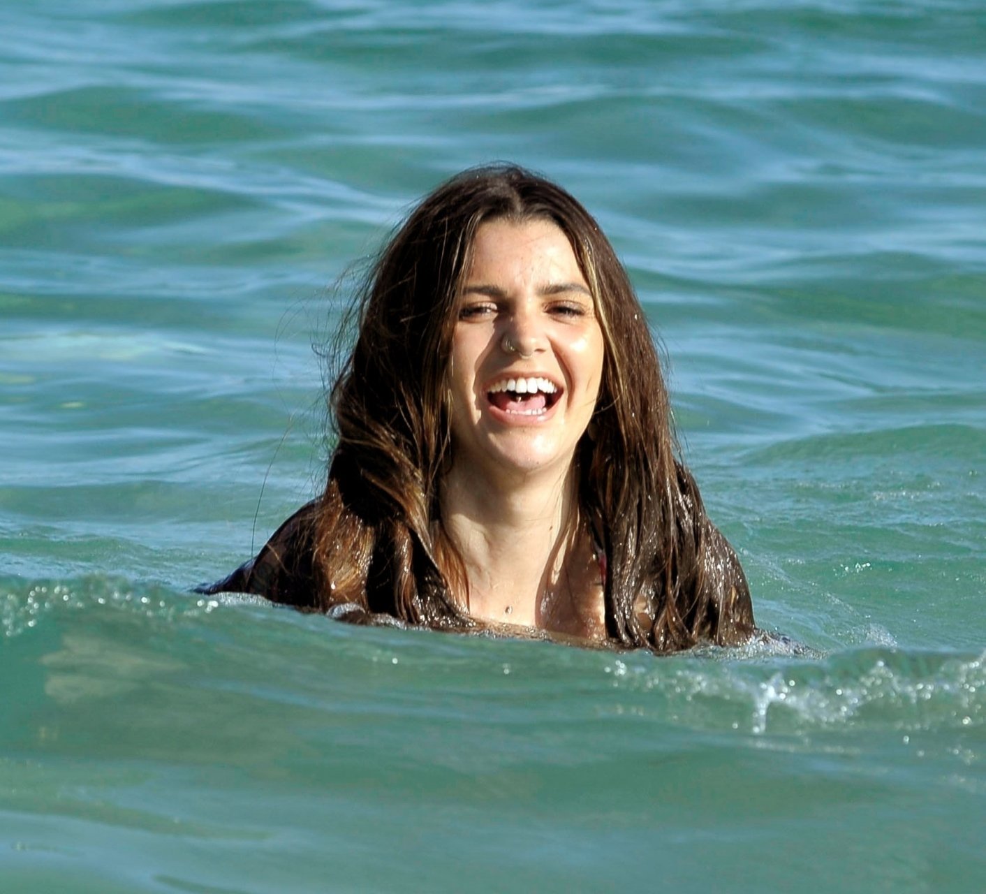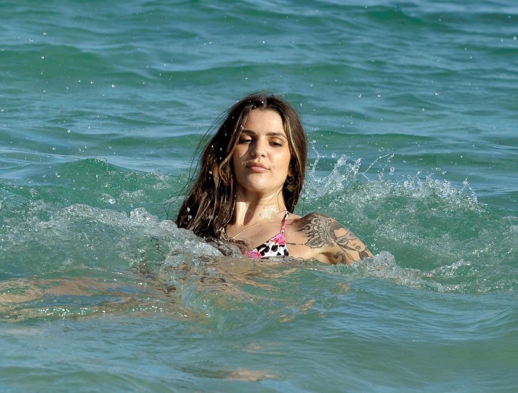La star de Love Island 2018, la belle tatouée Darylle Sargeant (24 ans), semble heureuse et satisfaite de la vie alors qu’elle s’amuse seule dans la mer lors d’une escapade en Espagne, vêtue d’un bikini fleuri coloré noir, blanc et rose, 26/10/2018.
