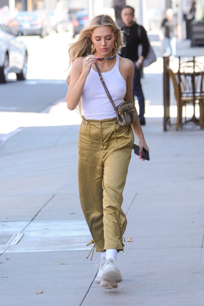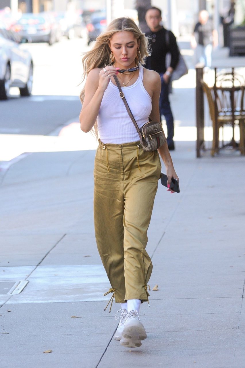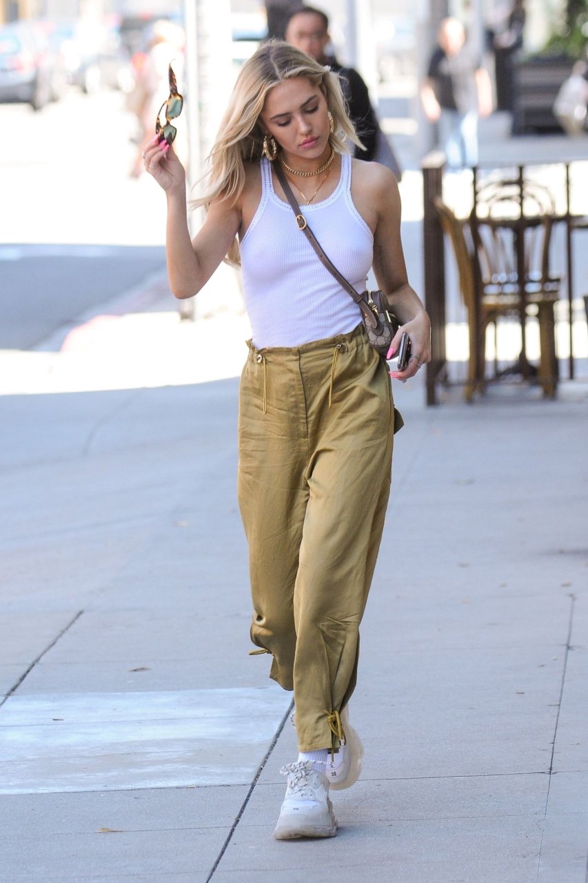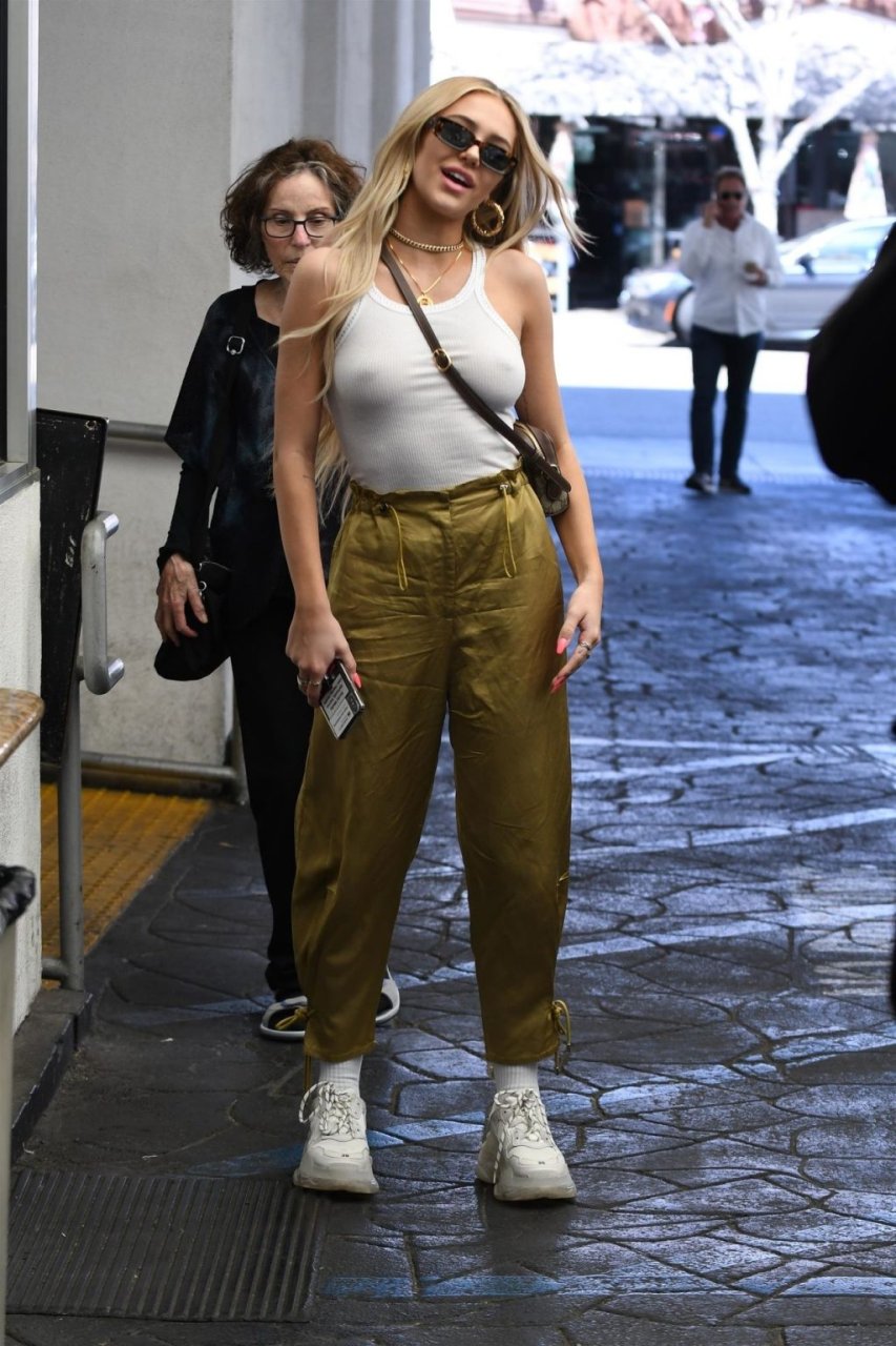 Delilah Hamlin visite un salon de soins de la peau et déjeune chez E Baldiin à Beverly Hills, le 18/04/2019. La star américaine des réseaux sociaux de 20 ans portait un t-shirt blanc sans soutien-gorge. Elle est membre VIP du club No Bra !