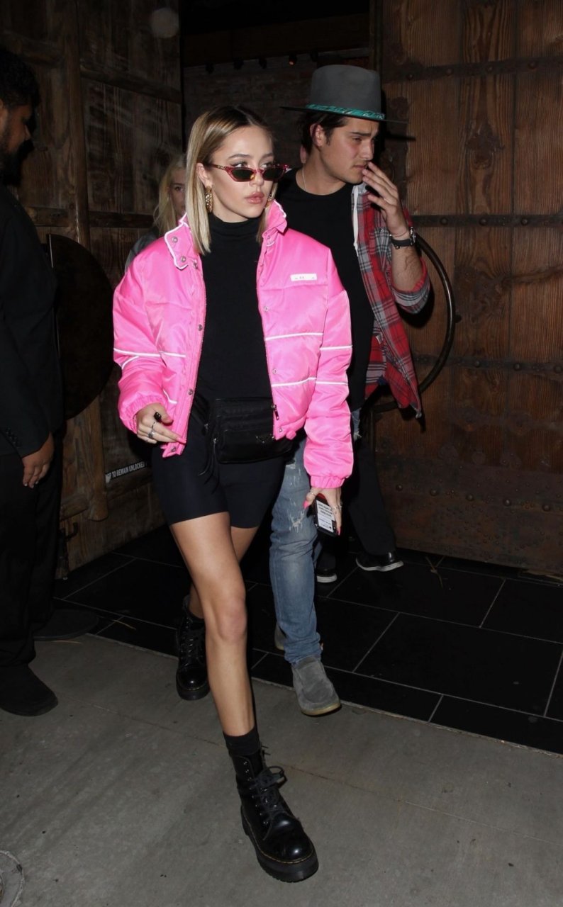 Model Delilah Belle Hamlin ne laisse que peu de place à l’imagination lors de la soirée de lancement de l’application “Twenty” à Hollywood, le 09/04/2019. Delilah met en valeur sa silhouette avec une veste rose vif matelassée, un haut noir, un short de cycliste noir transparent et des bottes noires.
