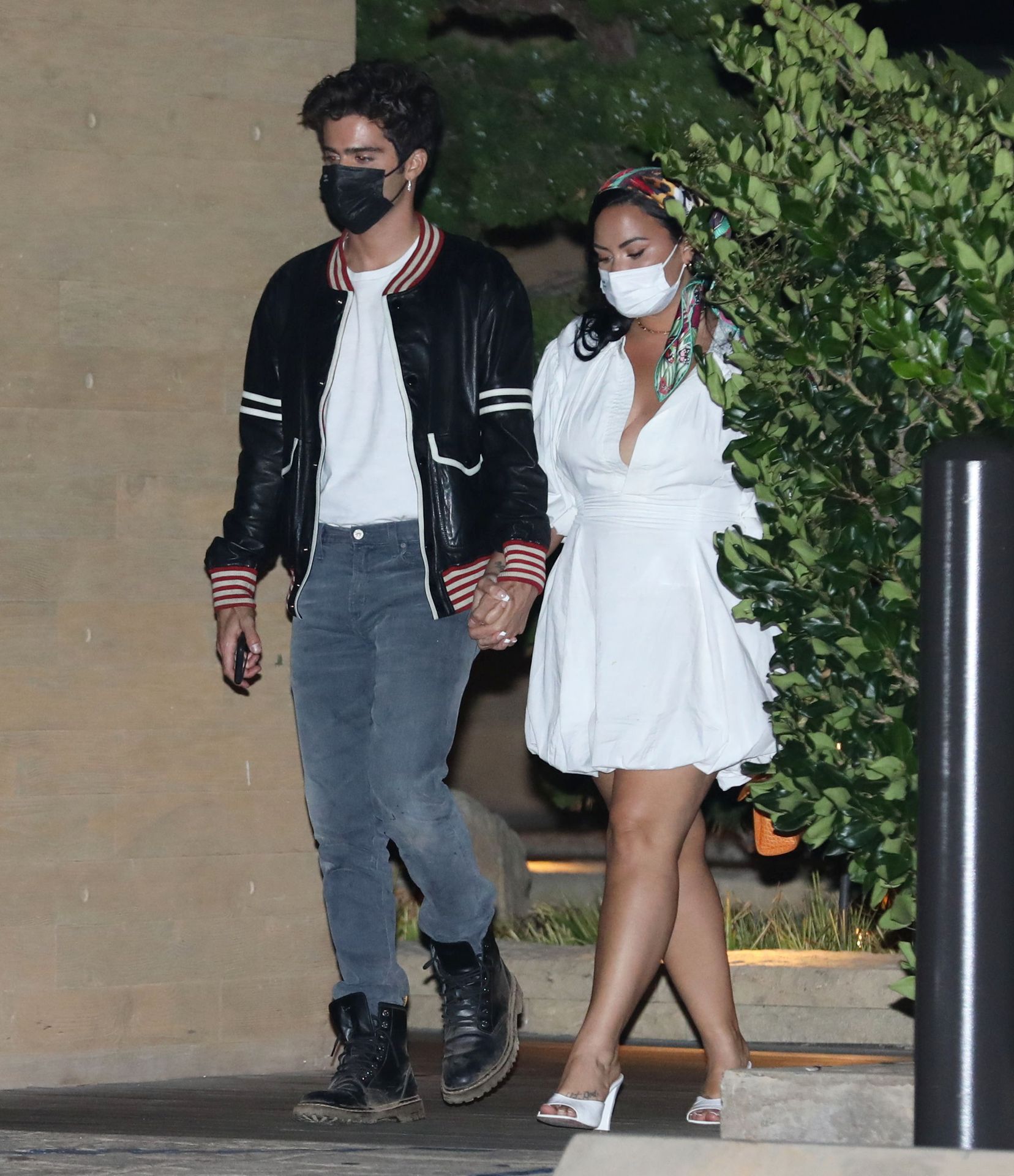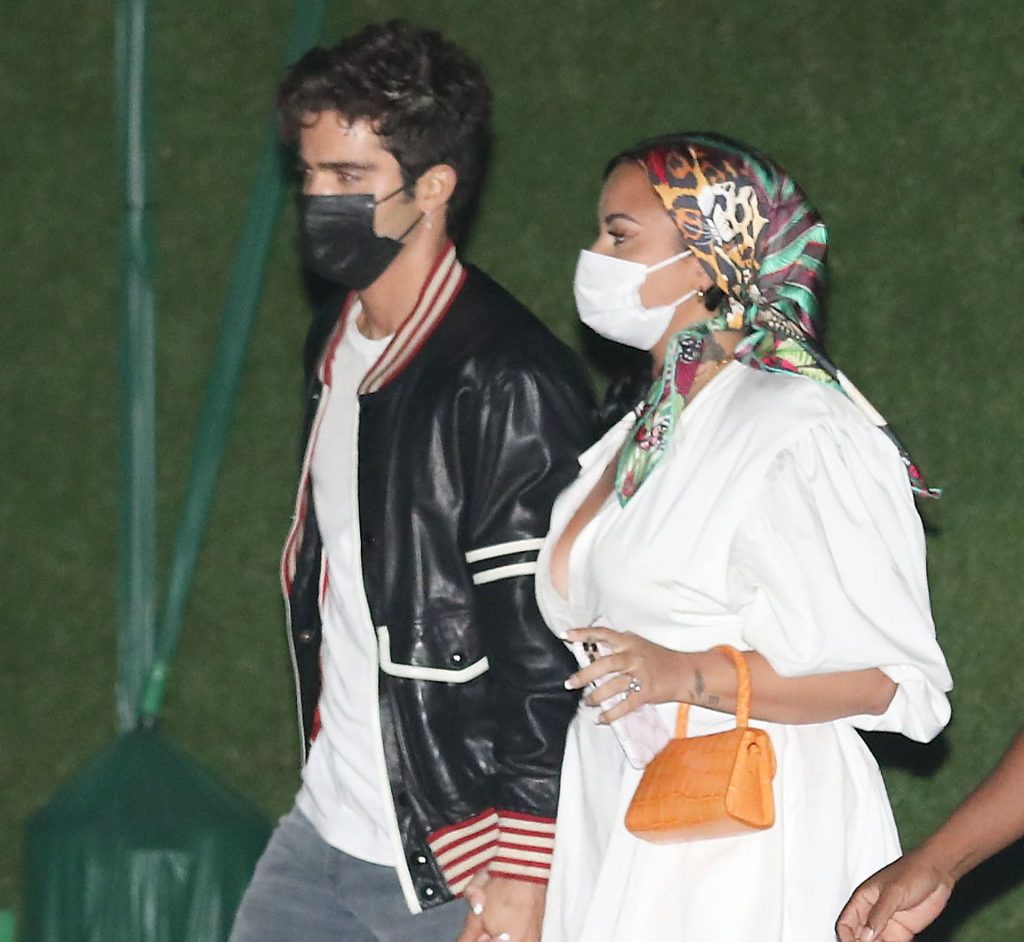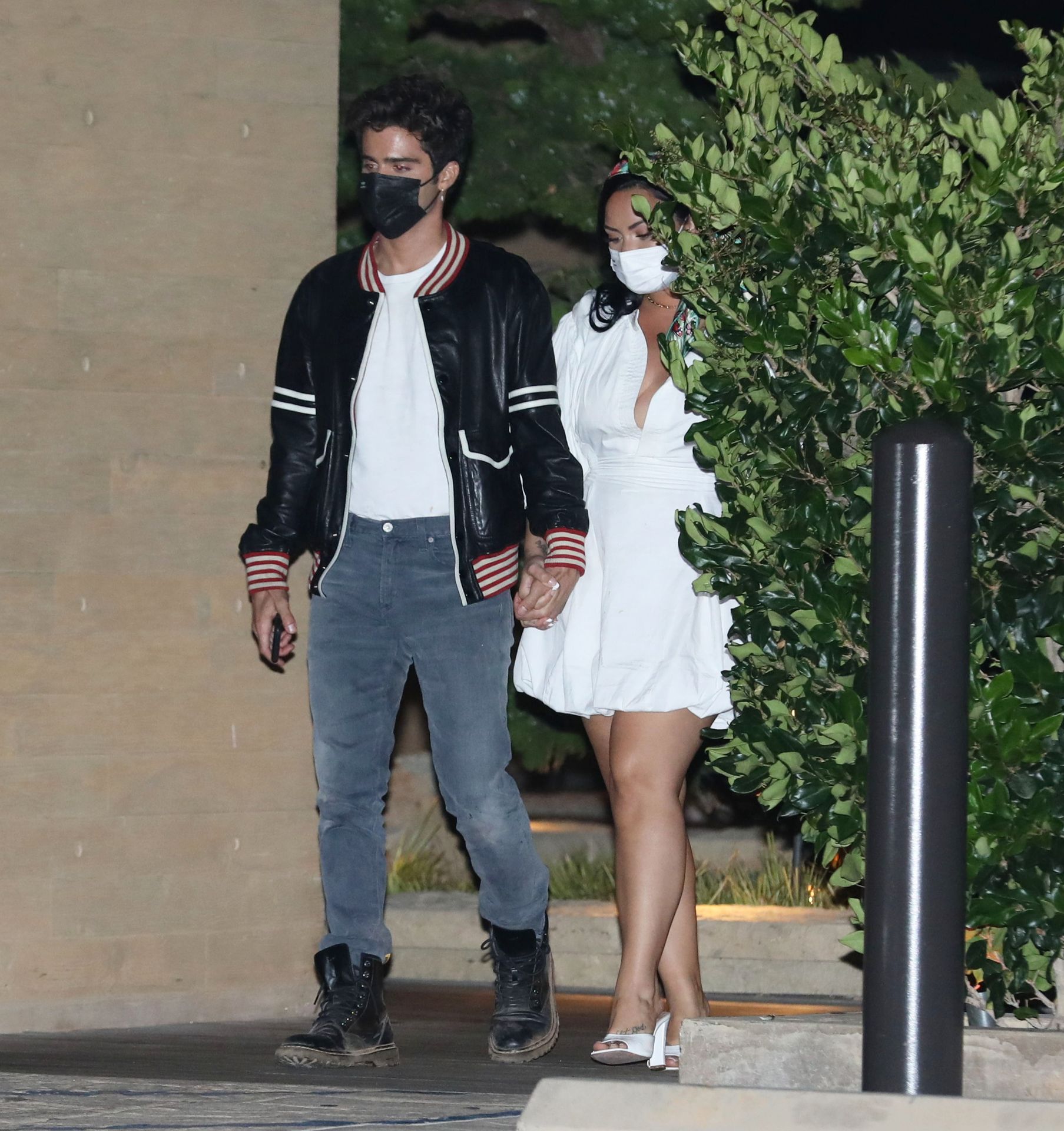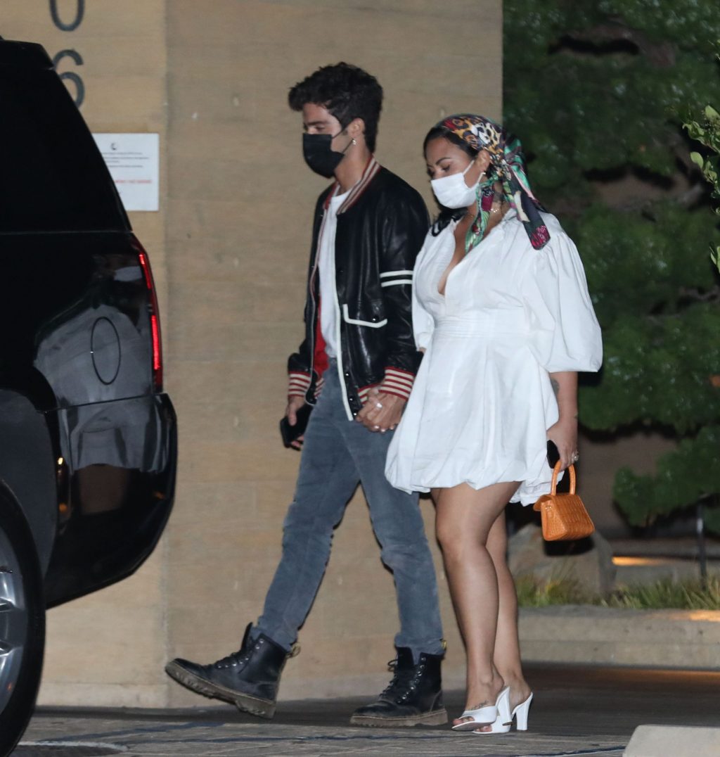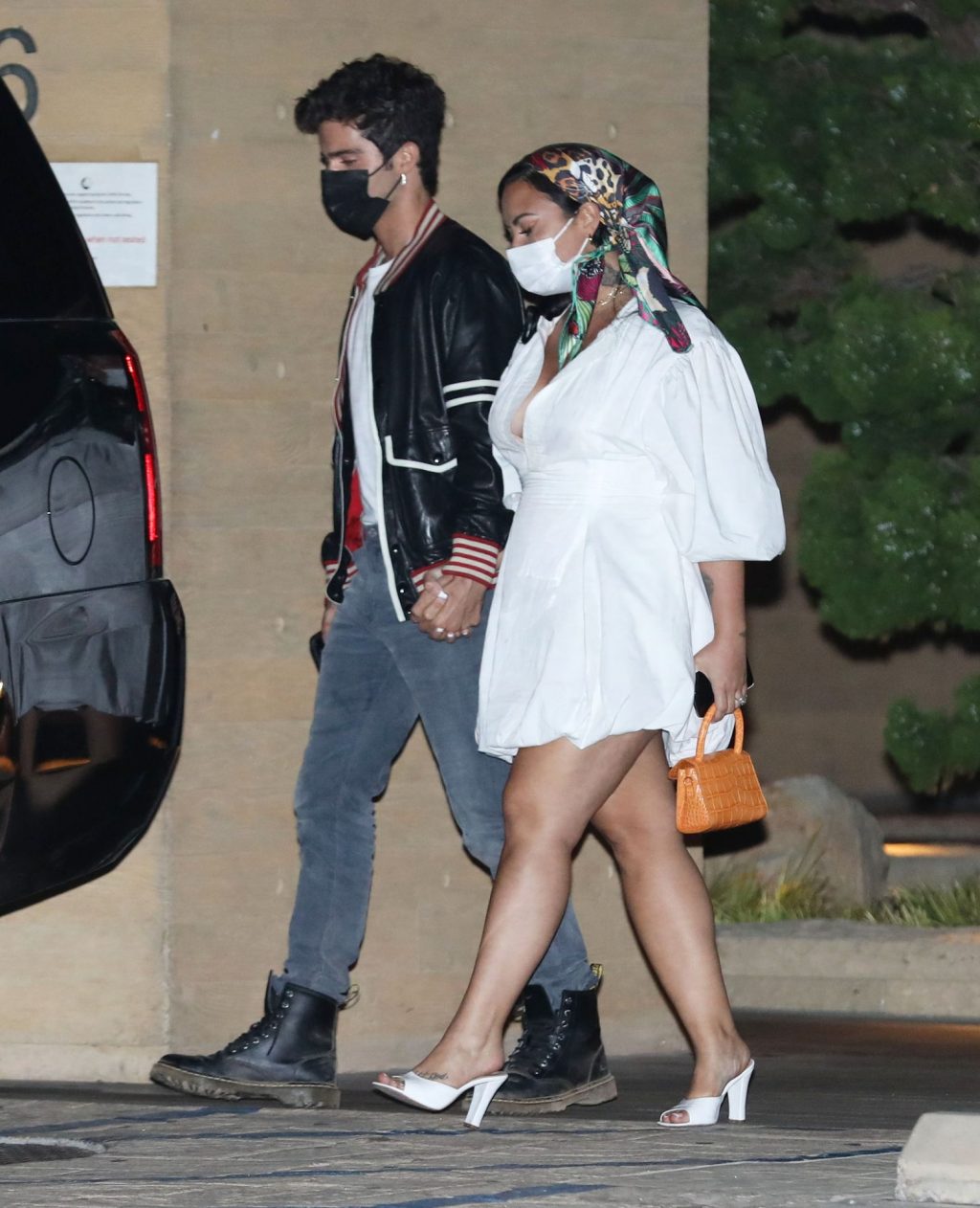 La chanteuse Demi Lovato et son fiancé Max Ehrich se tiennent la main alors qu’ils arrivent pour un dîner tardif au Nobu à Malibu, le 29/08/2020.