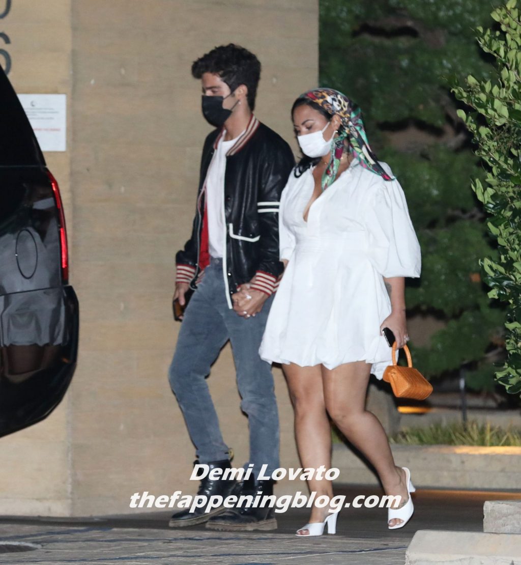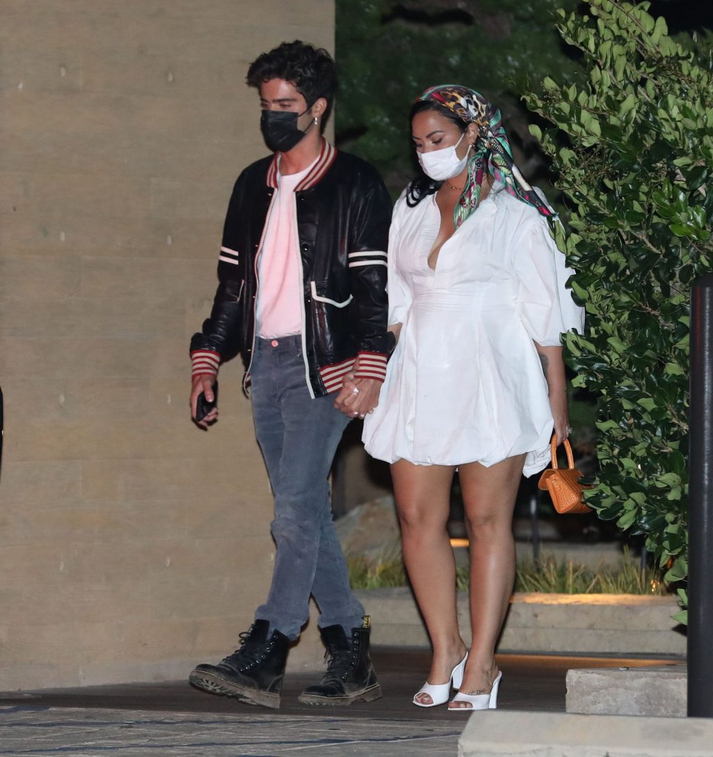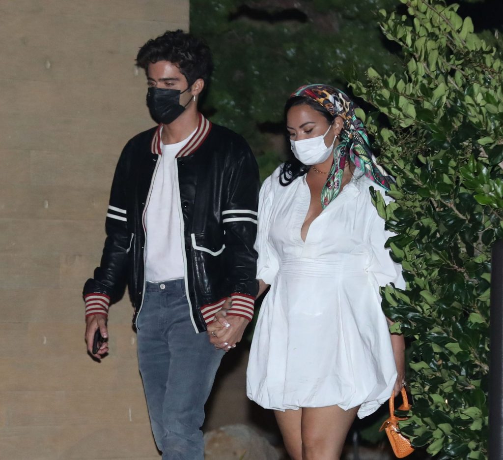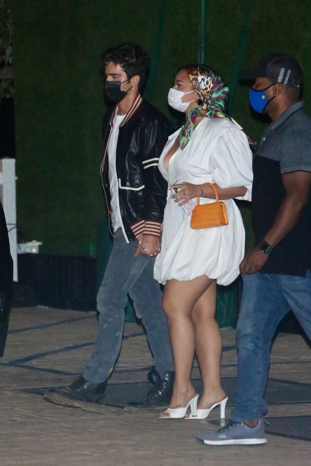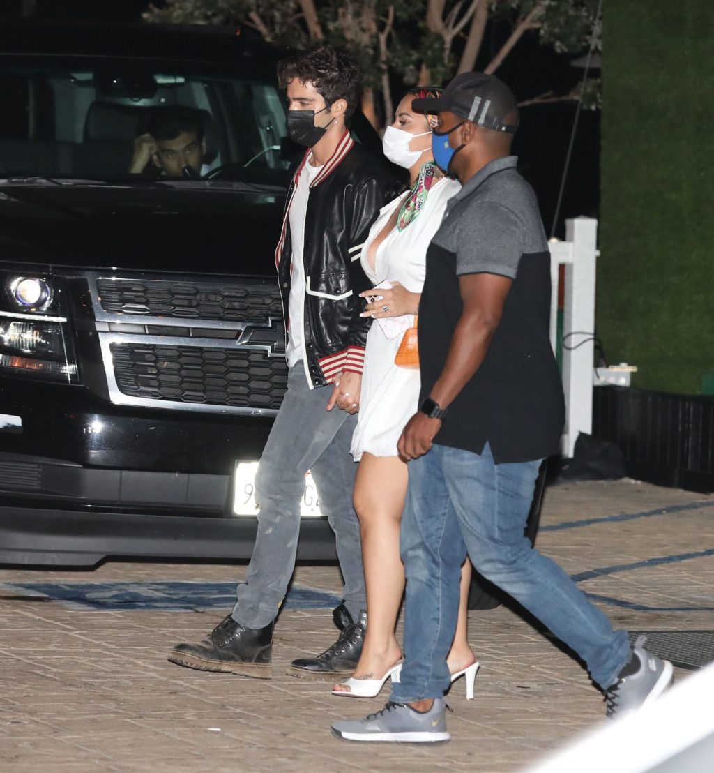 La chanteuse Demi Lovato et son fiancé Max Ehrich se tiennent la main alors qu’ils arrivent pour un dîner tardif au Nobu à Malibu, le 29/08/2020.